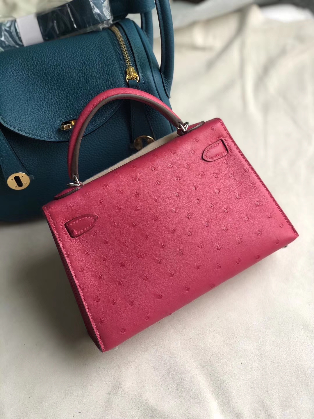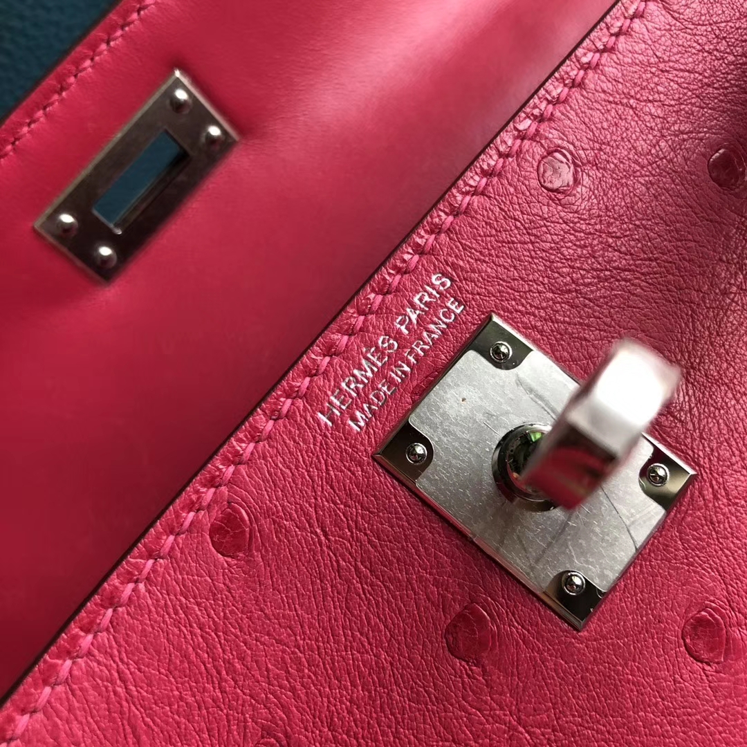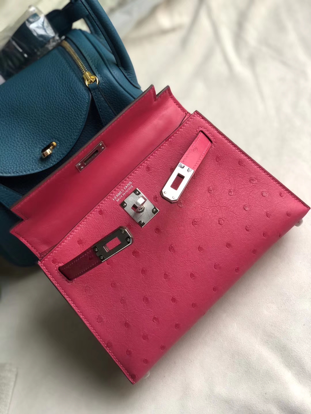 Hermès(爱马仕)Minikelly ll Ostrich kk鸵鸟 5j 桃红 银扣 顶级手缝 现货 2020年3月31日 0 【鳄鱼世家】www.Eyubao.com Mini Kelly 2 Mini Kelly 迷你凯莉 Ostrich 鸵鸟皮 皮料 品牌:Hermès(爱马仕);类别:Mini Kelly迷你凯莉包;颜色:桃红;材质:顶级鸵鸟皮;等级:顶级;附件:全套包装礼盒;尺寸:19cm;功能:手提单肩包
