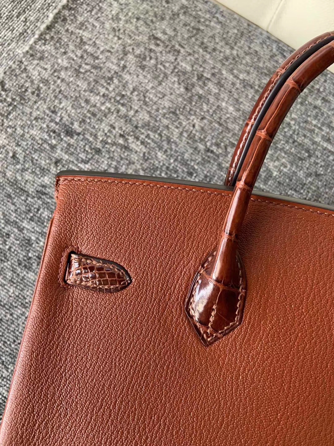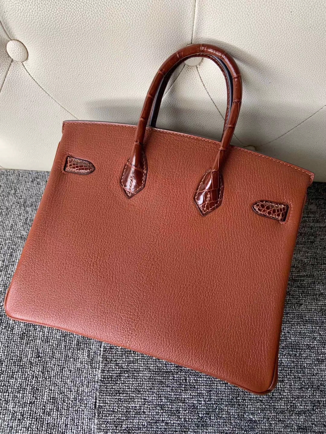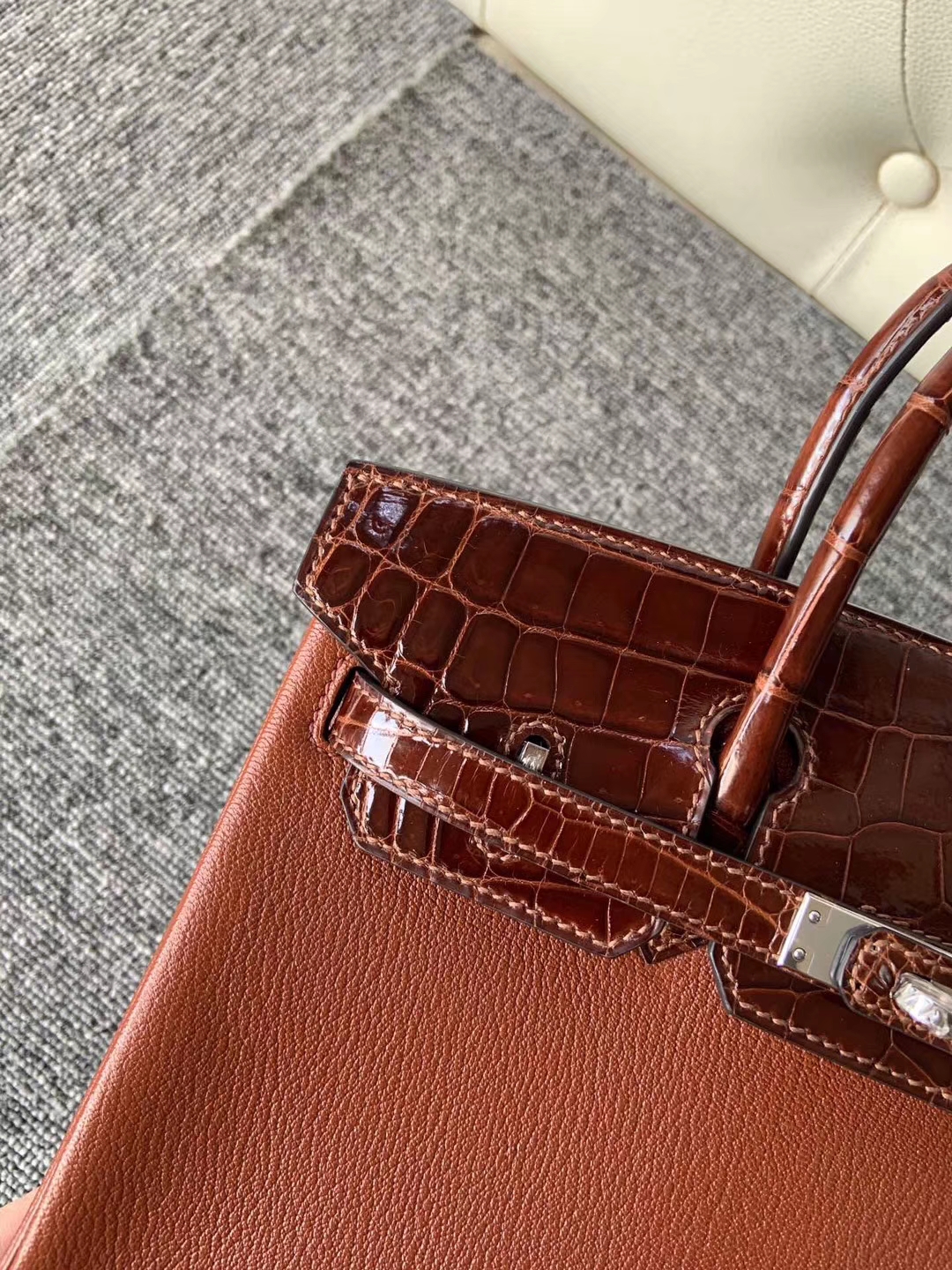 Hermès(爱马仕)Touch 系列 Birkin 25cm 山羊皮 ck31 蜜糖棕 拼鳄鱼蜜糖棕 银扣 2020年4月8日 0 【鳄鱼世家】www.Eyubao.com Birkin 25 Birkin 铂金包 Niloticus 尼罗鳄 拼色包包 皮料 品牌:Hermès(爱马仕);类别:Birkin 铂金包;颜色:蜜糖棕;材质:山羊皮拼雾面鳄鱼;等级:顶级;附件:全套包装礼盒;尺寸: 25cm;功能:手提单肩包