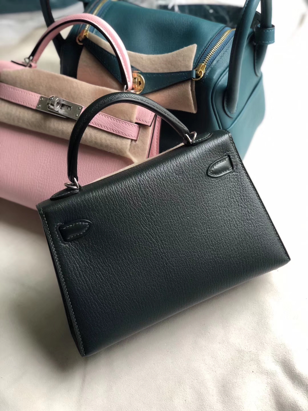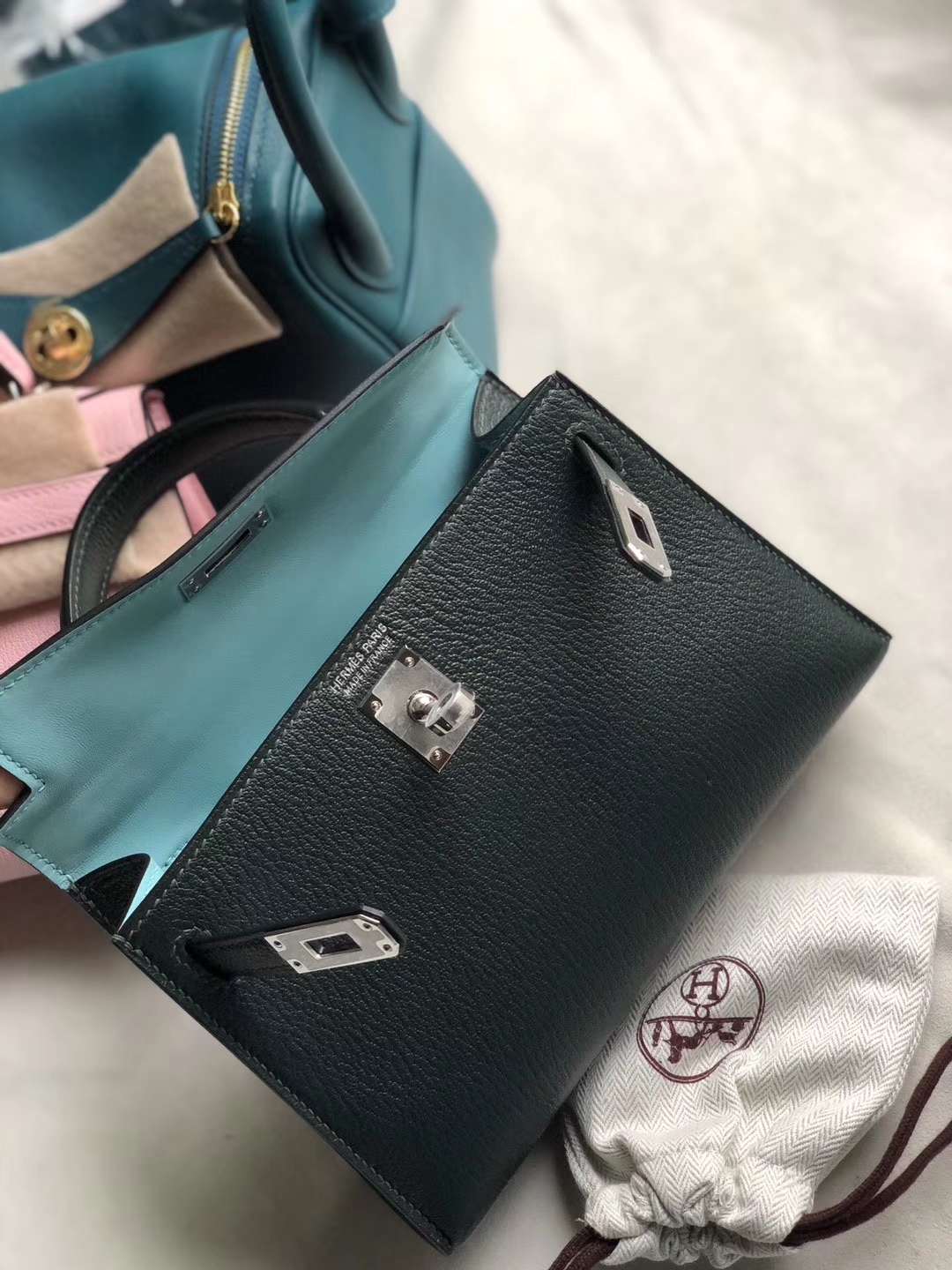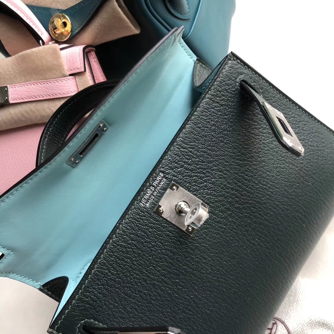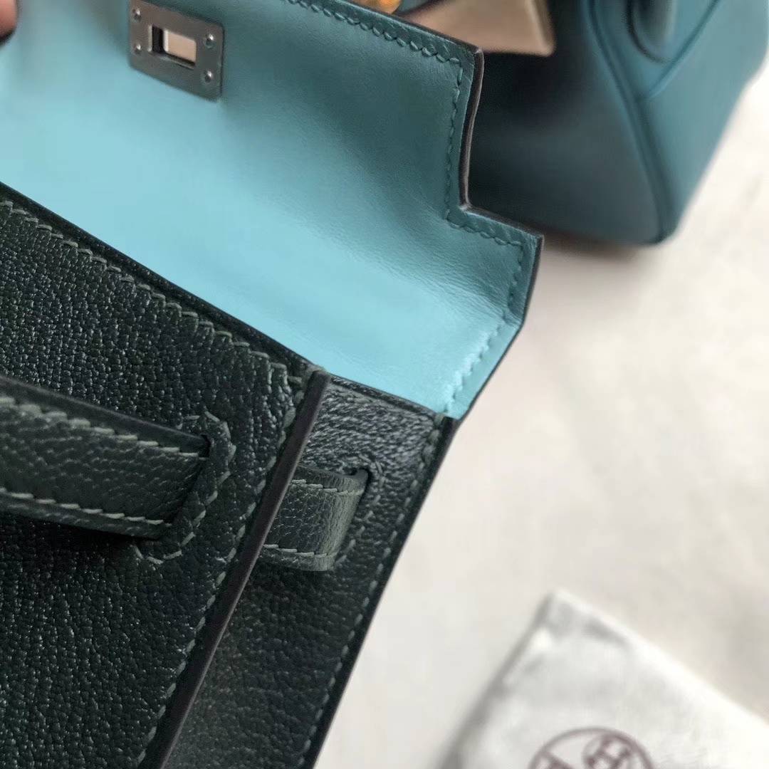 Hermès(爱马仕)Mini Kelly 2 山羊 6o 柏树绿 内拼圣西尔蓝 银扣 定制 2020年4月13日 0 【鳄鱼世家】www.Eyubao.com Mini Kelly 1 Mini Kelly 迷你凯莉 品牌:Hermès(爱马仕);类别:Mini Kelly迷你凯莉包;颜色:柏树绿;材质:原版顶级山羊皮;等级:顶级;附件:全套包装礼盒;尺寸:22cm;功能:手提单肩包