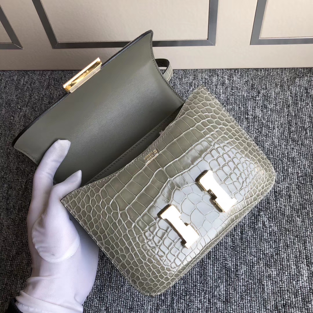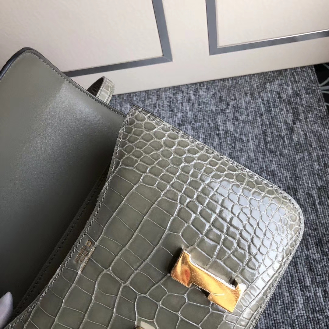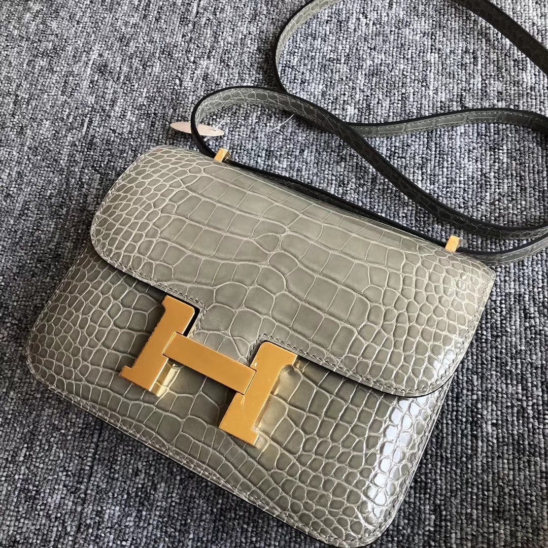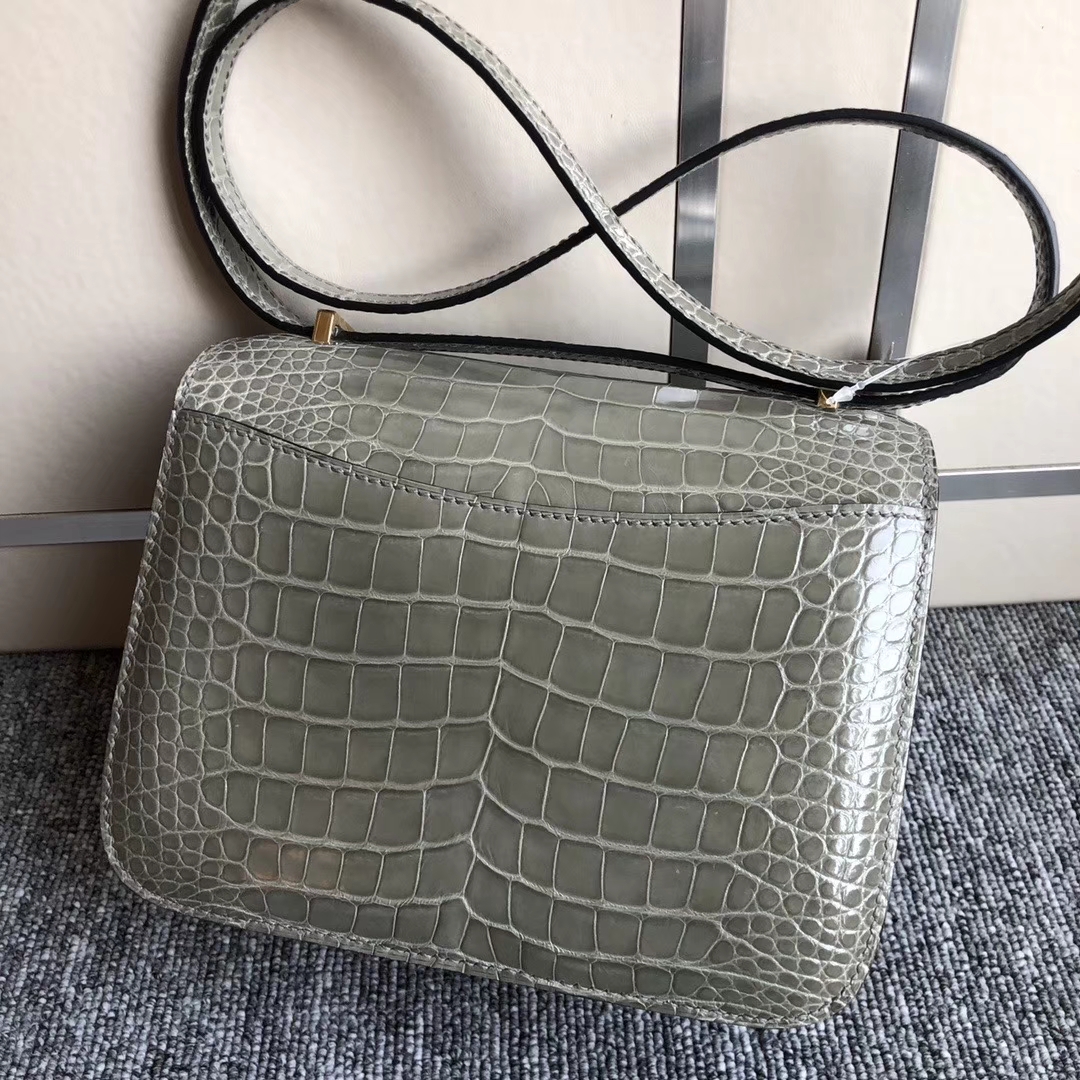 Hermès(爱马仕)Constance 18cm Alligator shiny 亮面鳄鱼 ck81 斑鸠灰 Gris T 金扣 顶级手缝 现货 2020年4月13日 0 【鳄鱼世家】www.Eyubao.com Alligator 美洲鳄 Constance 18 Constance 空姐包 皮料 品牌:Hermès(爱马仕);类别:Constance 空姐包;颜色:斑鸠灰;材质:亮面鳄鱼;等级:顶级;附件:全套包装礼盒;尺寸:18cm;功能:单肩背包