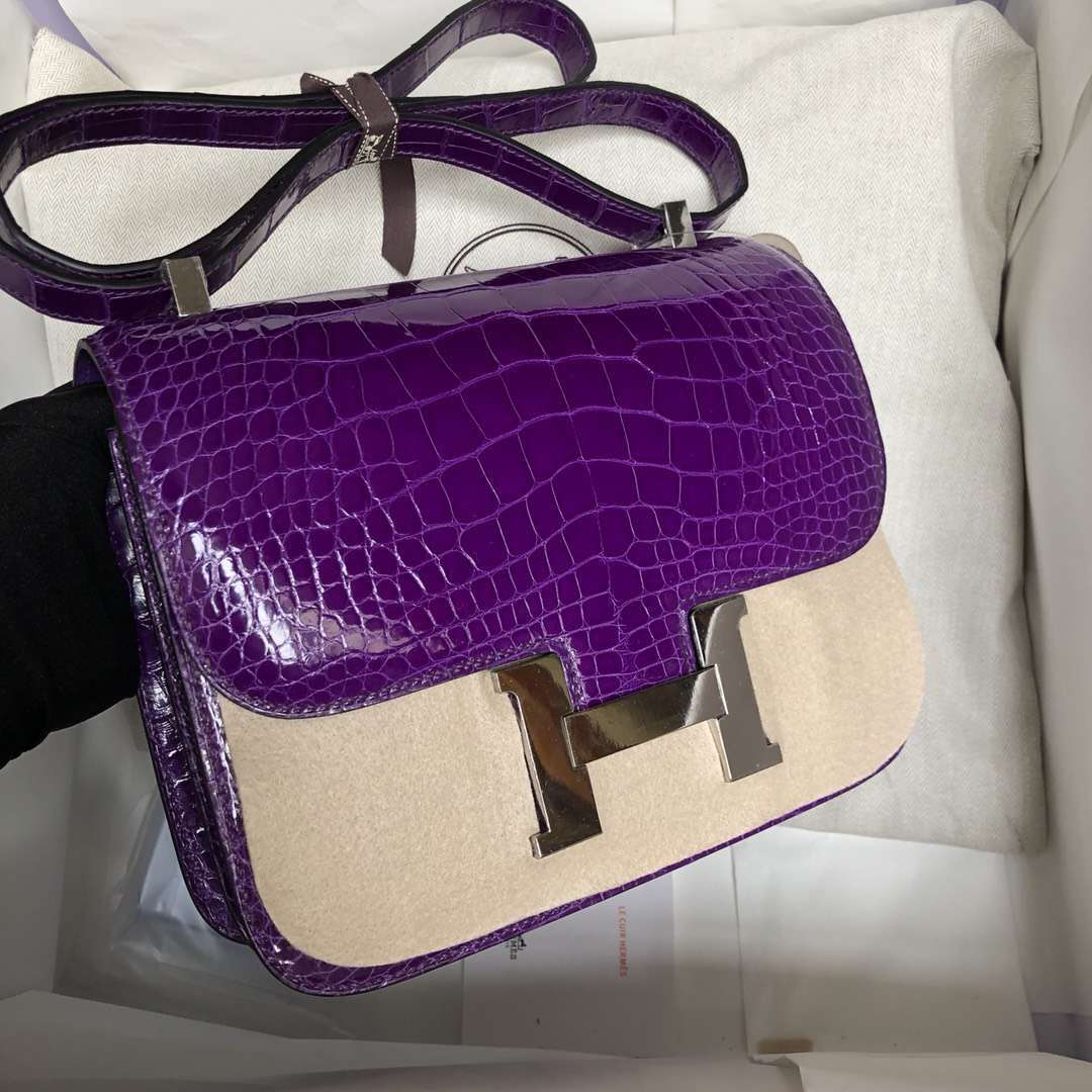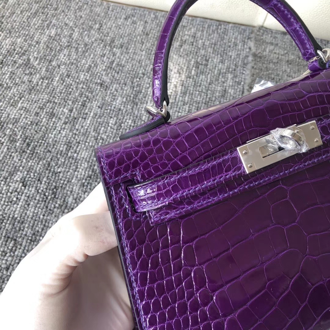品牌:Hermès(爱马仕);类别:Mini Kelly迷你凯莉包;颜色:极度紫;材质:亮面鳄鱼皮;等级:顶级;附件:全套包装礼盒;尺寸:22cm;功能:手提单肩包