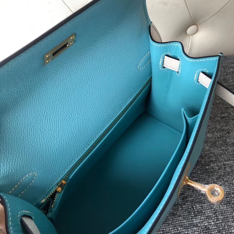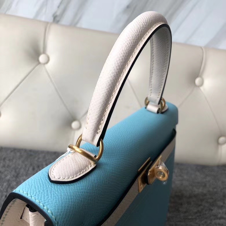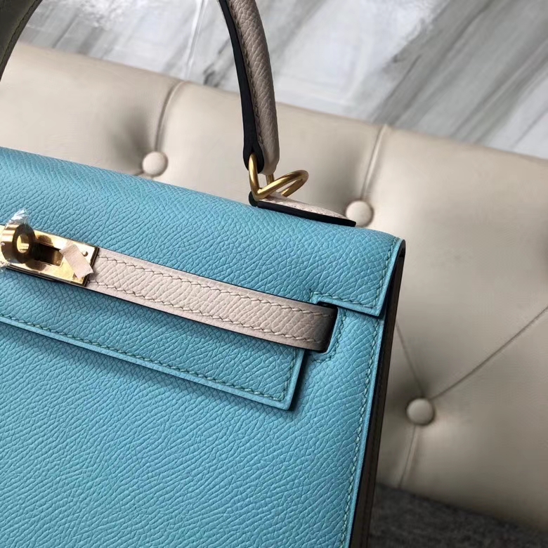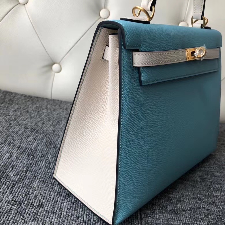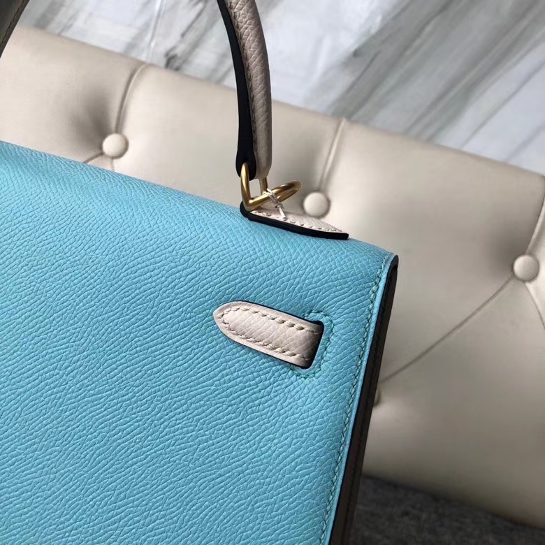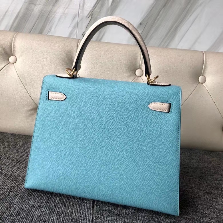 Hermès(爱马仕)Kelly 25cm Eposm 原厂掌纹皮 北方蓝拼奶昔白 金扣 马蹄印 顶级手缝 2020年6月11日 0 【鳄鱼世家】www.Eyubao.com Kelly 25 Kelly 凯莉包 拼色包包 品牌:Hermès(爱马仕);类别:Kelly 凯莉包;颜色:北方蓝拼奶昔白;材质:原厂掌纹皮Eposm;等级:顶级;附件:全套包装礼盒;尺寸:25cm;功能:手提单肩背包