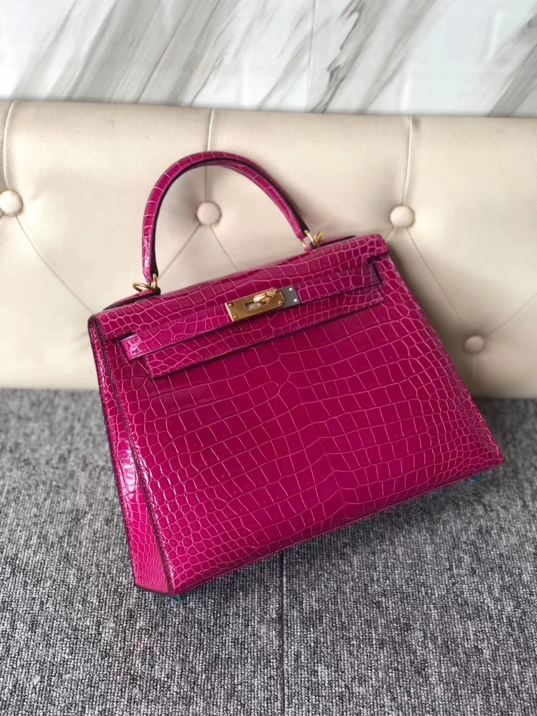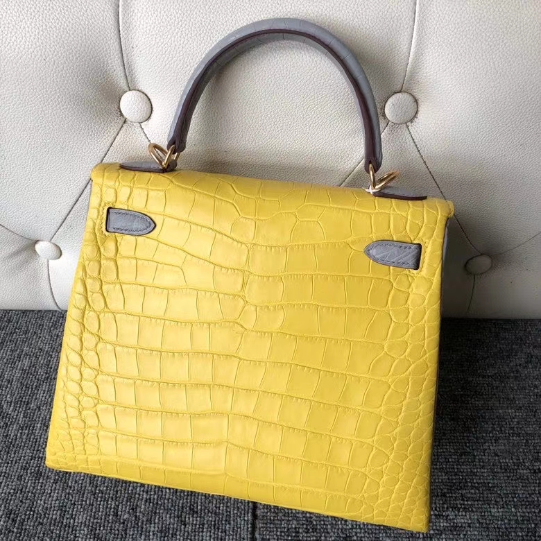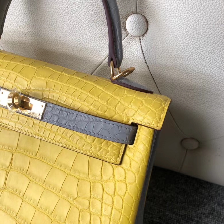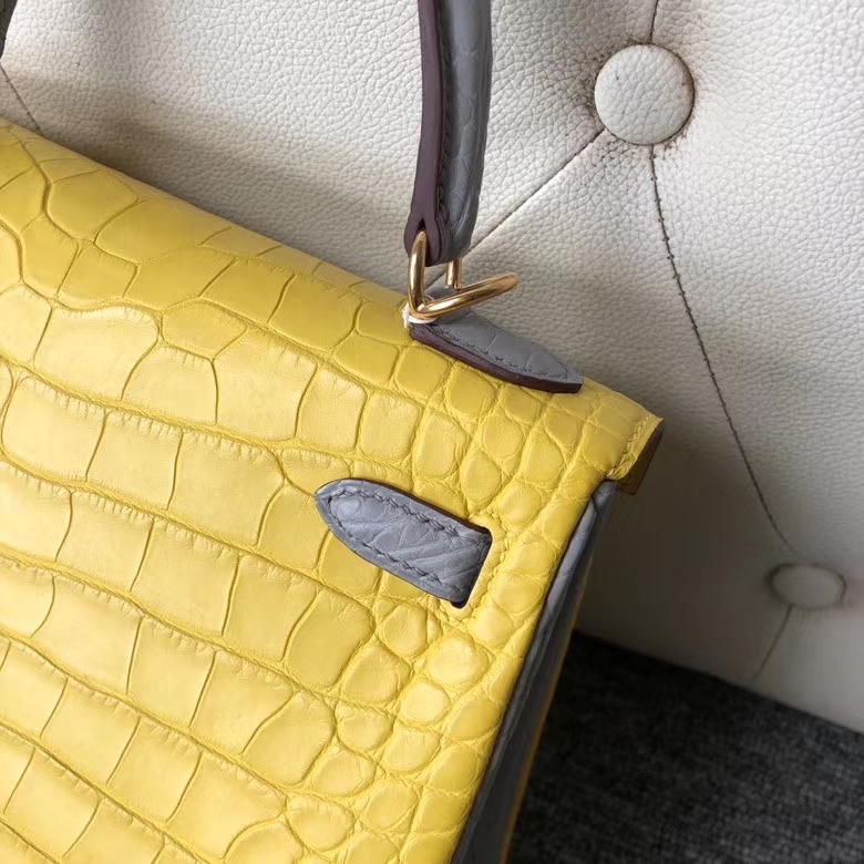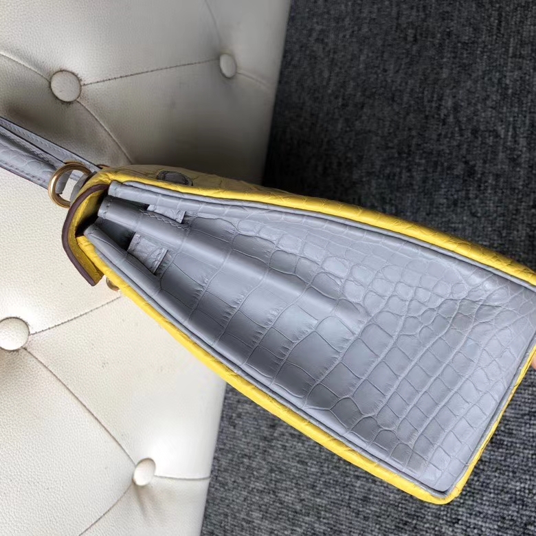 Hermès(爱马仕)kelly 25cm Alligator matt 雾面鳄鱼 M9 冰凝黄拼 4Z 海鸥灰 金扣 马蹄印 2020年6月11日 0 【鳄鱼世家】www.Eyubao.com Kelly 25 Kelly 凯莉包 Niloticus 尼罗鳄 品牌:Hermès(爱马仕);类别:Kelly 凯莉包;颜色:冰凝黄拼 4Z 海鸥灰;材质:雾面鳄鱼;等级:顶级;附件:全套包装礼盒;尺寸:25cm;功能:手提单肩背包