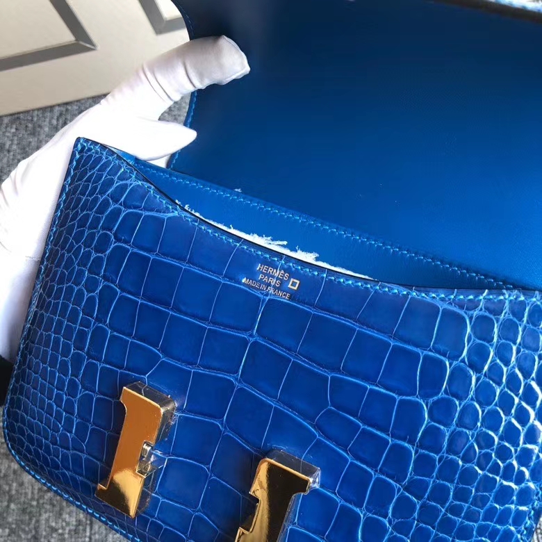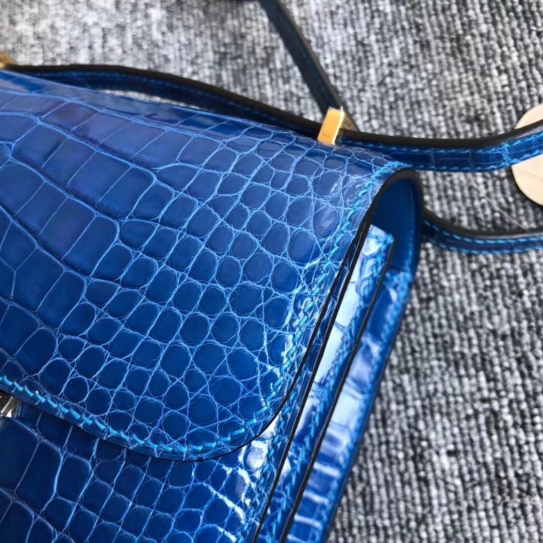 Hermès(爱马仕)Constance 18cm Alligator shiny 亮面鳄鱼 希腊蓝 金扣 顶级手缝 现货 2020年6月11日 0 【鳄鱼世家】www.Eyubao.com Constance 18 Constance 空姐包 Niloticus 尼罗鳄 品牌:Hermès(爱马仕);类别:Constance 空姐包;颜色:希腊蓝;材质:Alligator shiny 亮面鳄鱼;等级:顶级;附件:全套包装礼盒;尺寸:18cm;功能:单肩背包