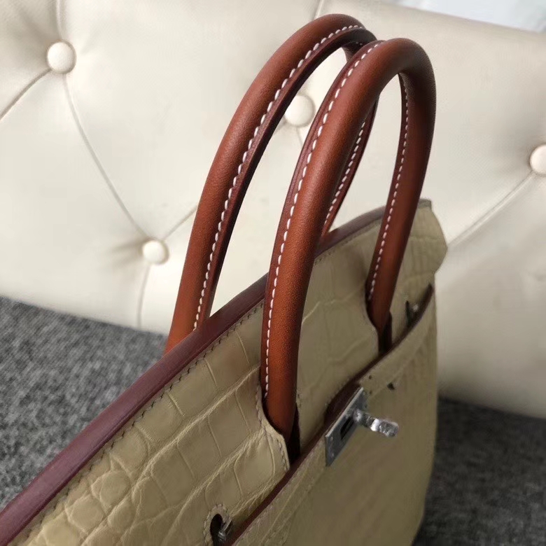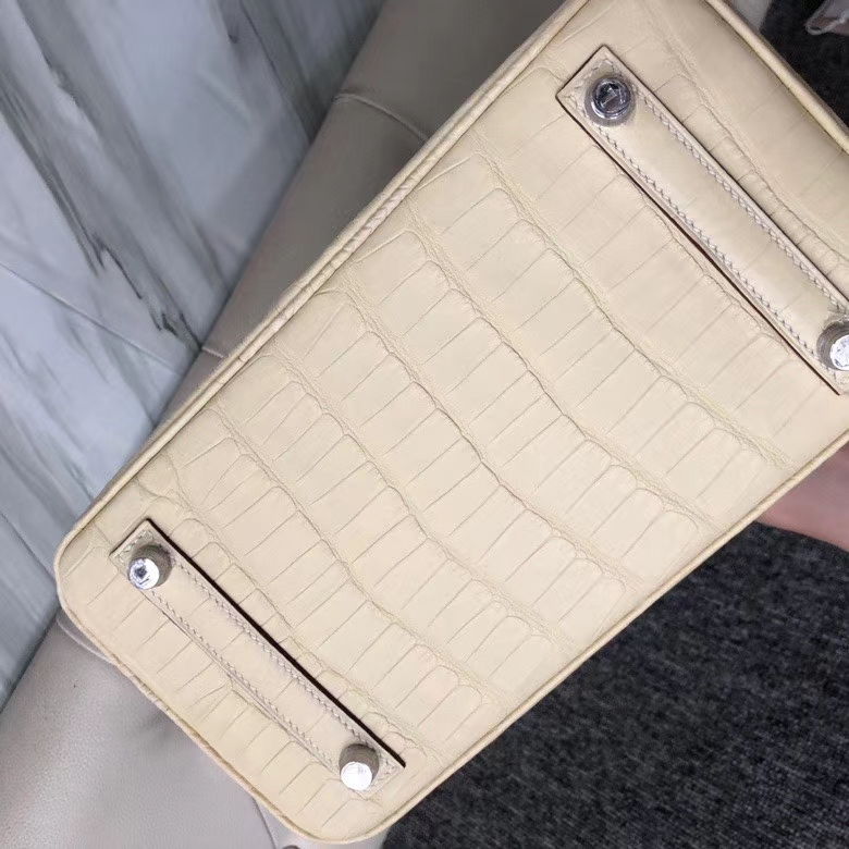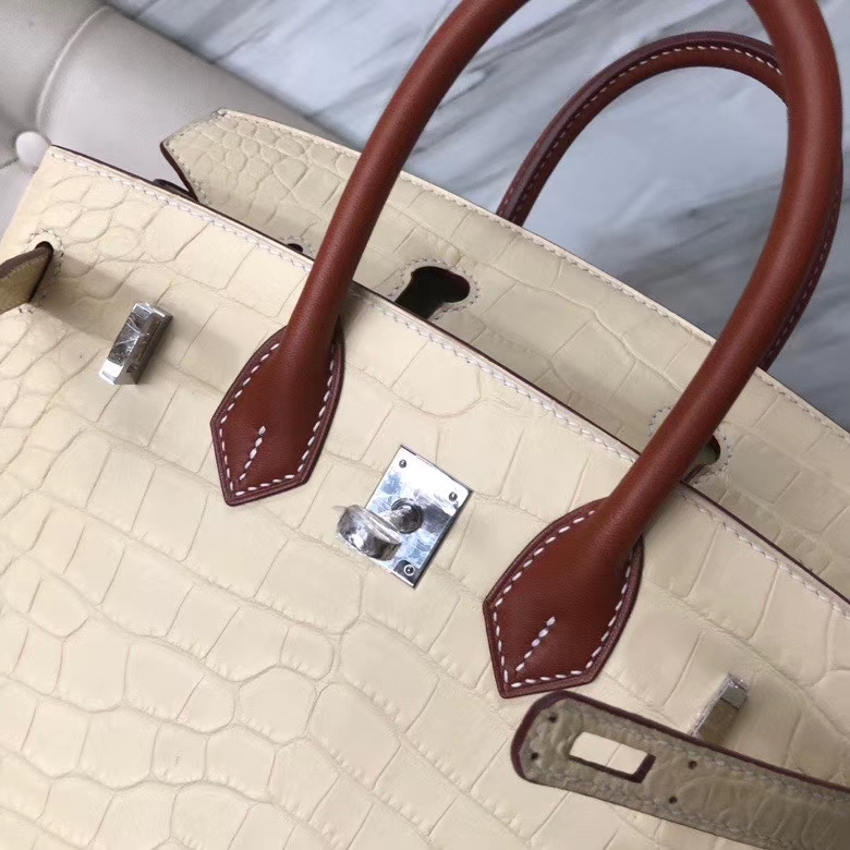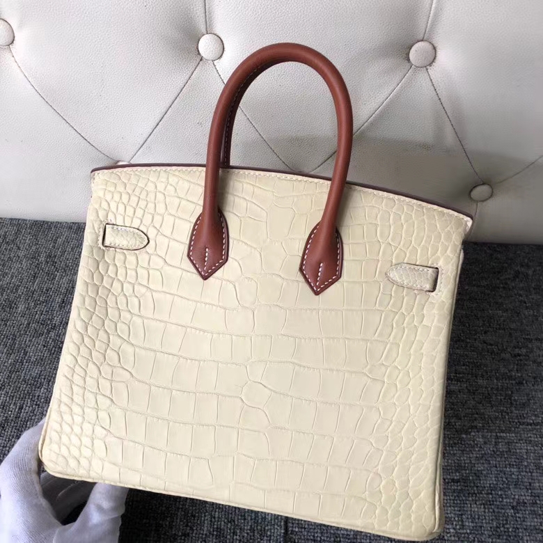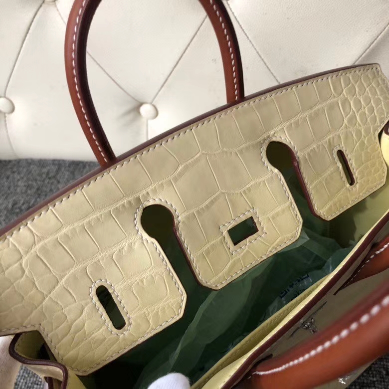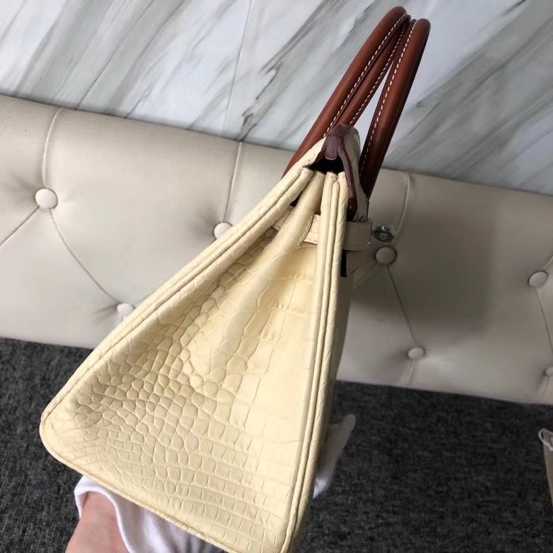 Hermès(爱马仕)Birkin 25cm Alligator matt 雾面鳄鱼 Y1香草色 拼马鞍皮金棕色 银扣 顶级手缝 现货 2020年6月16日 0 【鳄鱼世家】www.Eyubao.com Birkin 25 Birkin 铂金包 Niloticus 尼罗鳄 品牌:Hermès(爱马仕);类别:Birkin 铂金包;颜色:香草色 拼 金棕色;材质:雾面鳄鱼拼马鞍皮;等级:顶级;附件:全套包装礼盒;尺寸:25cm;功能:手提单肩包