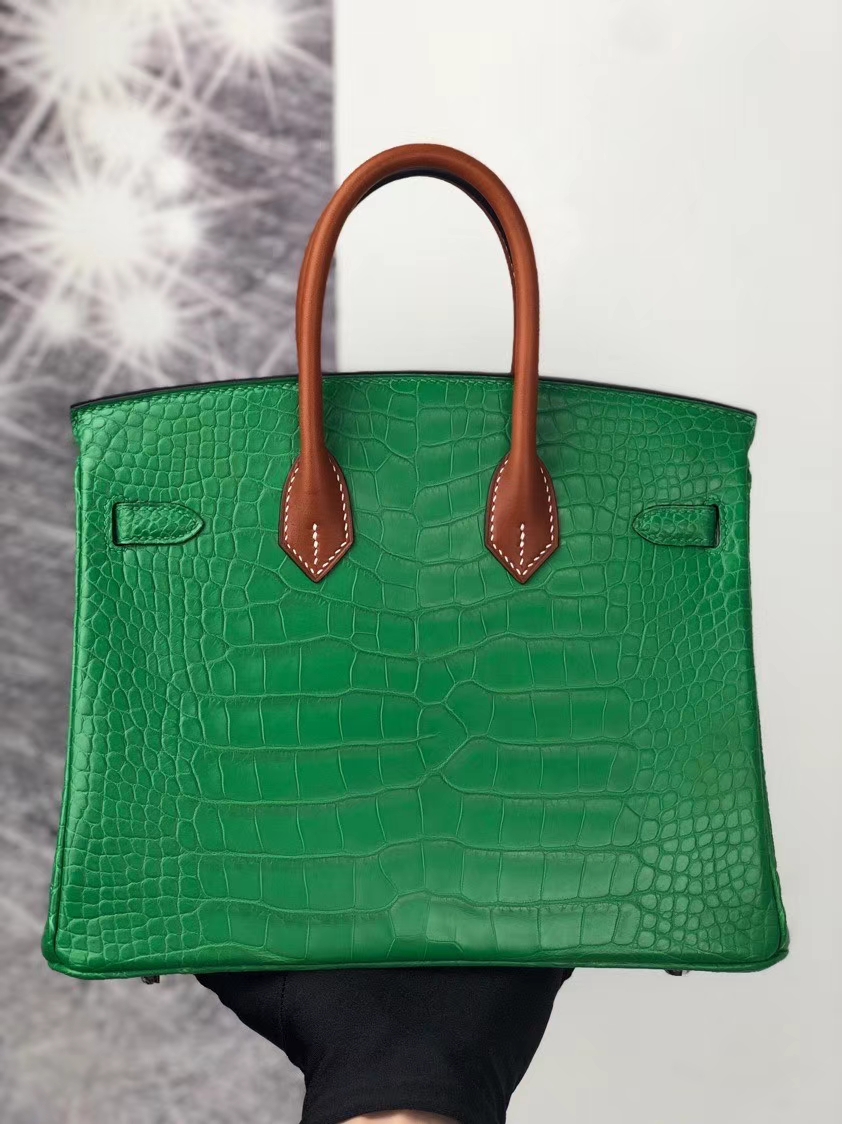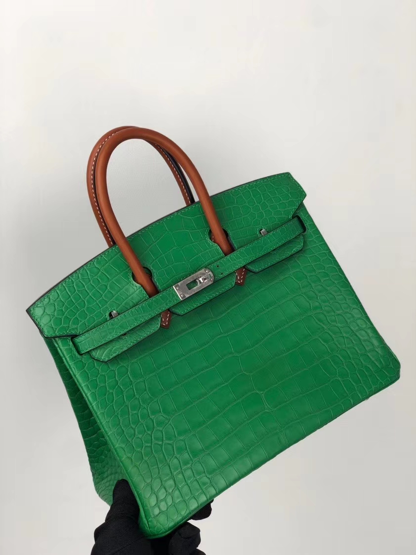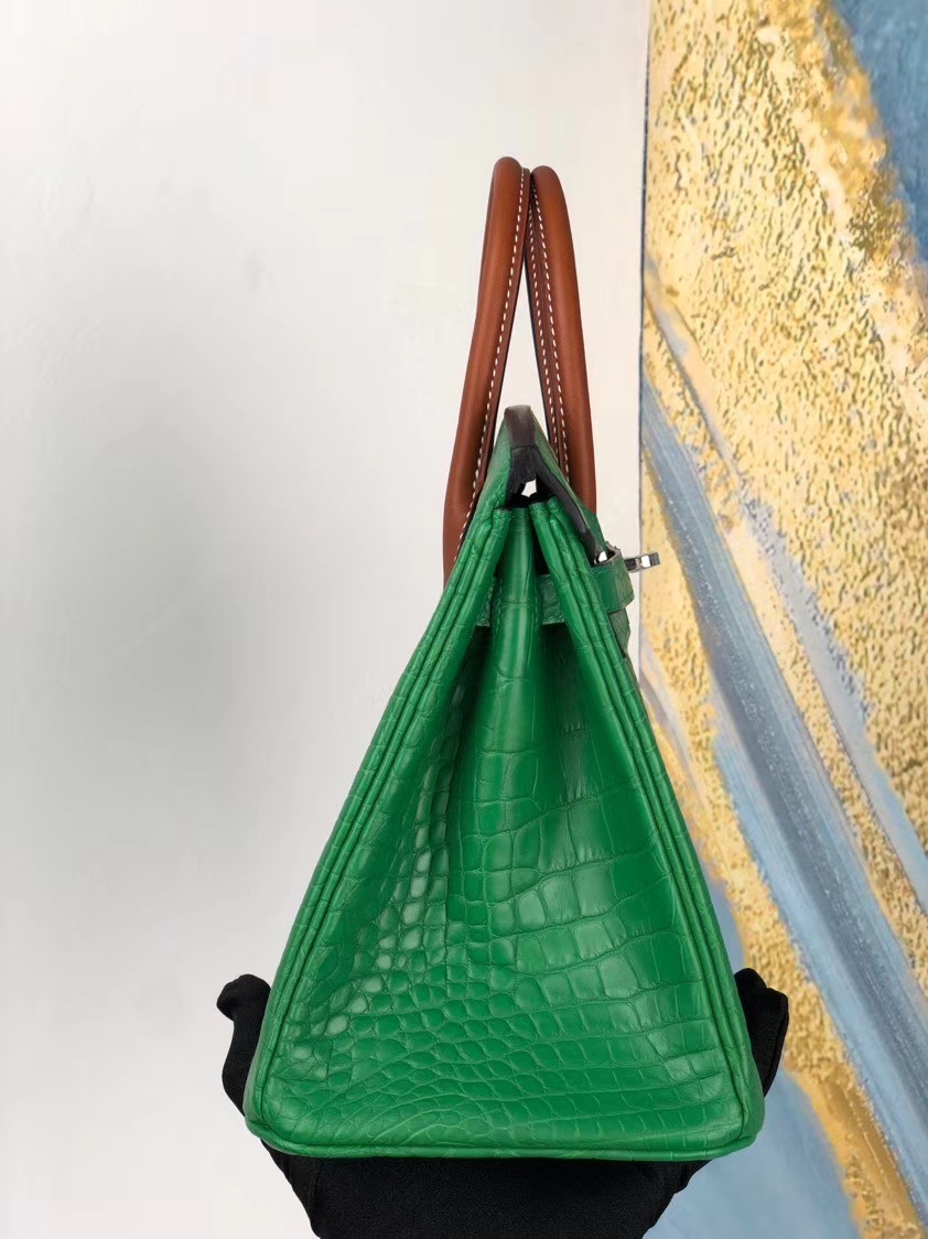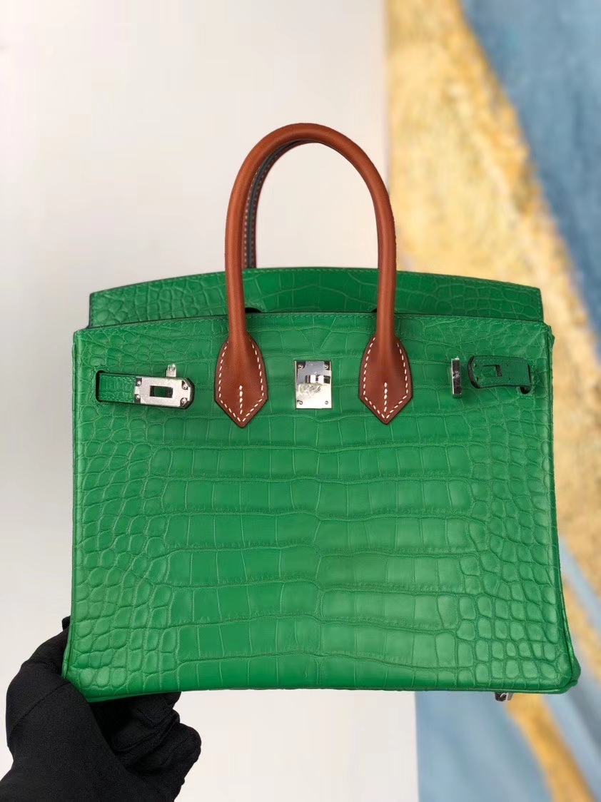 Hermès(爱马仕)Birkin 25cm Alligator matt 雾面鳄鱼 仙人掌绿拼马鞍皮金棕色 银扣 顶级手缝 现货 2020年6月20日 0 【鳄鱼世家】www.Eyubao.com Birkin 25 Birkin 铂金包 Niloticus 尼罗鳄 品牌:Hermès(爱马仕);类别:Birkin 铂金包;颜色:仙人掌绿拼马鞍皮金棕色;材质:雾面鳄鱼;等级:顶级;附件:全套包装礼盒;尺寸:25cm;功能:手提单肩包