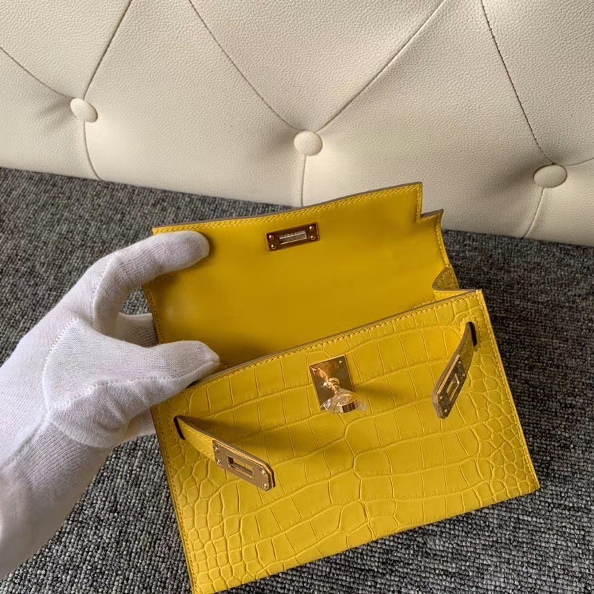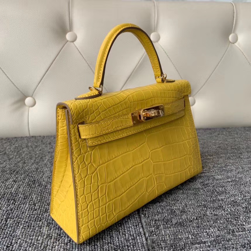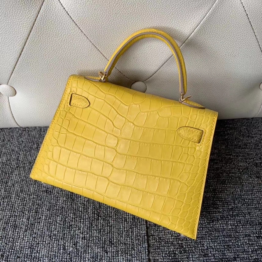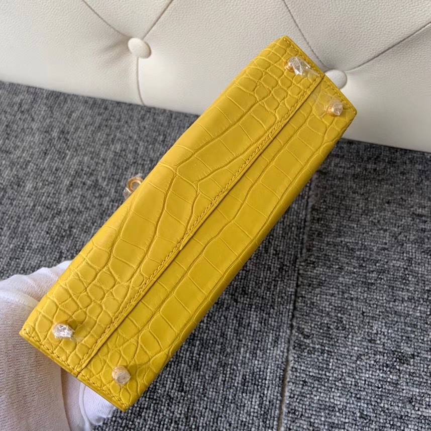 Hermès(爱马仕)Mini kelly ll Alligator matt 雾面鳄鱼 M9 金盏花黄 金扣 顶级手缝 现货 2020年7月8日 0 【鳄鱼世家】www.Eyubao.com Mini Kelly 2 Mini Kelly 迷你凯莉 品牌:Hermès(爱马仕);类别:Mini Kelly 迷你凯莉;颜色:金盏花黄;材质:雾面鳄鱼;等级:顶级;附件:全套包装礼盒;尺寸:19cm;功能:单肩背包