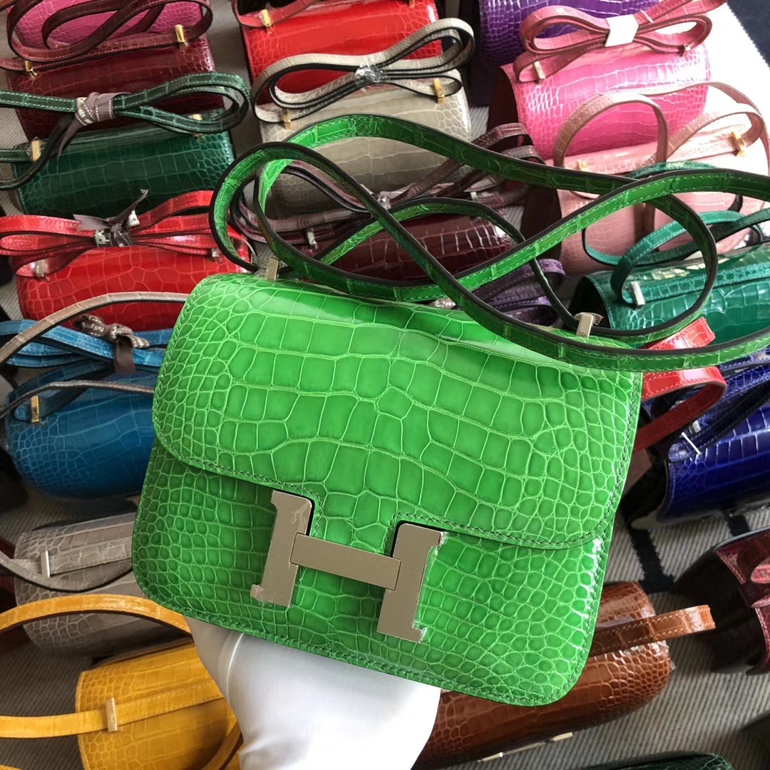 Constance 18 Constance 空姐包 Hermès(爱马仕)Constance 空姐包 18cm Alligator shiny 亮面鳄鱼 1L 仙人掌绿 银扣 现货 2019年12月7日 0