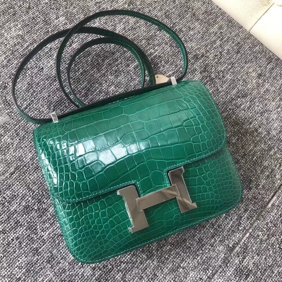 Constance 18 Constance 空姐包 Hermès(爱马仕)Constance 空姐包 Alligator shiny 亮面鳄鱼 6Q 翡翠绿 银扣 18cm 现货 2019年11月7日 0