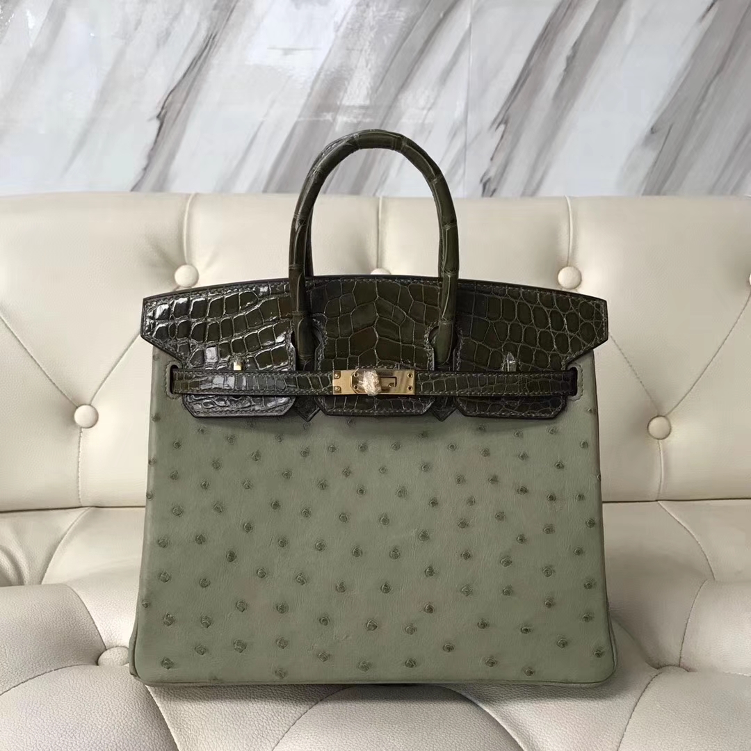 Birkin 25 Birkin 铂金包 Hermès(爱马仕)Birkin25cm ostrich kk鸵鸟皮 v6丛林绿拼亮面橄榄绿鳄鱼内拼 I9杏黄色 蜡线全手工 金扣 2018年11月13日 0