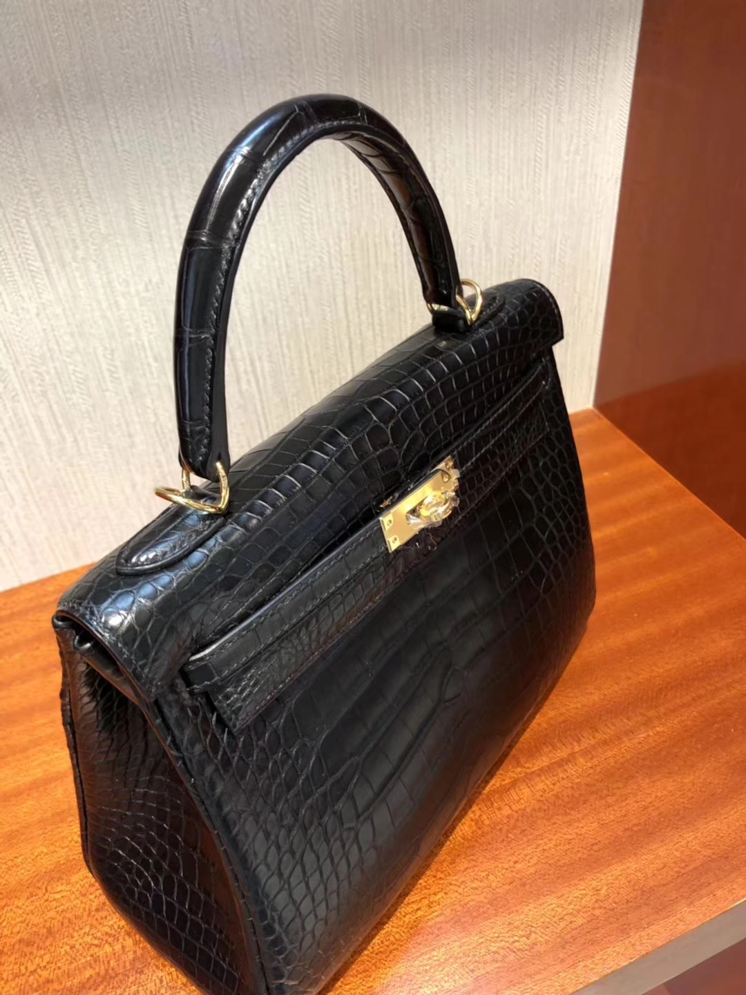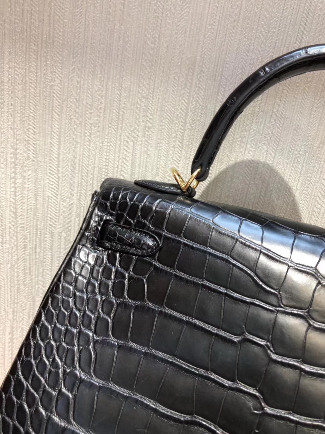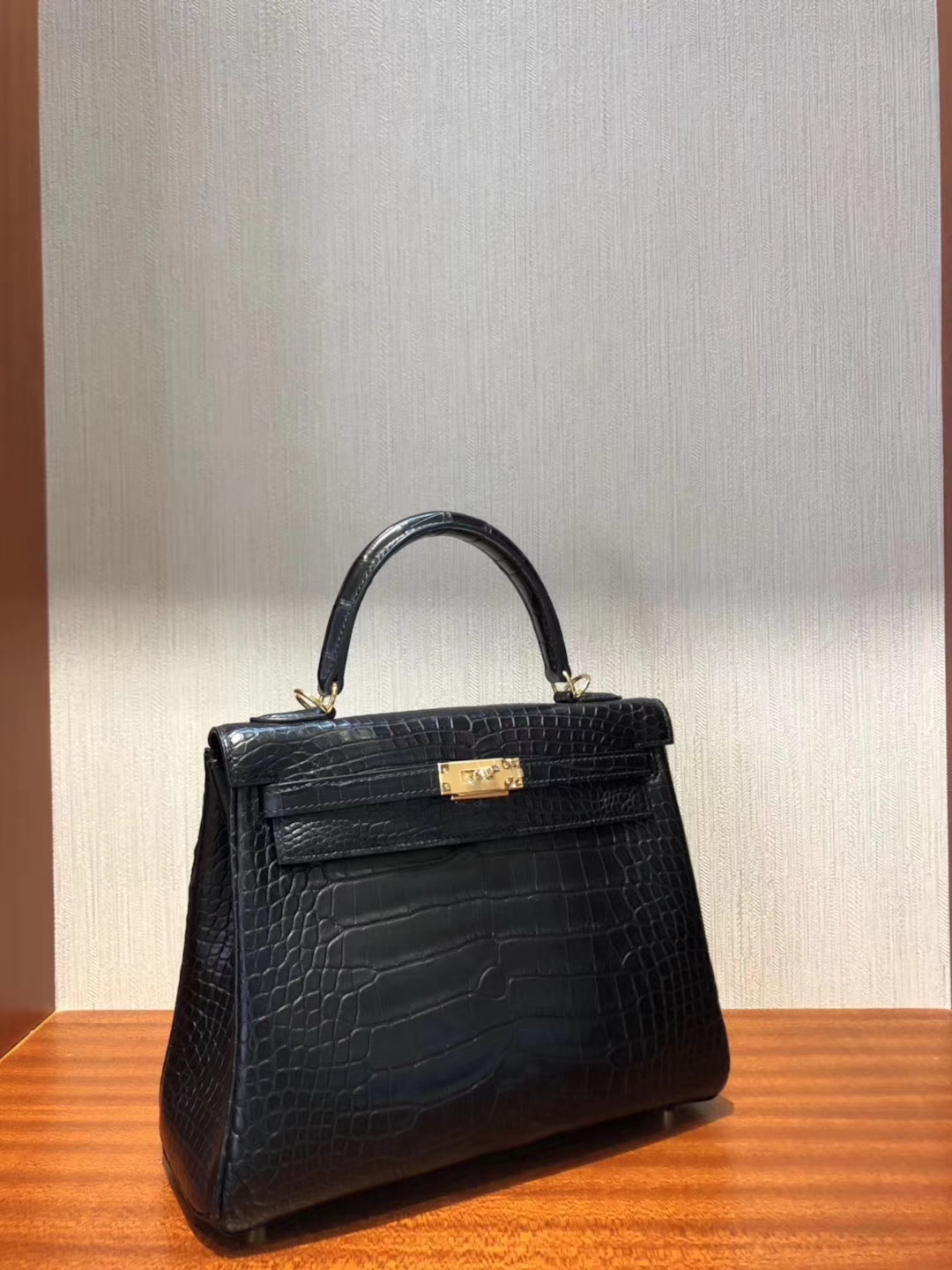 Hermès(爱马仕)Kelly25cm Matt alligator crocodile ck89黑色 蜡线全手工 金扣 2018年10月23日 0 【鳄鱼世家】www.Eyubao.com Kelly 25 Kelly 凯莉包 品牌:Hermès(爱马仕);类别:Kelly凯莉包;颜色:黑色;材质:shiny alligator crocodile;等级:顶级;附件:全套包装礼盒;尺寸:25cm;功能:手提单肩