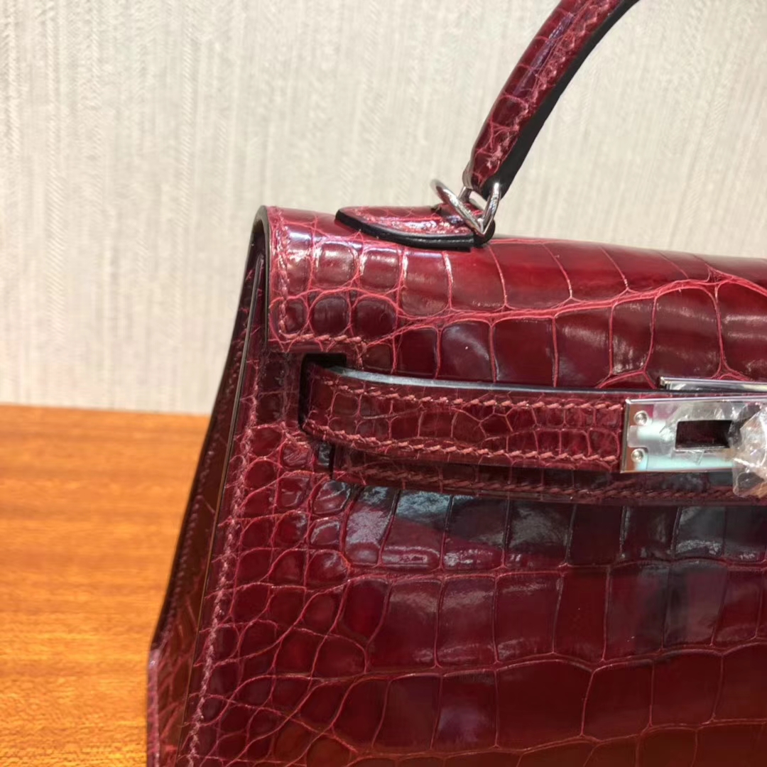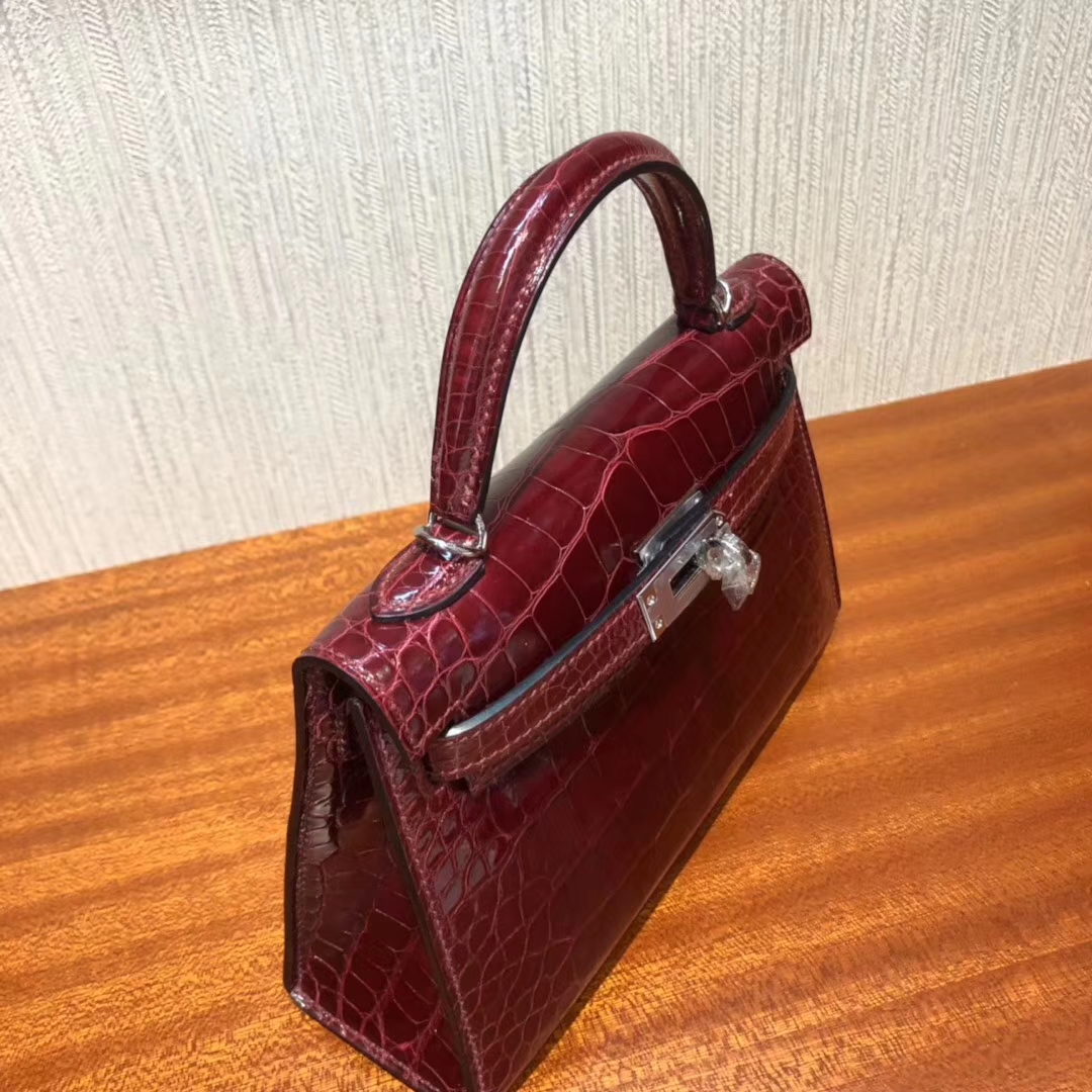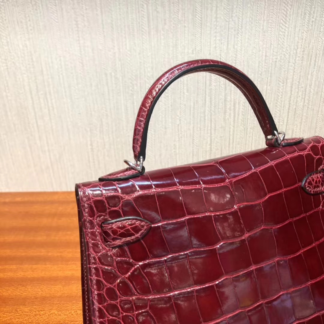Hermès(爱马仕)Kelly2代 19cm shiny alligator crocodile F5勃艮第酒红 蜡线全手工 银扣 2018年10月23日 0 【鳄鱼世家】www.Eyubao.com Mini Kelly 2 Mini Kelly 迷你凯莉 品牌:Hermès(爱马仕);类别:Mini Kelly迷你凯莉包;颜色:勃艮第酒红;材质:shiny alligator crocodile;等级:顶级;附件:全套包装礼盒;尺寸:22cm;功能:手提单肩包