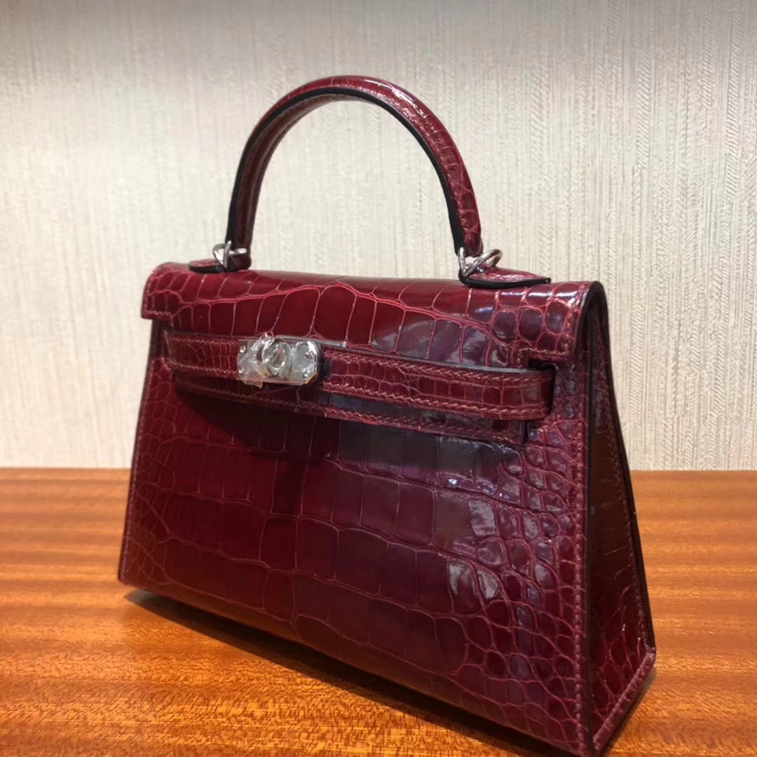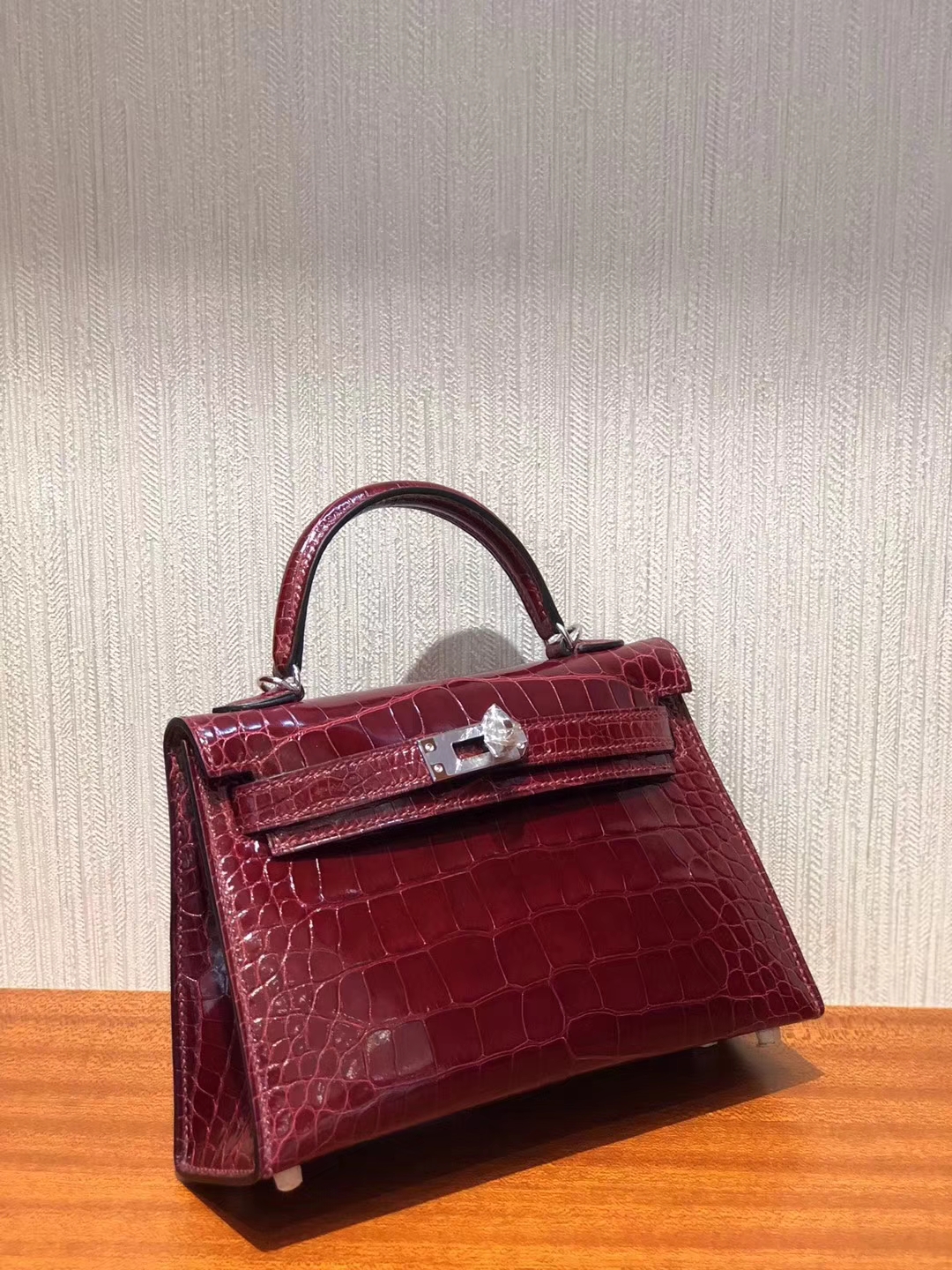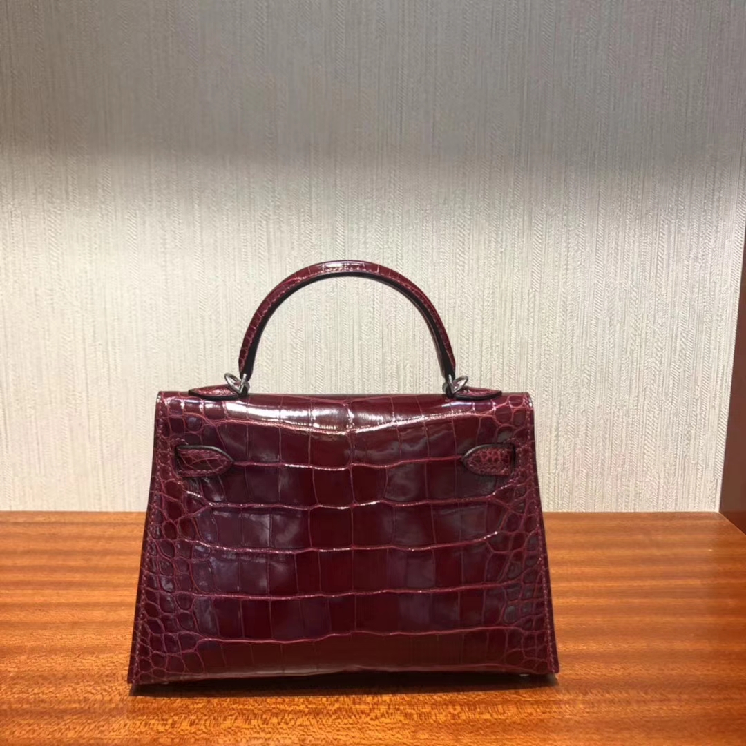 Hermès(爱马仕)Kelly2代 19cm shiny alligator crocodile F5勃艮第酒红 蜡线全手工 银扣 2018年10月23日 0 【鳄鱼世家】www.Eyubao.com Mini Kelly 2 Mini Kelly 迷你凯莉 品牌:Hermès(爱马仕);类别:Mini Kelly迷你凯莉包;颜色:勃艮第酒红;材质:shiny alligator crocodile;等级:顶级;附件:全套包装礼盒;尺寸:22cm;功能:手提单肩包