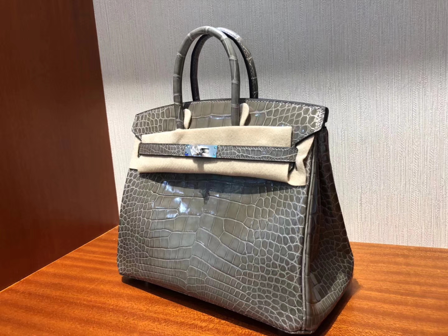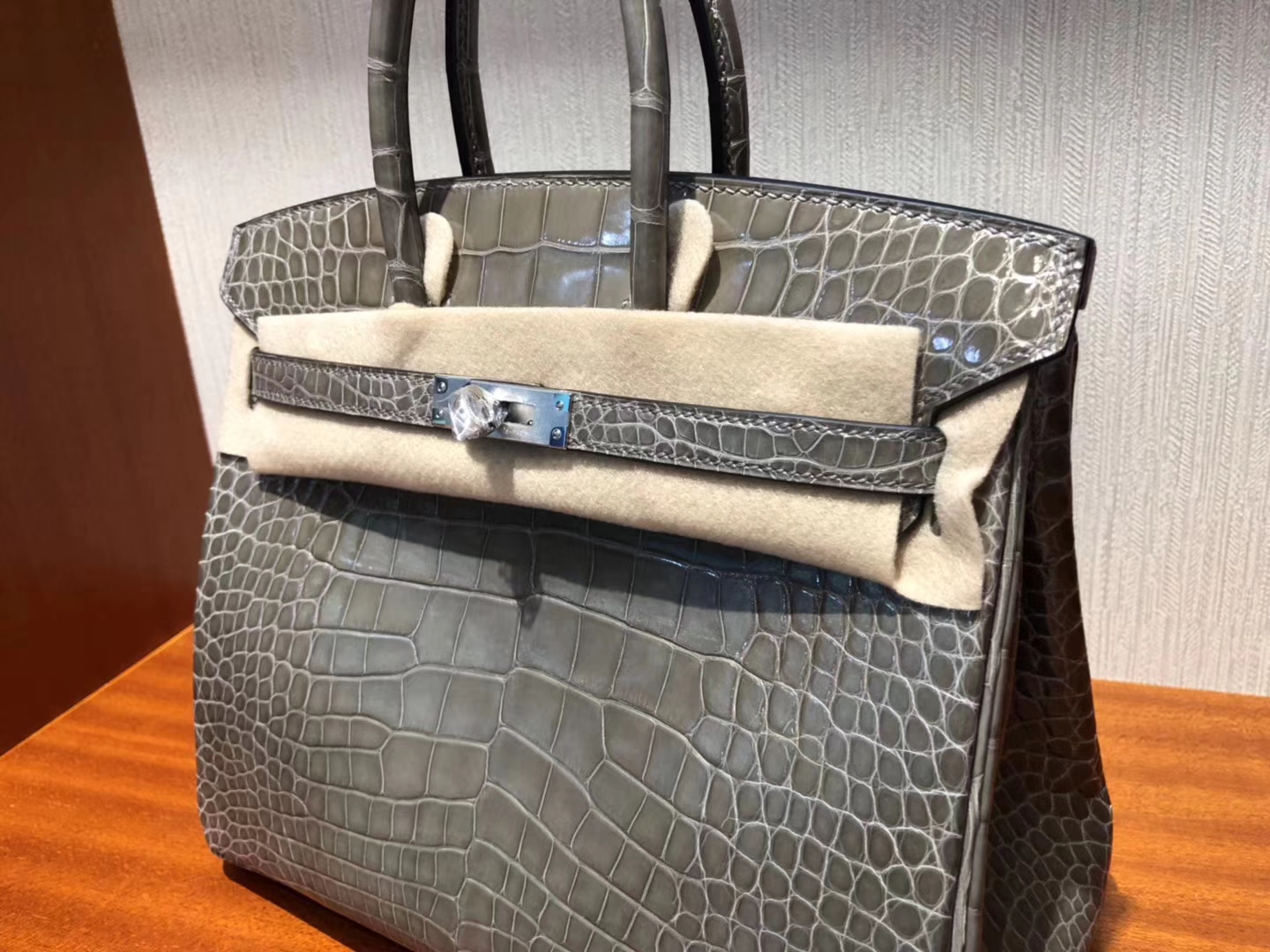 Hermès(爱马仕)Birkin25cm Alligator shiny 亮面鳄鱼 ck18 斑鸠灰 Gris T 银扣 2018年10月26日 0 【鳄鱼世家】www.Eyubao.com Birkin 25 Birkin 铂金包 品牌:Hermès(爱马仕);类别:Birkin 铂金包;颜色:斑鸠灰;材质:亮面鳄鱼皮;等级:顶级;附件:全套包装礼盒;尺寸:25cm;功能:手提单肩包