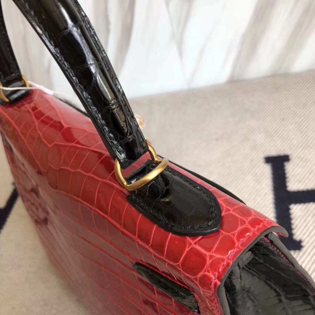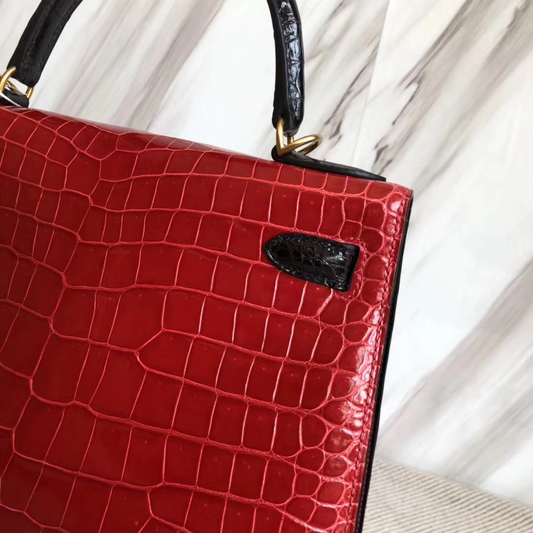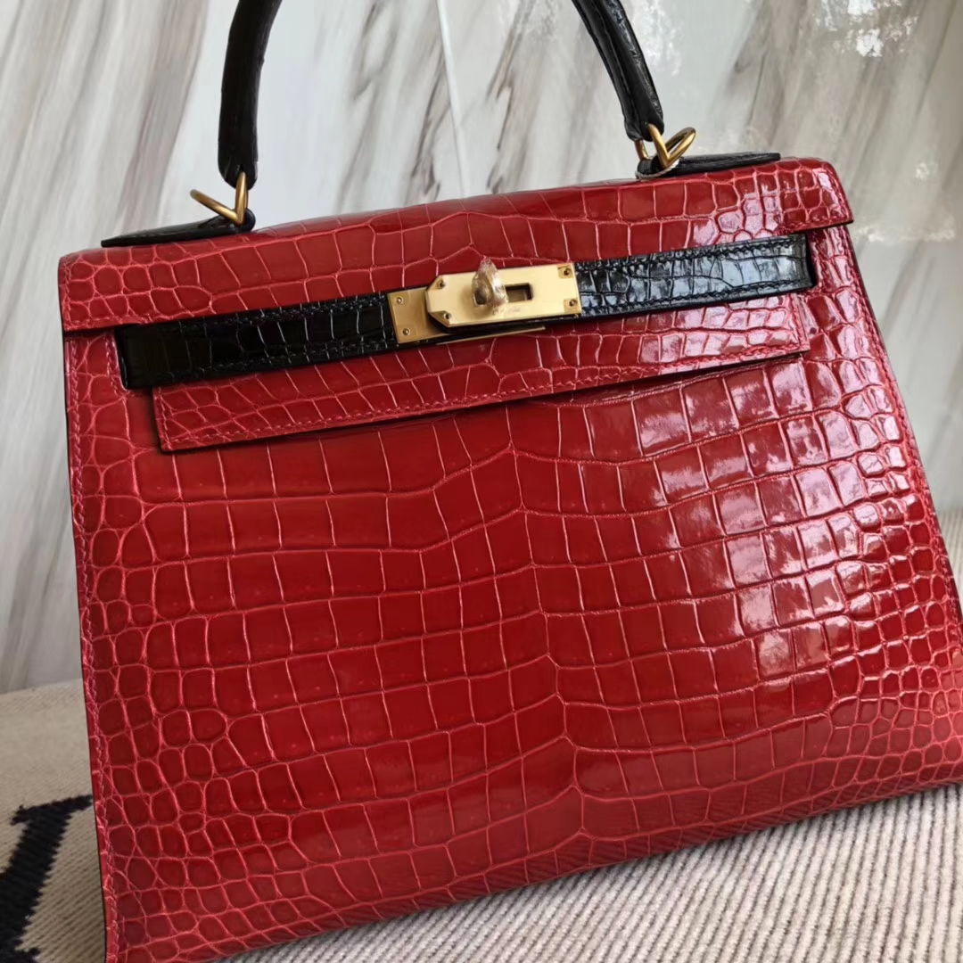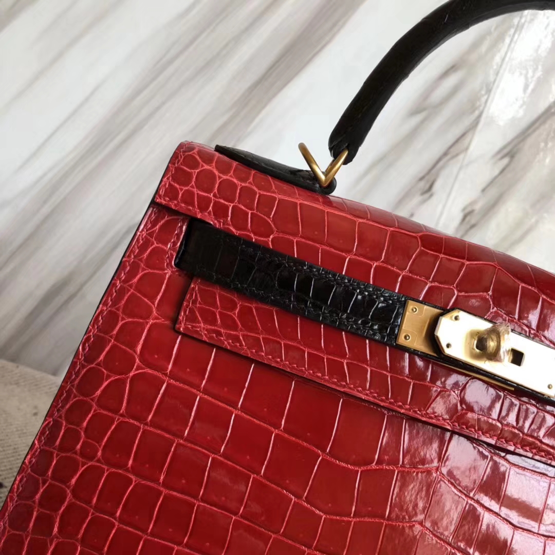 Hermès(爱马仕)Kelly28cm Porosus shiny 亮面 澳洲湾鳄鳄鱼 ck95 法拉利红ck89 黑色 马蹄印金扣 2018年10月26日 0 【鳄鱼世家】www.Eyubao.com Kelly 28 Kelly 凯莉包 品牌:Hermès(爱马仕);类别:Kelly凯莉包;颜色:法拉利红拼黑色;材质:澳洲湾鳄鳄鱼皮;等级:顶级;附件:全套包装礼盒;尺寸:28cm;功能:手提单肩包