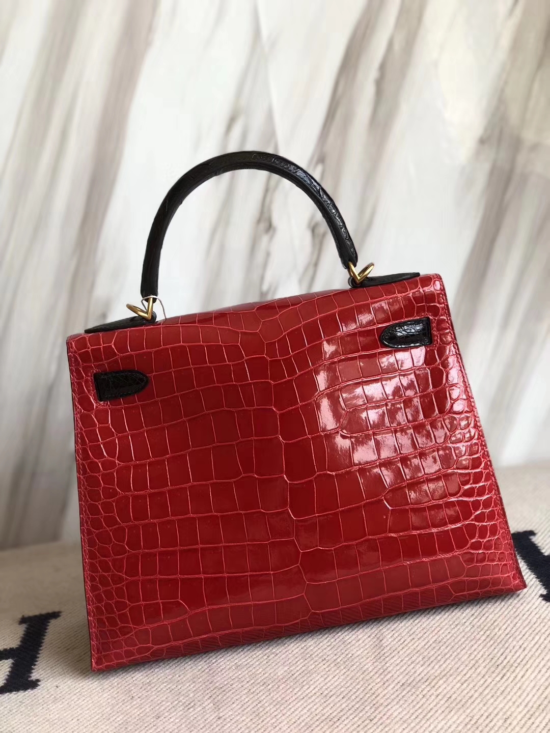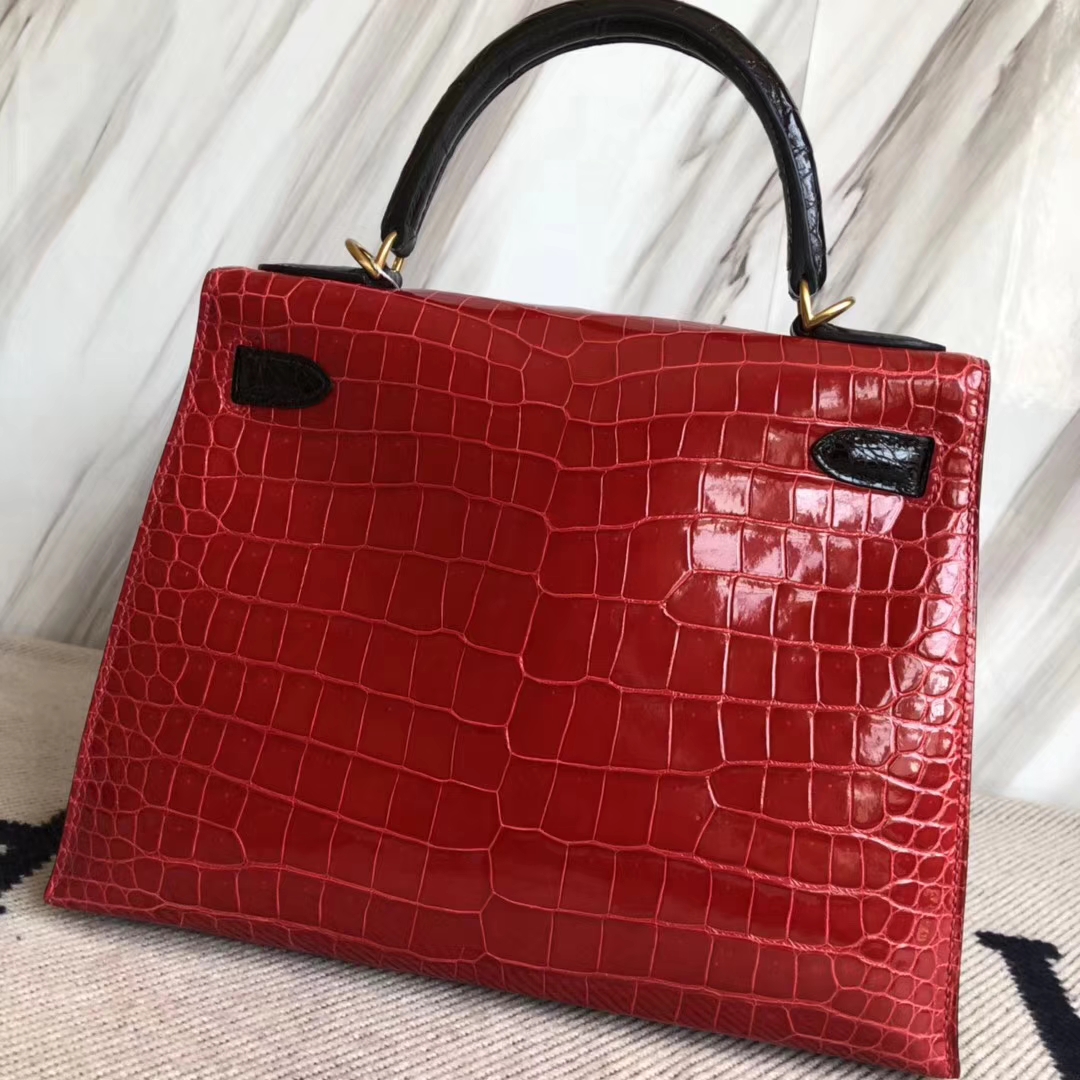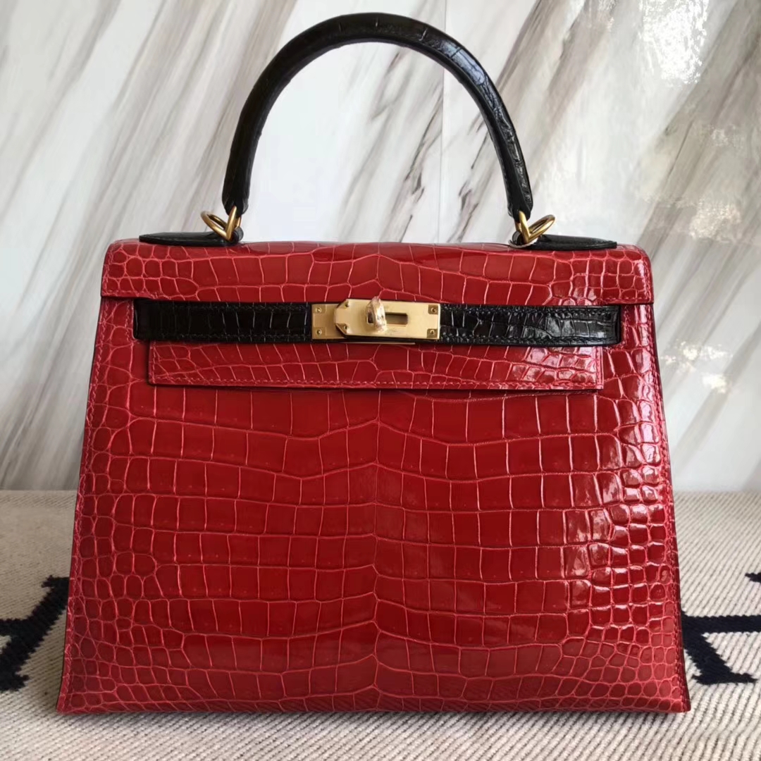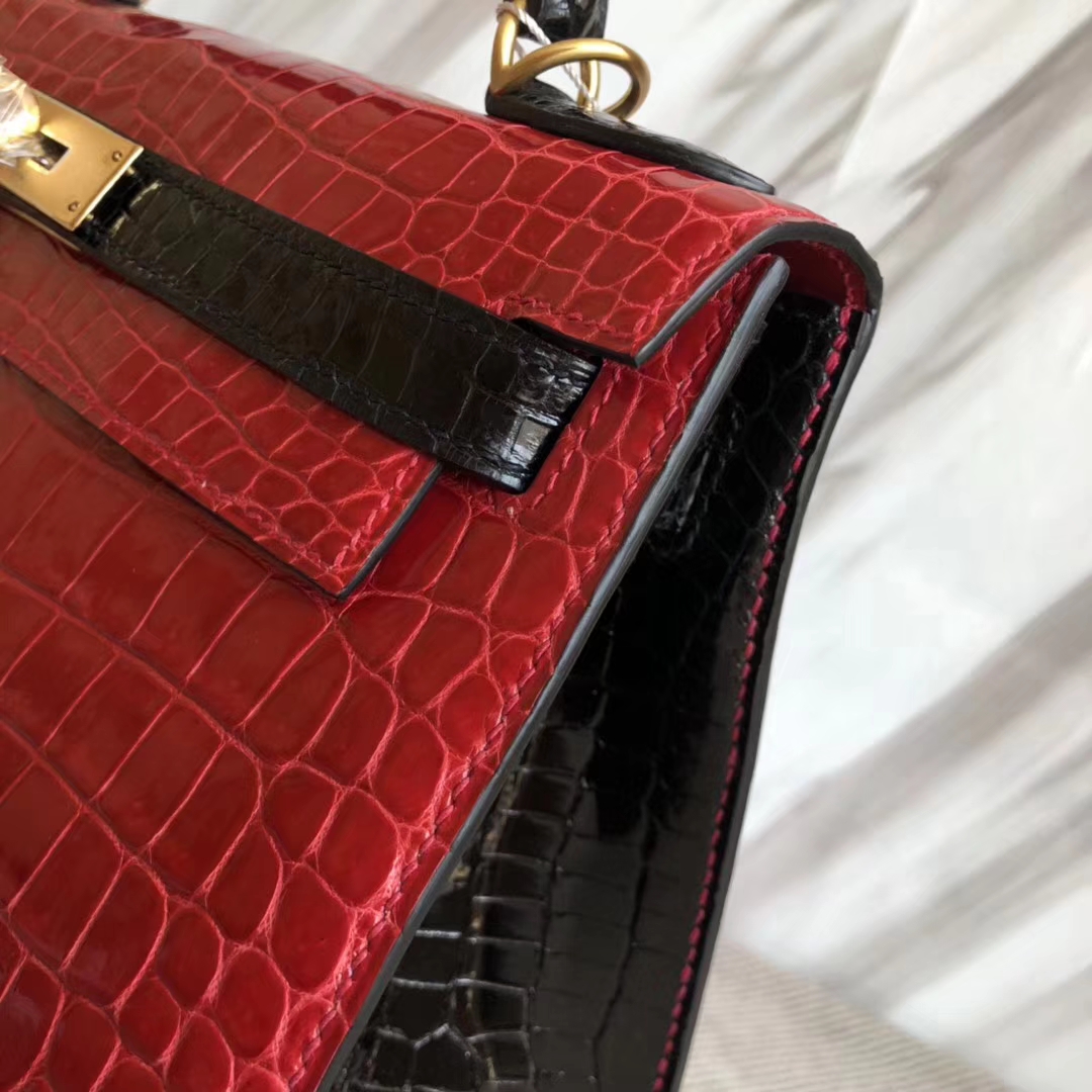 Hermès(爱马仕)Kelly28cm Porosus shiny 亮面 澳洲湾鳄鳄鱼 ck95 法拉利红ck89 黑色 马蹄印金扣 2018年10月26日 0 【鳄鱼世家】www.Eyubao.com Kelly 28 Kelly 凯莉包 品牌:Hermès(爱马仕);类别:Kelly凯莉包;颜色:法拉利红拼黑色;材质:澳洲湾鳄鳄鱼皮;等级:顶级;附件:全套包装礼盒;尺寸:28cm;功能:手提单肩包