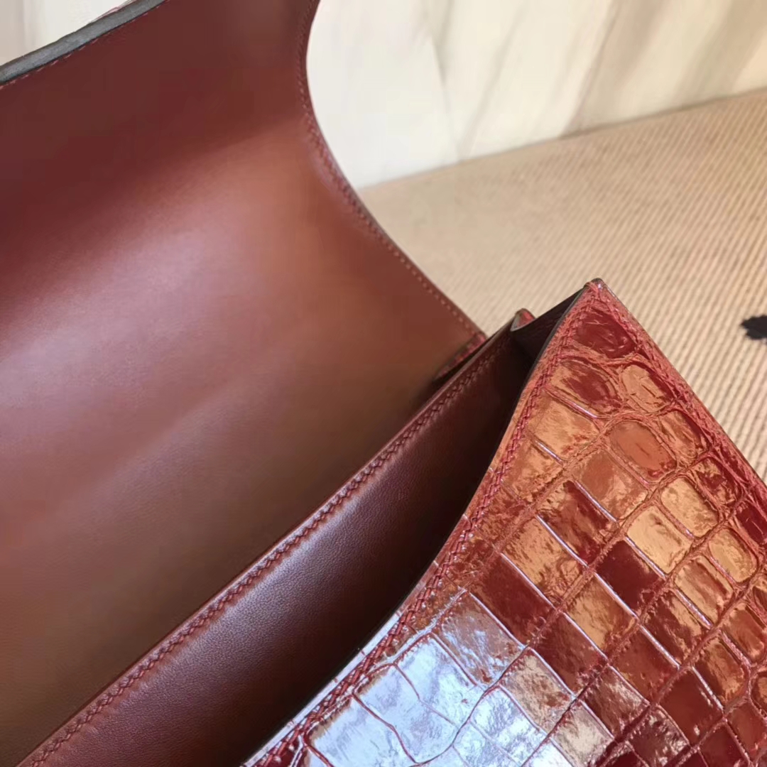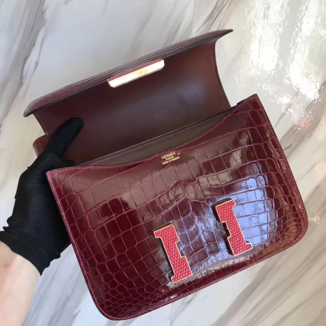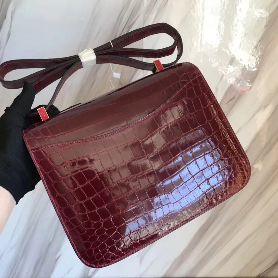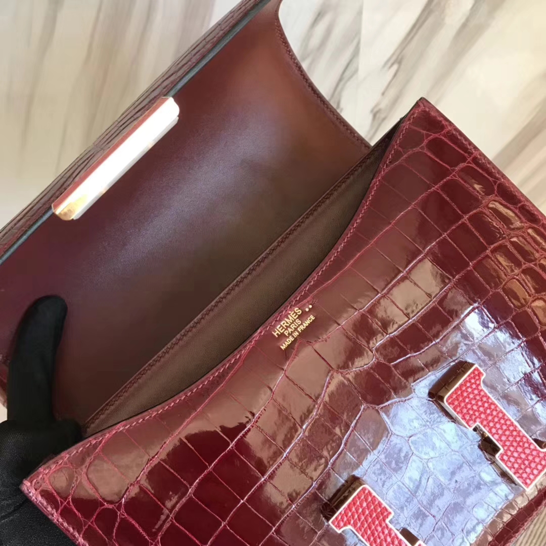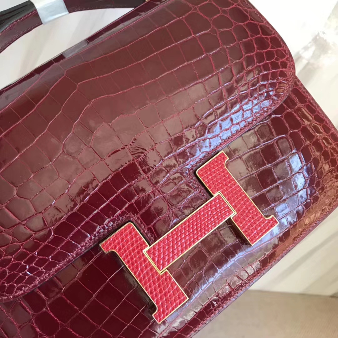 Hermès(爱马仕)Constance24cm Crocodile shiny 亮面鳄鱼 F5 新酒红 勃艮第酒红 蜥蜴扣 金扣 2018年10月28日 0 【鳄鱼世家】www.Eyubao.com Constance 24 Constance 空姐包 品牌:Hermès(爱马仕);类别:Constance空姐包;颜色:新酒红 勃艮第酒红;材质:亮面鳄鱼;等级:顶级;附件:全套包装礼盒;尺寸:24cm;功能:单肩斜挎包