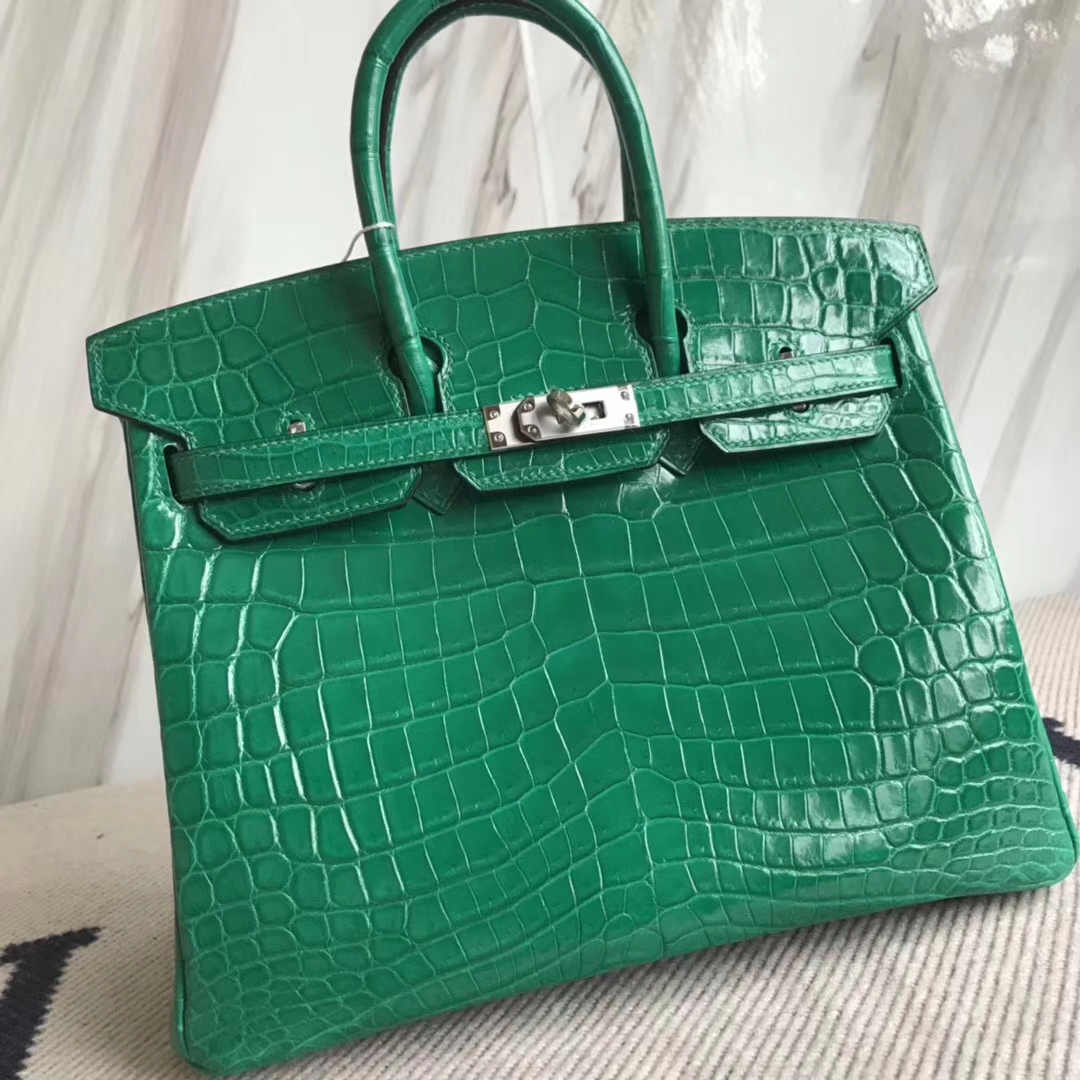 Hermès(爱马仕)Birkin25cm Crocodile shiny 亮面鳄鱼 6Q 翡翠绿 银扣 2018年10月28日 0 【鳄鱼世家】www.Eyubao.com Birkin 25 Birkin 铂金包 品牌:Hermès(爱马仕);类别:Birkin 铂金包;颜色: 翡翠绿;材质:亮面鳄鱼;等级:顶级;附件:全套包装礼盒;尺寸:25cm;功能:手提单肩包
