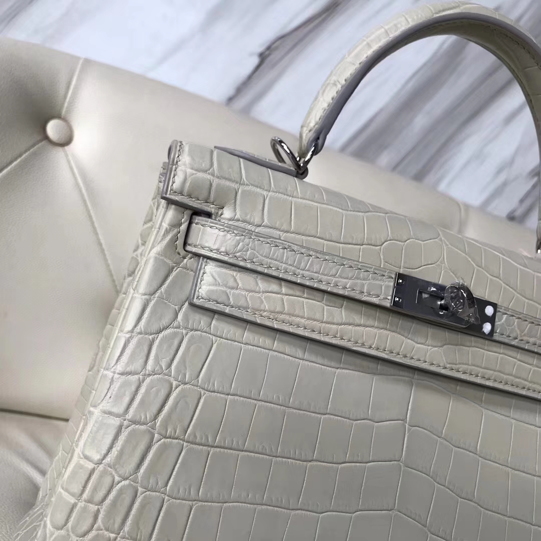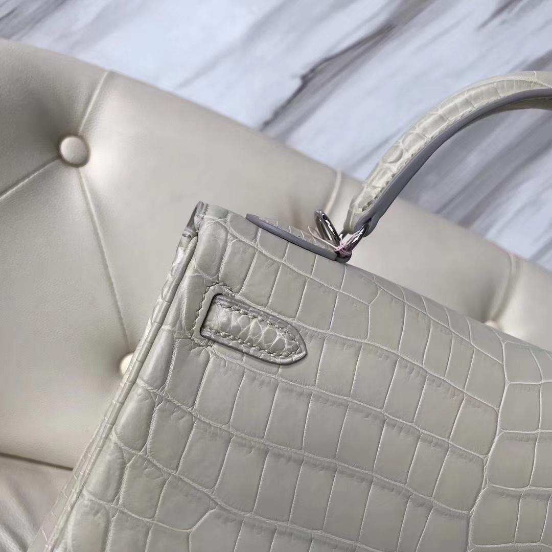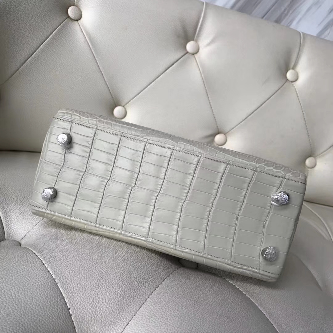 Hermès(爱马仕)Kelly25cm Crocodile matt 雾面鳄鱼 8L 奶油白Beton 银扣 2018年10月28日 0 【鳄鱼世家】www.Eyubao.com Kelly 25 Kelly 凯莉包 品牌:Hermès(爱马仕);类别:Kelly凯莉包;颜色:奶油白;材质:雾面鳄鱼;等级:顶级;附件:全套包装礼盒;尺寸:25cm;功能:手提单肩包