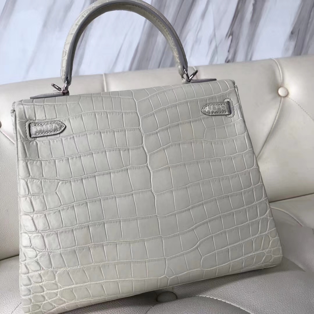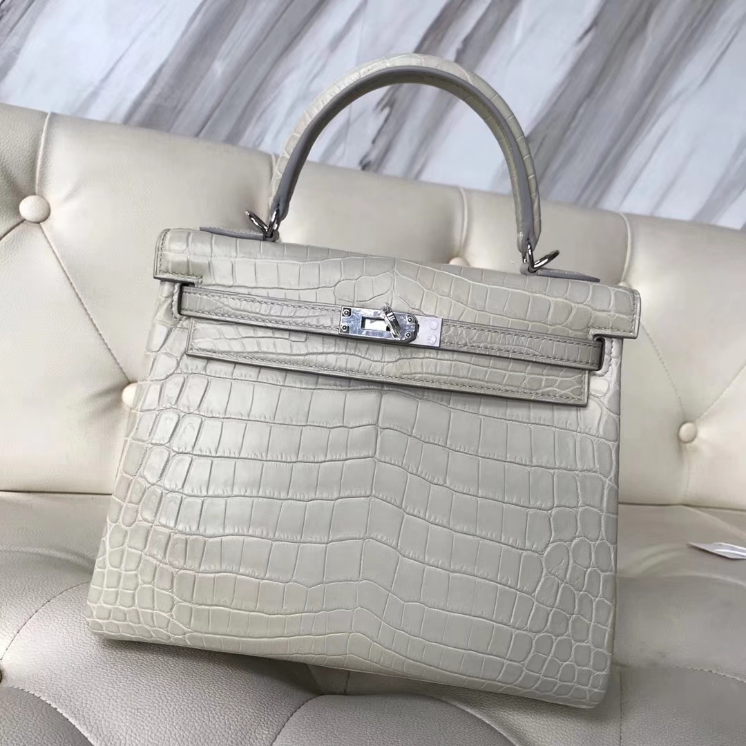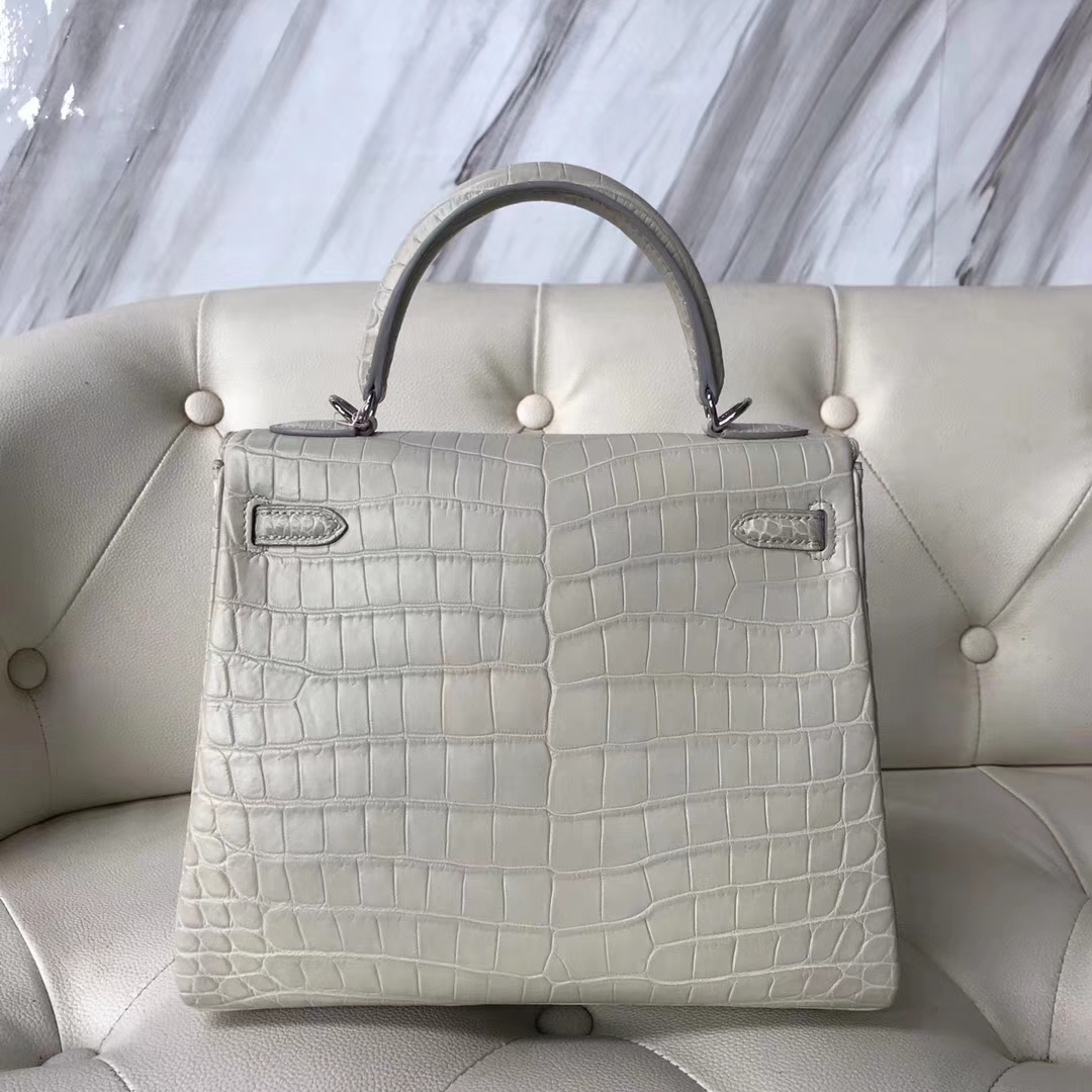 Hermès(爱马仕)Kelly25cm Crocodile matt 雾面鳄鱼 8L 奶油白Beton 银扣 2018年10月28日 0 【鳄鱼世家】www.Eyubao.com Kelly 25 Kelly 凯莉包 品牌:Hermès(爱马仕);类别:Kelly凯莉包;颜色:奶油白;材质:雾面鳄鱼;等级:顶级;附件:全套包装礼盒;尺寸:25cm;功能:手提单肩包
