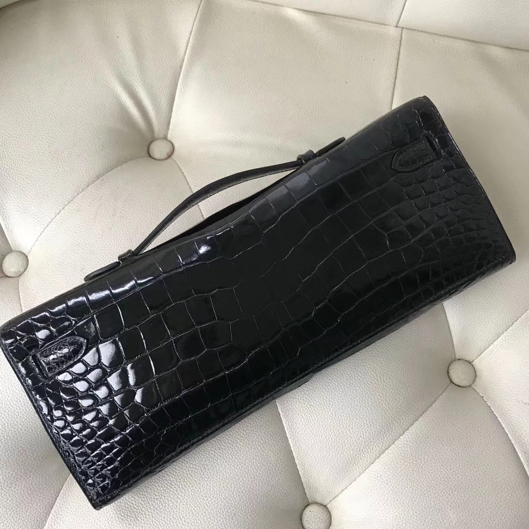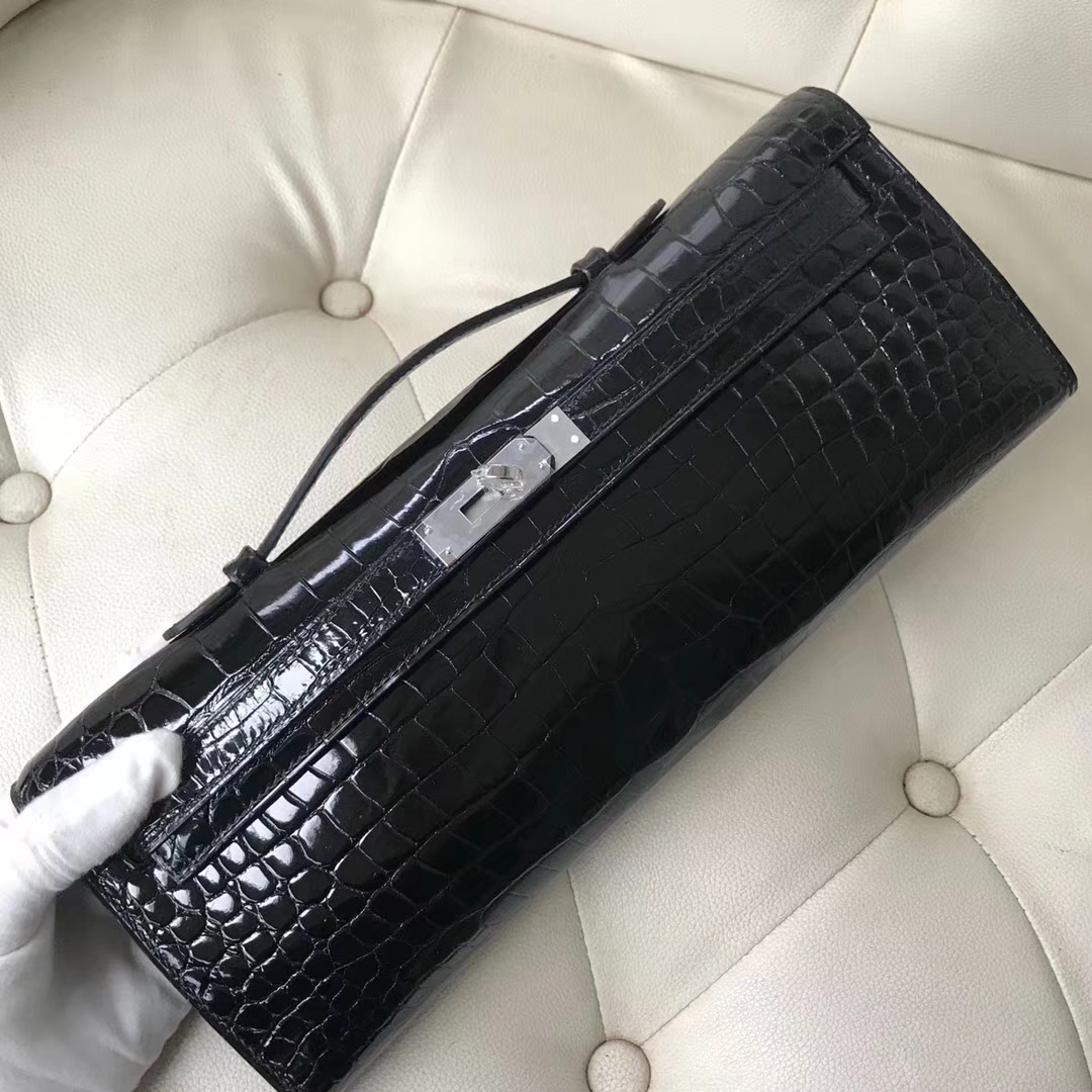Hermès(爱马仕)Kelly cut 31cm porosus shiny 亮面鳄鱼 ck89 黑色 银扣 2018年11月9日 0 【鳄鱼世家】www.Eyubao.com KellyCut 手拿包 品牌:Hermès(爱马仕);类别:Kelly cut长款钱包;颜色: 黑色;材质:亮面鳄鱼;等级:顶级;附件:全套包装礼盒;尺寸:31cm;功能:手提单肩包