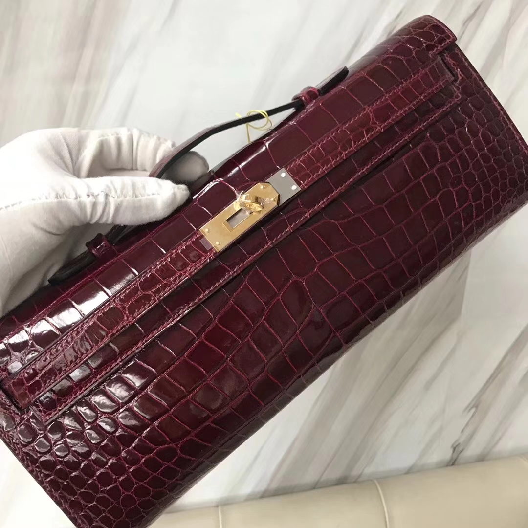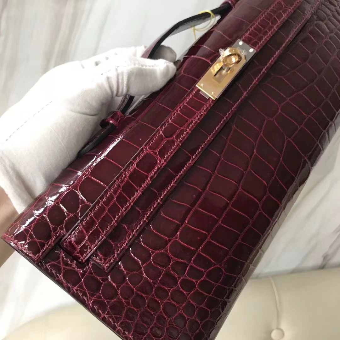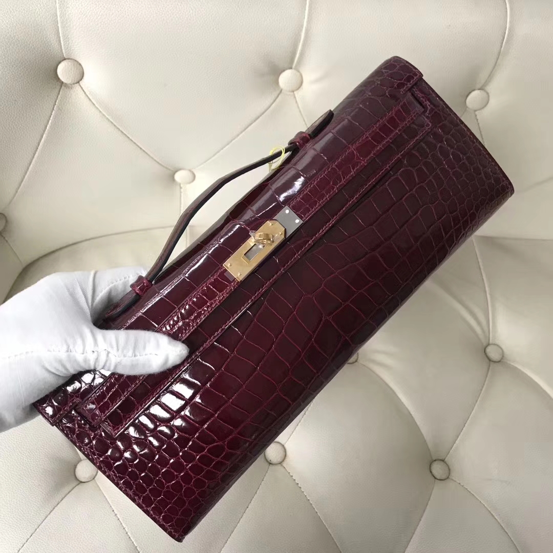 Hermès(爱马仕)Kelly cut 31cm porosus shiny 亮面鳄鱼 波尔多酒红 金扣 2018年11月9日 0 【鳄鱼世家】www.Eyubao.com KellyCut 手拿包 品牌:Hermès(爱马仕);类别:Kelly cut长款钱包;颜色: 波尔多酒红;材质:亮面鳄鱼;等级:顶级;附件:全套包装礼盒;尺寸:31cm;功能:手提单肩包