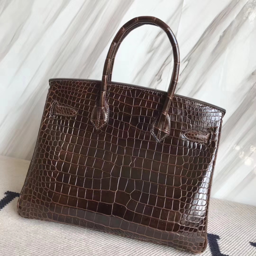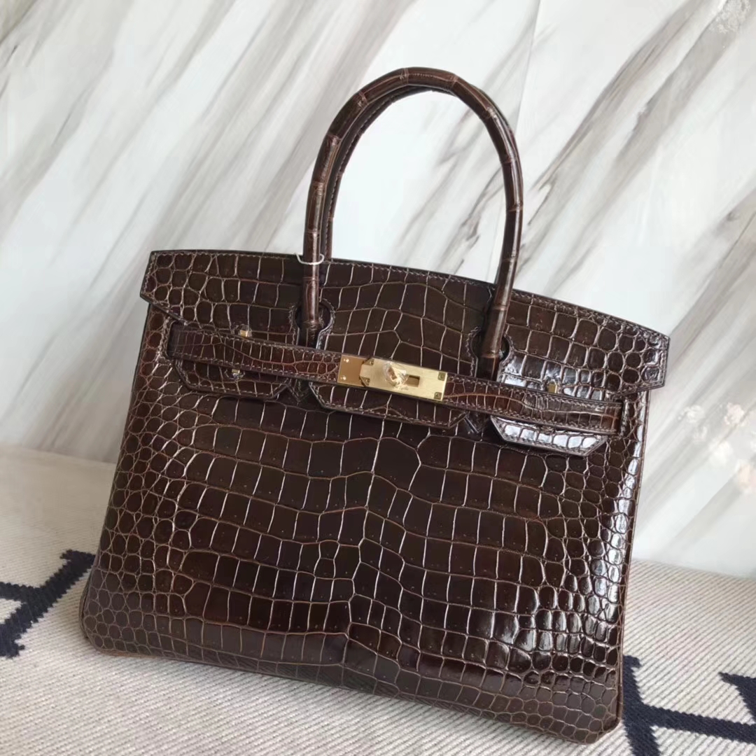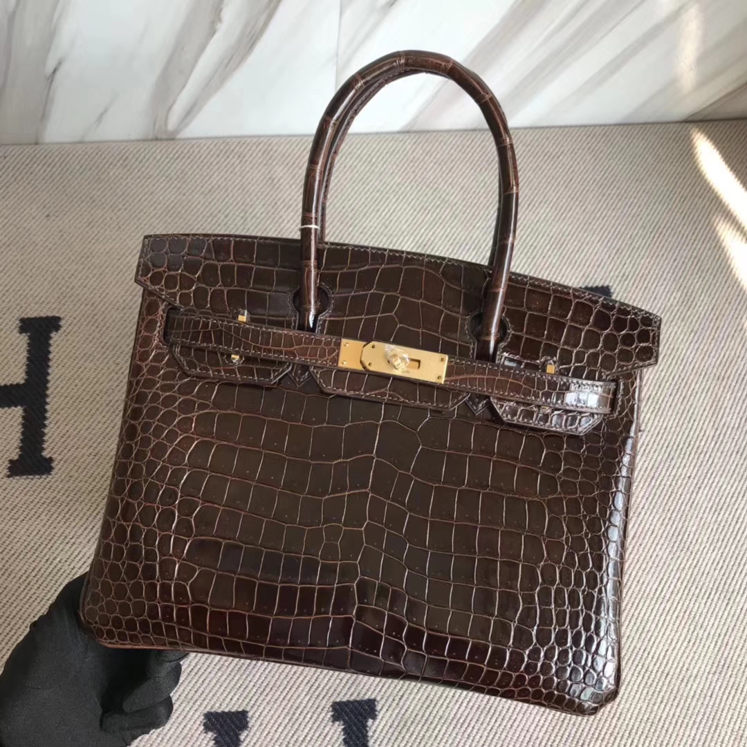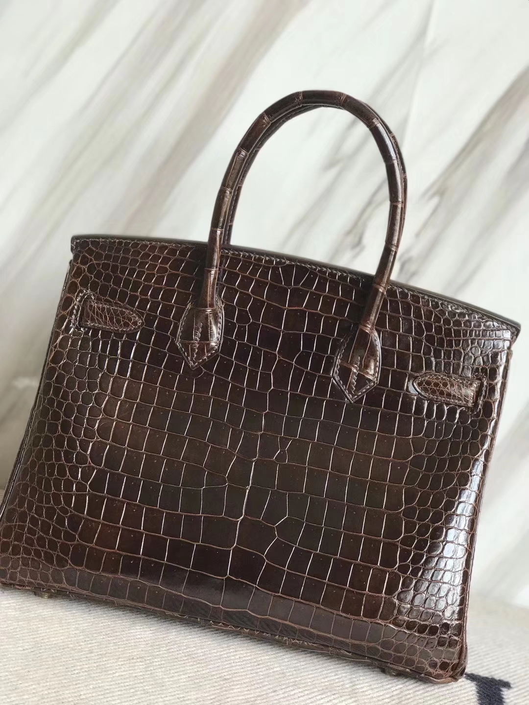 Hermès(爱马仕)Birkin30cm Porosus shiny 亮面澳洲湾鳄 咖啡色 巧克力色 金扣 2018年12月19日 0 【鳄鱼世家】www.Eyubao.com Birkin 30 Birkin 铂金包 品牌:Hermès(爱马仕);类别:Birkin 铂金包;颜色:咖啡色;材质:亮面澳洲湾鳄;等级:顶级;附件:全套包装礼盒;尺寸:30cm;功能:手提单肩包