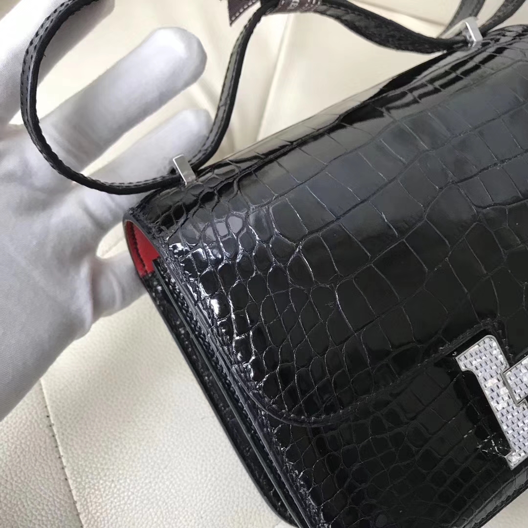 Hermès(爱马仕)Constance Alligator shiny 亮面鳄鱼 ck89 黑色 内拼红 蜥蜴扣 18cm 2018年12月22日 0 【鳄鱼世家】www.Eyubao.com Constance 18 Constance 空姐包 品牌:Hermès(爱马仕);类别:Constance 空姐包;颜色:黑色 内拼红;材质:亮面鳄鱼;等级:顶级;附件:全套包装礼盒;尺寸:18cm;功能:单肩背包