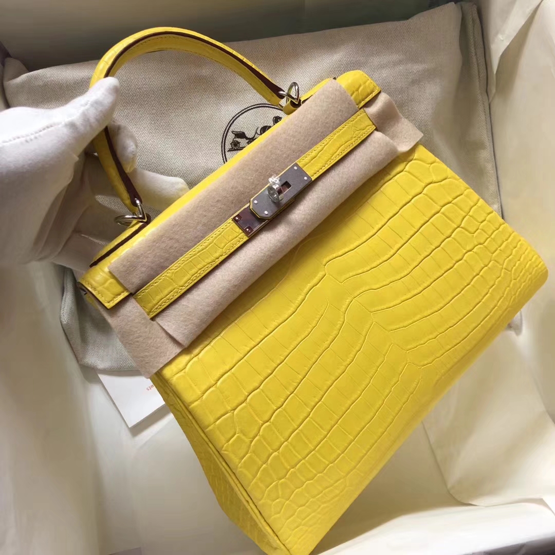 Hermès(爱马仕)Kelly Matt crocodile 雾面尼罗鳄 9R柠檬黄 28cm 2018年12月23日 0 【鳄鱼世家】www.Eyubao.com Kelly 28 Kelly 凯莉包 品牌:Hermès(爱马仕);类别:Kelly凯莉包;颜色:柠檬黄;材质: 雾面尼罗鳄;等级:顶级;附件:全套包装礼盒;尺寸:28cm;功能:手提单肩包