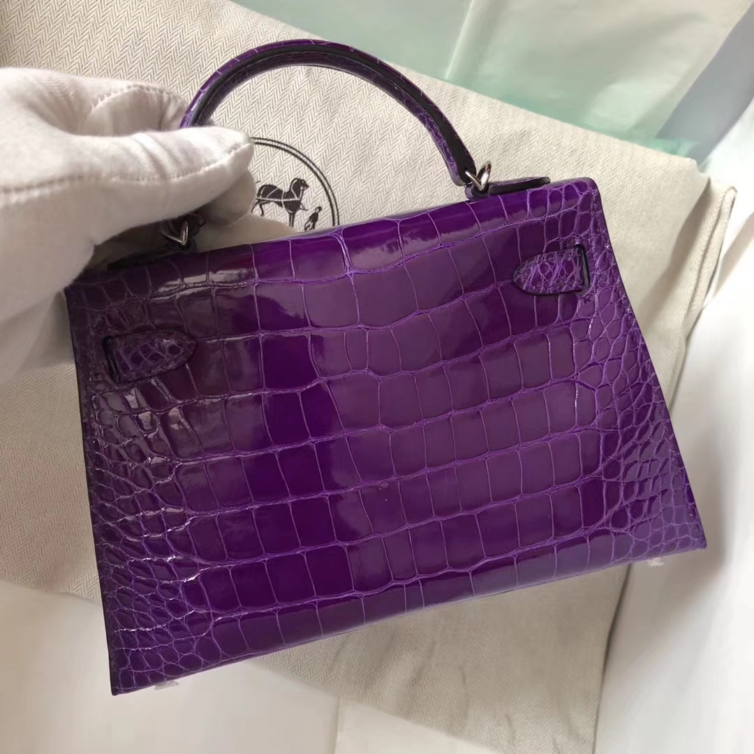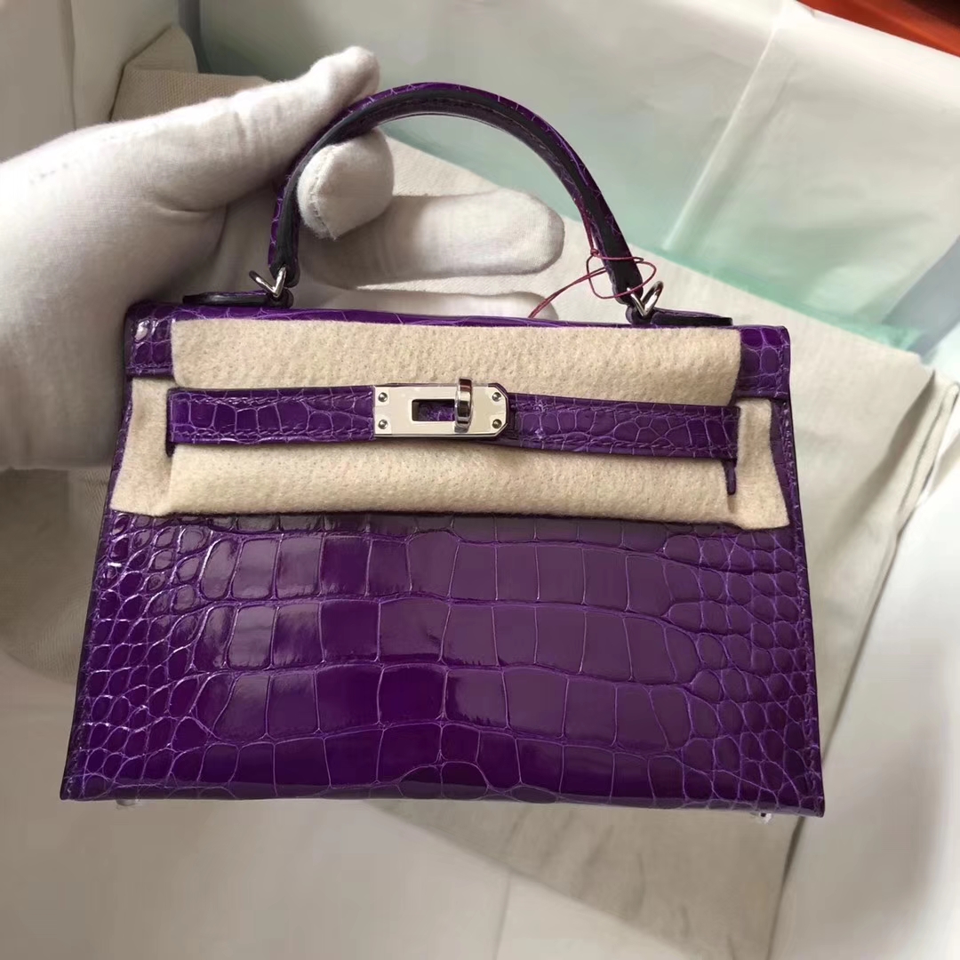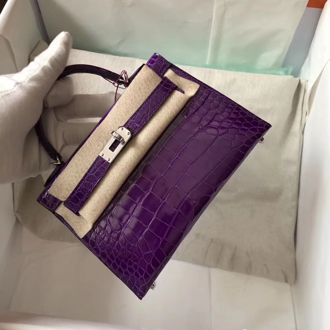 Hermès(爱马仕)Minikelly ll Alligator shiny 亮面鳄鱼 5L 极度紫 银扣 2018年12月23日 0 【鳄鱼世家】www.Eyubao.com Mini Kelly 2 Mini Kelly 迷你凯莉 品牌:Hermès(爱马仕);类别:Mini Kelly迷你凯莉包;颜色:极度紫;材质:亮面鳄鱼;等级:顶级;附件:全套包装礼盒;功能:手提单肩包