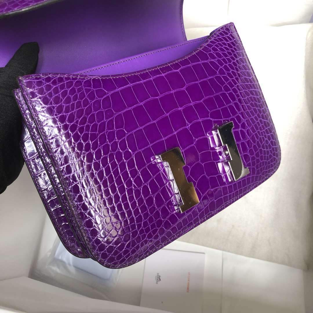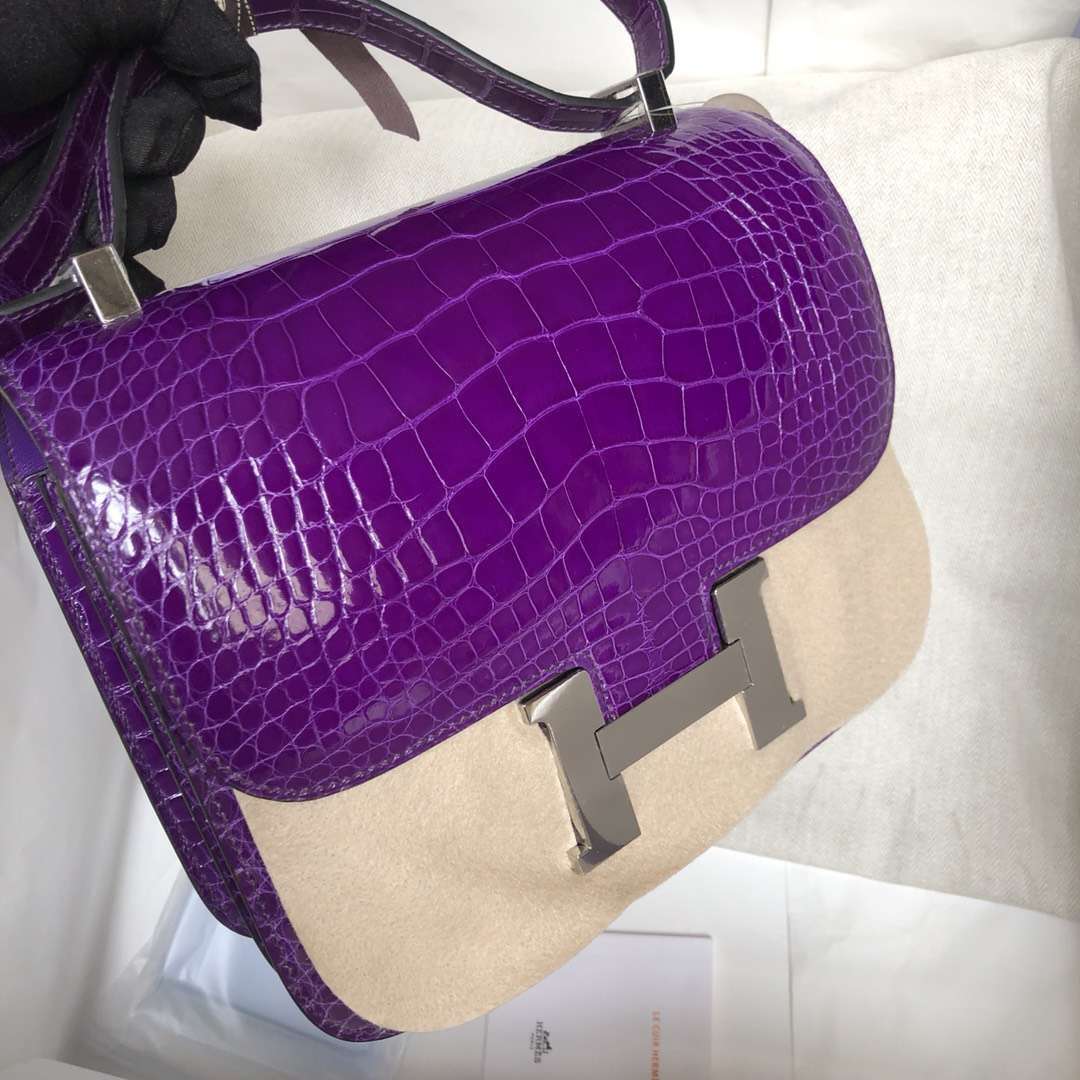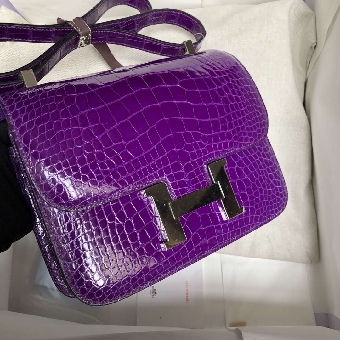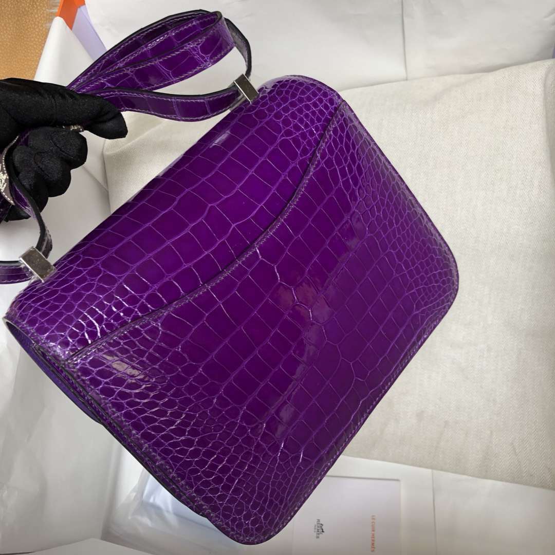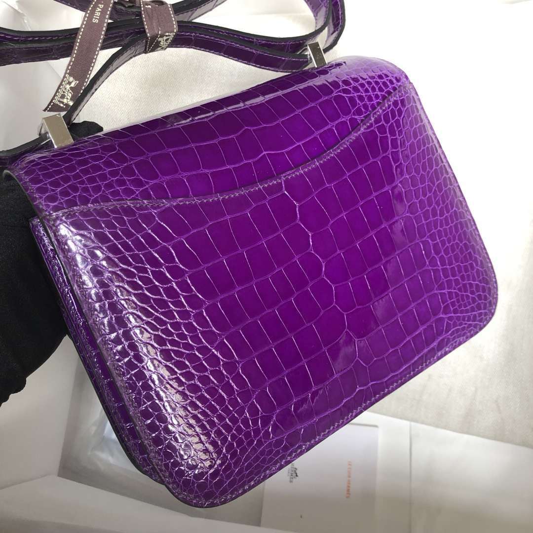 Hermès(爱马仕)Constance Alligator shiny 亮面方块鳄鱼 5L 极度紫 银扣 18cm 2019年1月18日 0 【鳄鱼世家】www.Eyubao.com Constance 18 Constance 空姐包 品牌:Hermès(爱马仕);类别:Constance 空姐包;颜色:极度紫;材质:亮面方块鳄鱼;等级:顶级;附件:全套包装礼盒;尺寸:18cm;功能:单肩背包