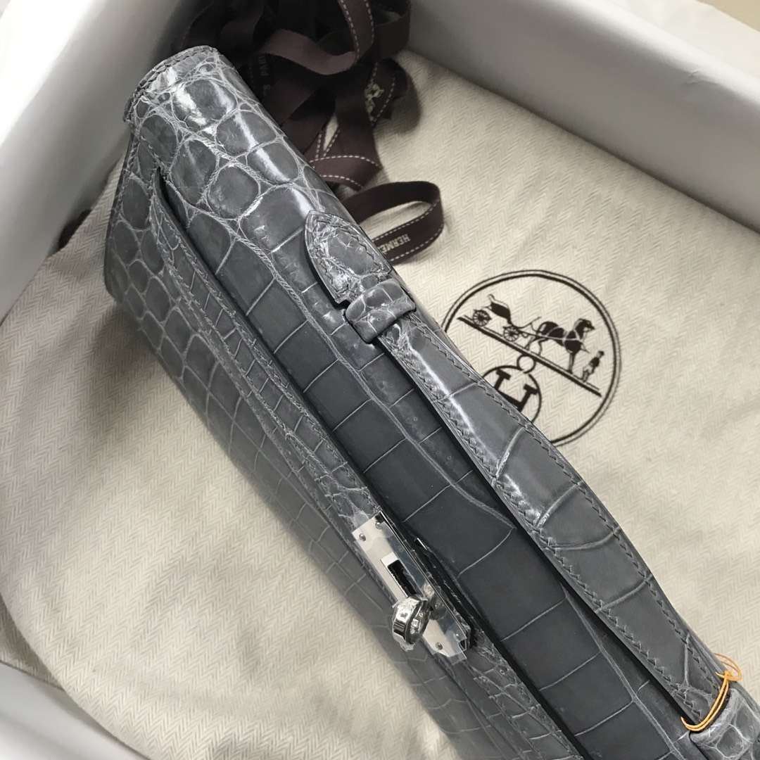 Hermès(爱马仕)Kelly cut Crocodile shiny 亮面鳄鱼 8F 铁灰 银扣 手拿包 31cm 2019年1月18日 0 【鳄鱼世家】www.Eyubao.com KellyCut 手拿包 品牌:Hermès(爱马仕);类别:Kelly cut长款钱包;颜色:铁灰;材质:亮面澳洲湾鳄;等级:顶级;附件:全套包装礼盒;尺寸:31cm;功能:手提单肩包