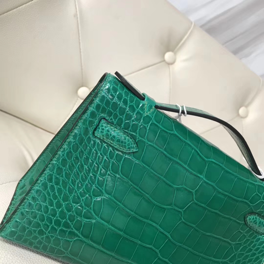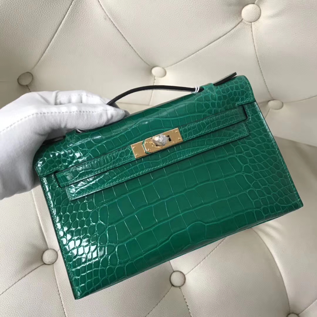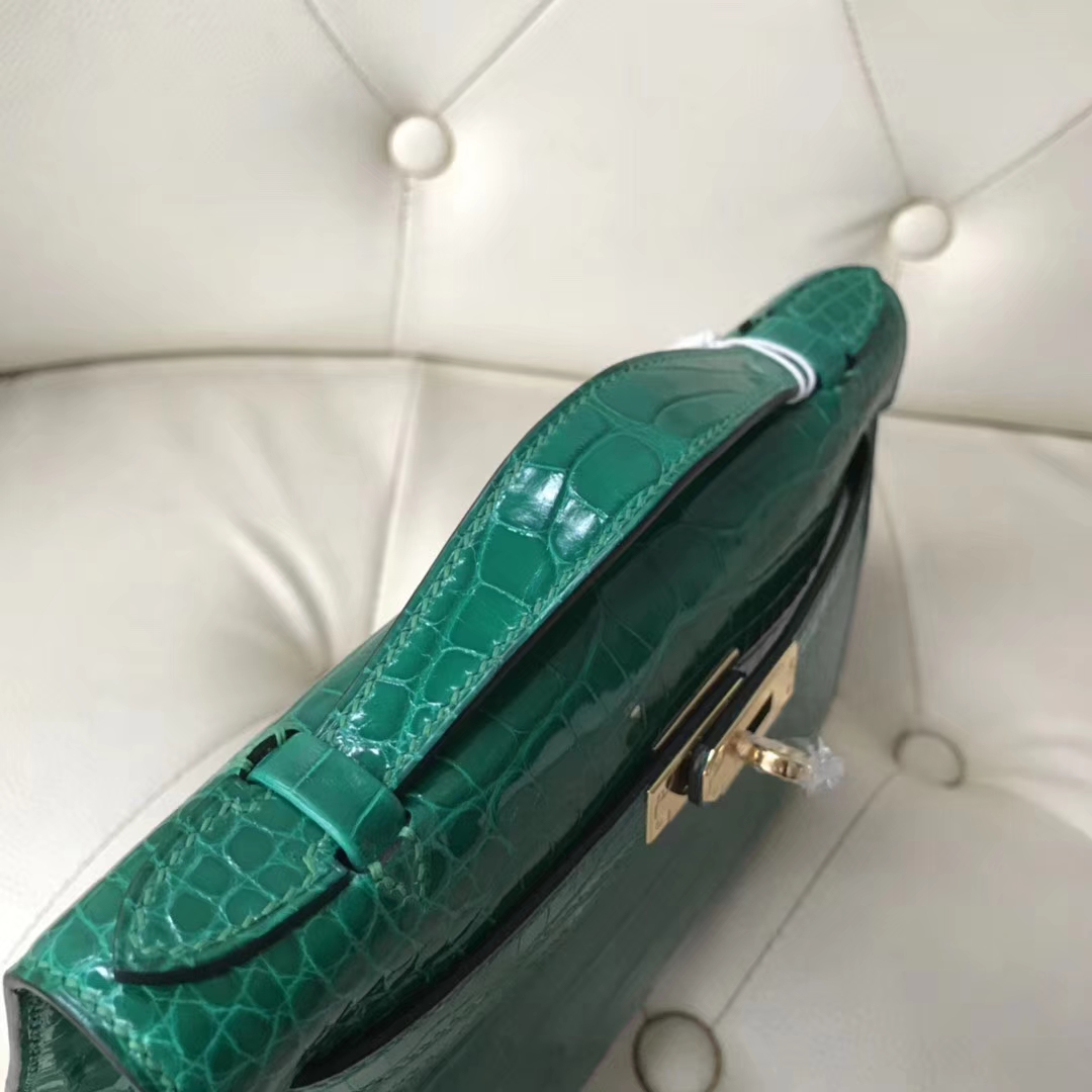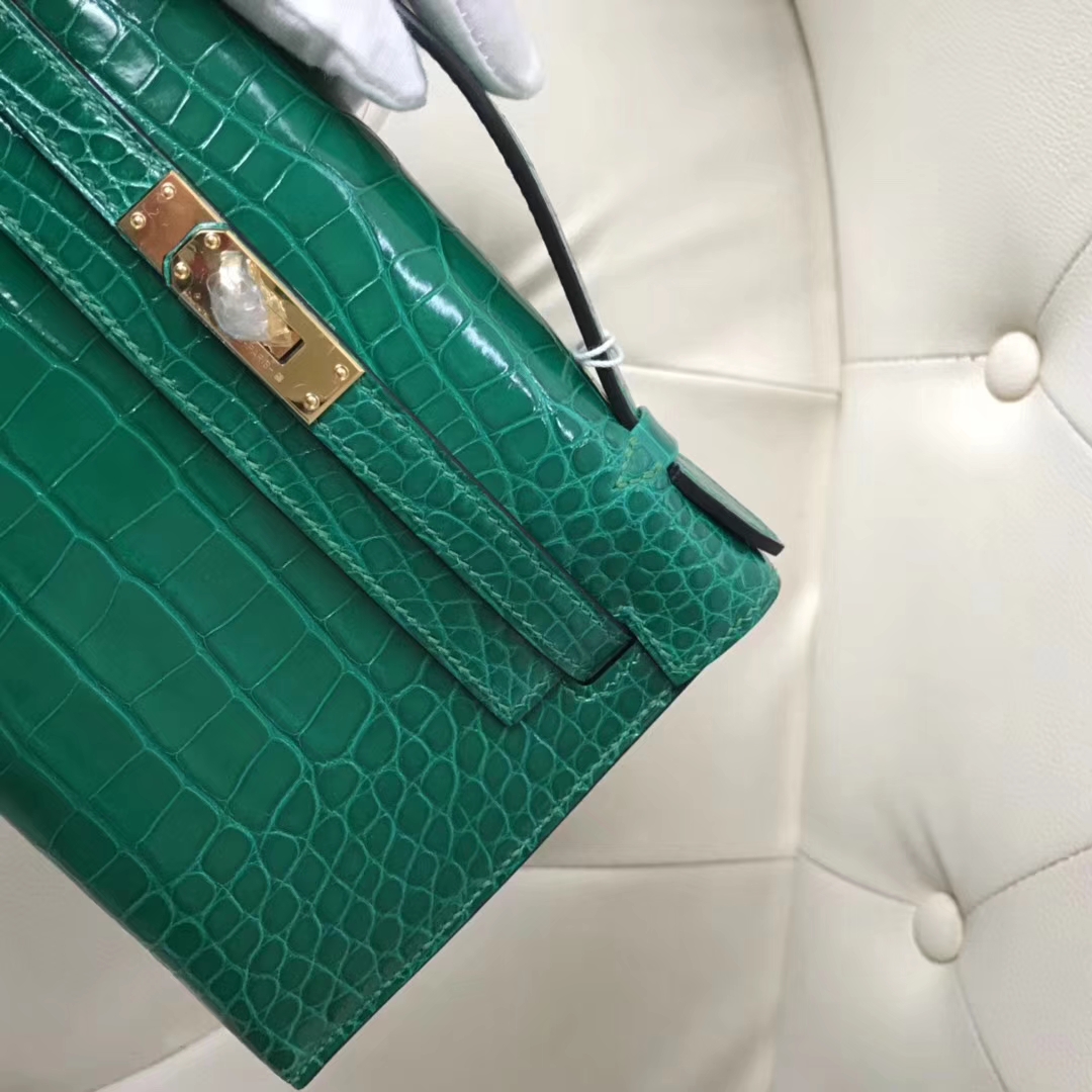 Hermès(爱马仕)Minikelly pochette 亮面鳄鱼 6Q 翡翠绿 金扣 手拿包 晚宴 22cm 2019年1月19日 0 【鳄鱼世家】www.Eyubao.com Mini Kelly 1 Mini Kelly 迷你凯莉 品牌:Hermès(爱马仕);类别:Mini Kelly迷你凯莉包;颜色:翡翠绿;材质:亮面鳄鱼;等级:顶级;附件:全套包装礼盒;功能:晚宴包、手拿包