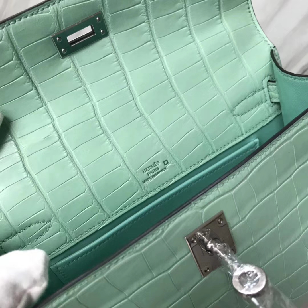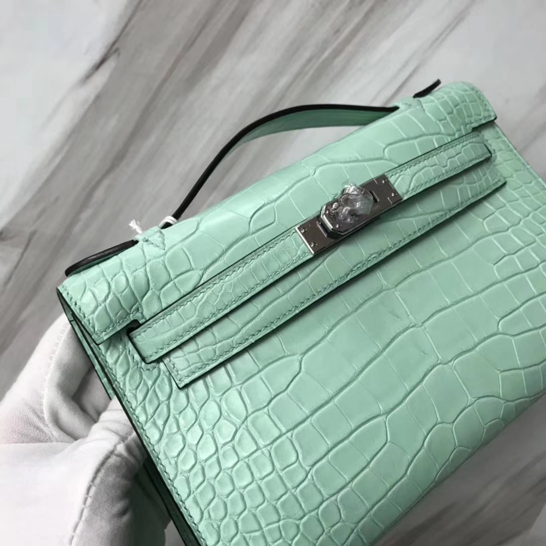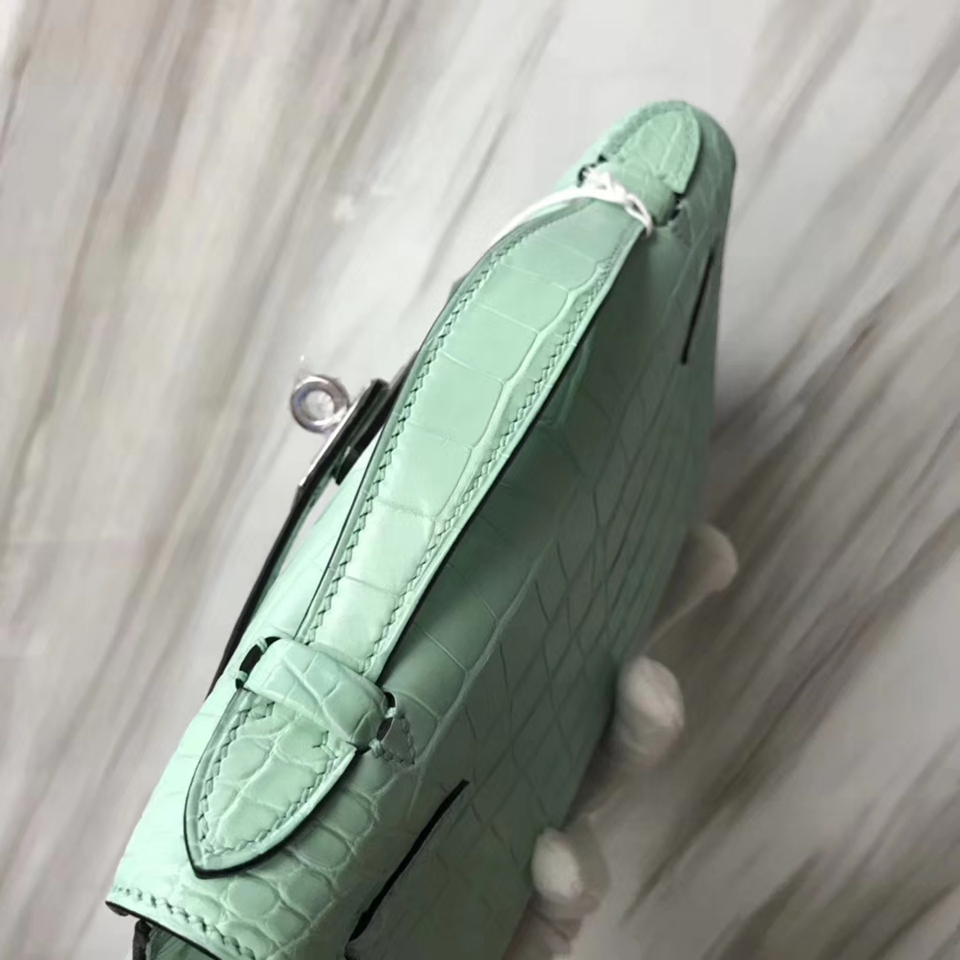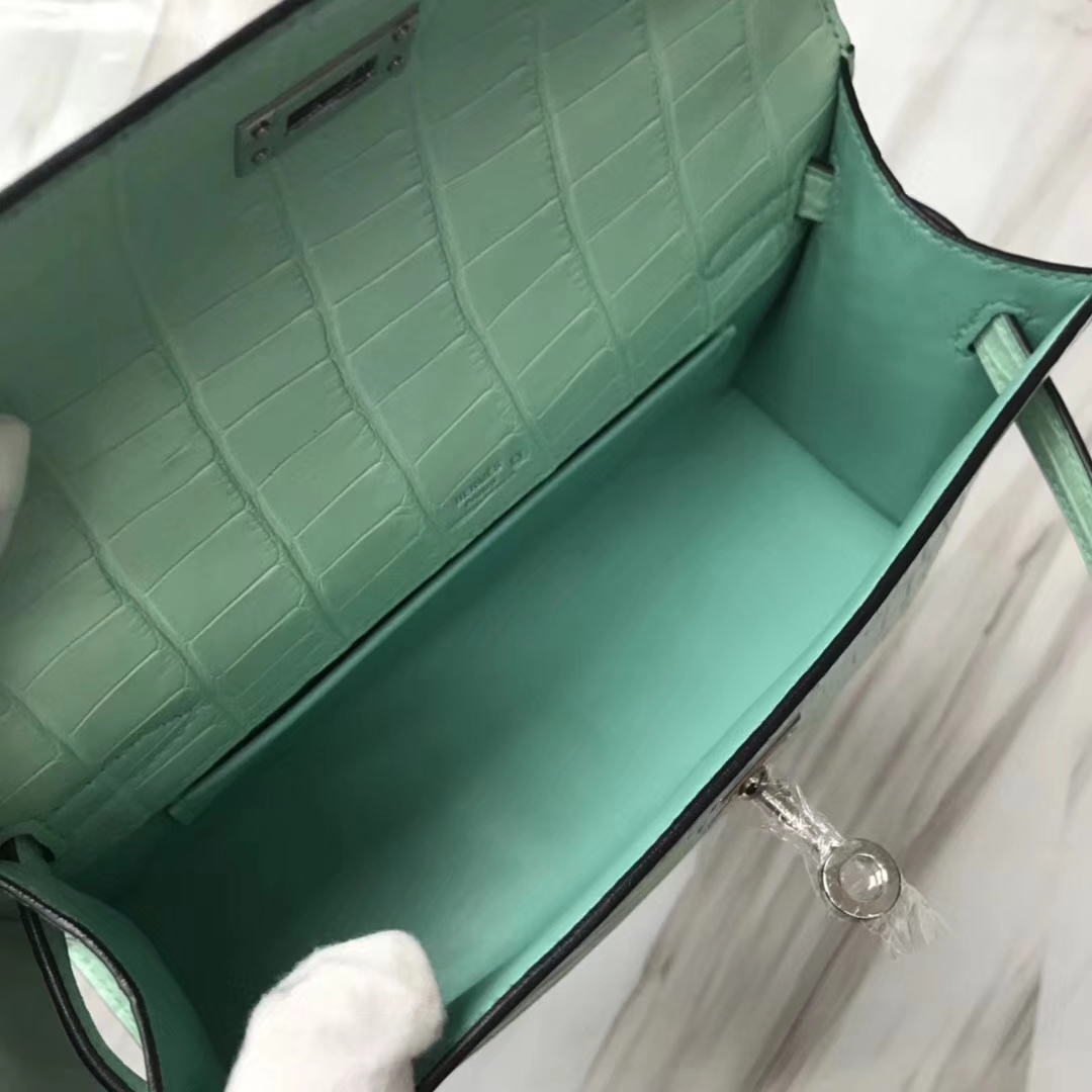 Hermès(爱马仕)Minikelly pochette 雾面鳄鱼 6U 薄荷绿 银扣 手拿包 晚宴包 22cm 2019年1月19日 0 【鳄鱼世家】www.Eyubao.com Mini Kelly 1 Mini Kelly 迷你凯莉 品牌:Hermès(爱马仕);类别:Mini Kelly迷你凯莉包;颜色: 薄荷绿;材质:雾面鳄鱼;等级:顶级;附件:全套包装礼盒;尺寸:22cm;功能:手提单肩包