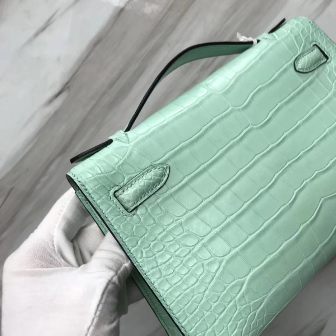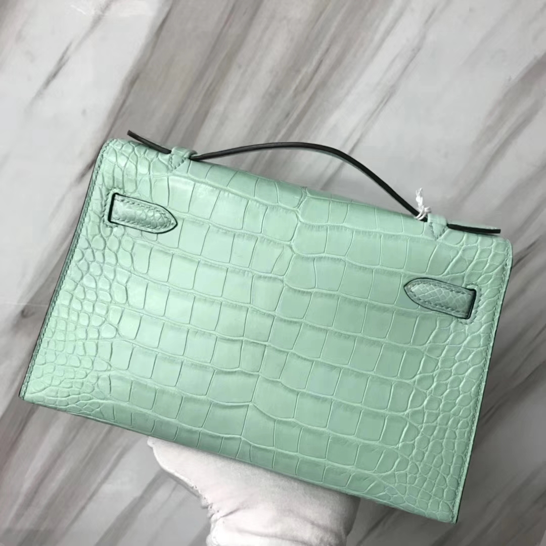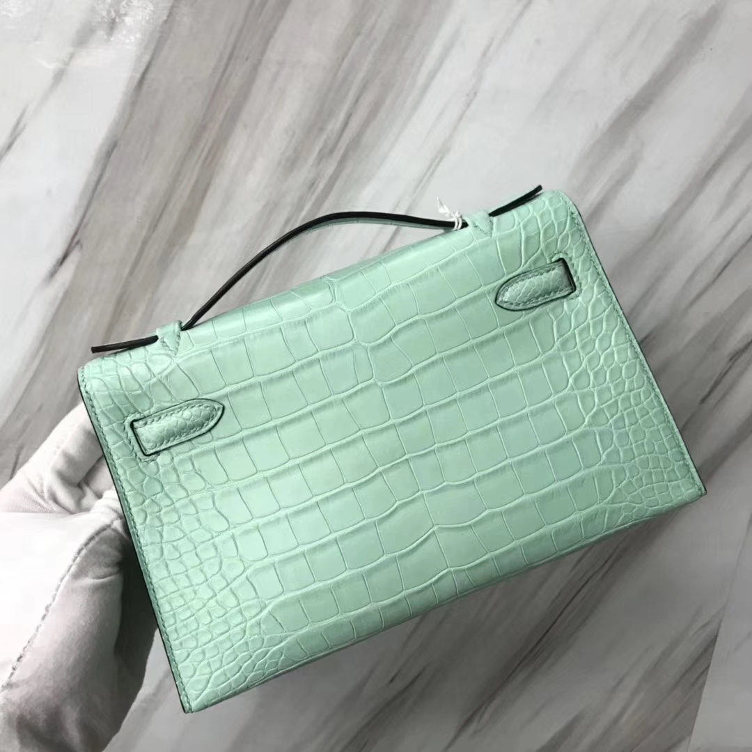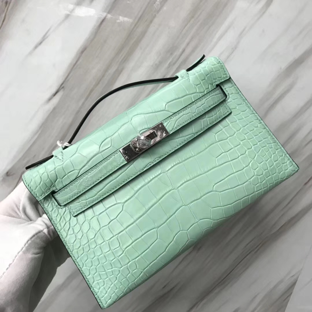 Hermès(爱马仕)Minikelly pochette 雾面鳄鱼 6U 薄荷绿 银扣 手拿包 晚宴包 22cm 2019年1月19日 0 【鳄鱼世家】www.Eyubao.com Mini Kelly 1 Mini Kelly 迷你凯莉 品牌:Hermès(爱马仕);类别:Mini Kelly迷你凯莉包;颜色: 薄荷绿;材质:雾面鳄鱼;等级:顶级;附件:全套包装礼盒;尺寸:22cm;功能:手提单肩包