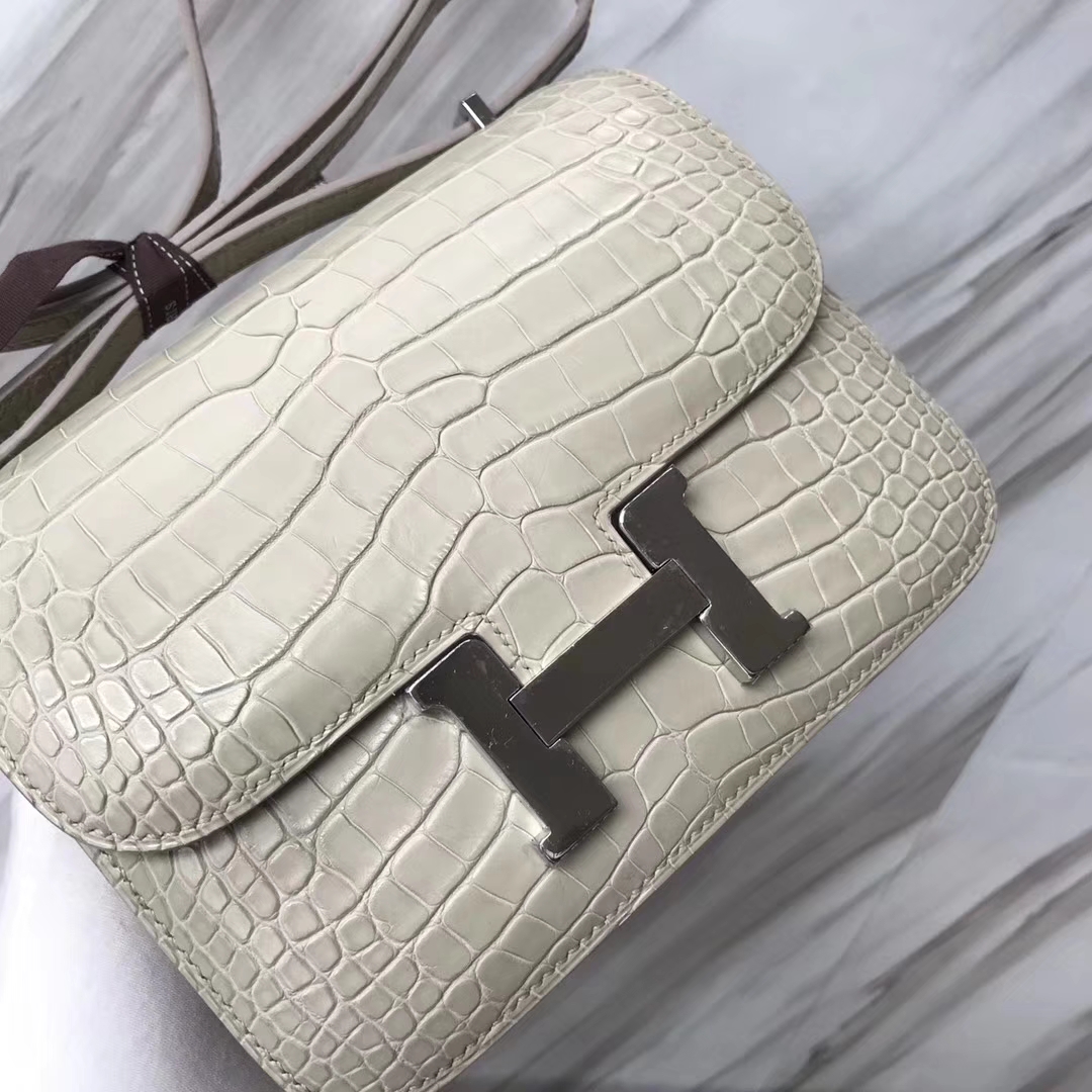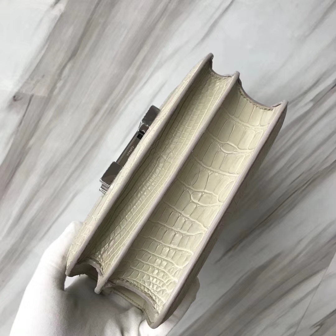 Hermès(爱马仕)Costance Crocodile matt 雾面鳄鱼 8L 奶油白 Beton 银扣 18cm 2019年3月1日 0 【鳄鱼世家】www.Eyubao.com Constance 18 Constance 空姐包 品牌:Hermès(爱马仕);类别:Constance 空姐包;颜色:奶油白;材质:雾面鳄鱼;等级:顶级;附件:全套包装礼盒;尺寸:18cm;功能:单肩背包