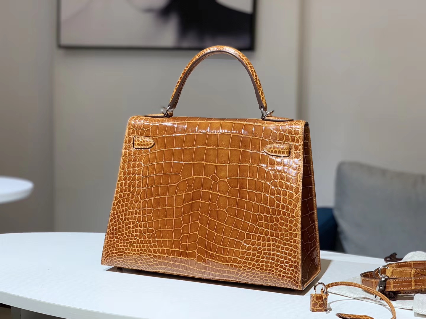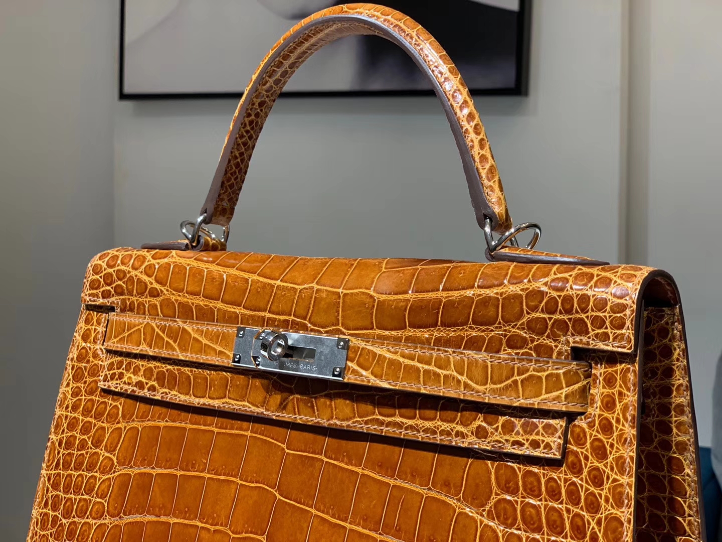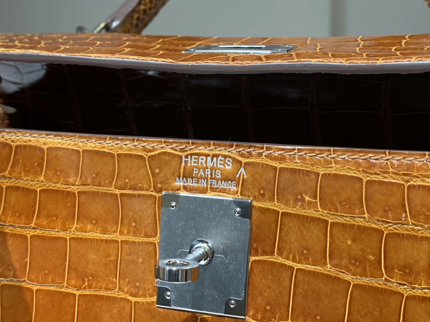 Hermès(爱马仕)Kelly凯莉包 4g 焦糖色 brulee 25cm 配全套专柜原版包装 2019年3月16日 0 【鳄鱼世家】www.Eyubao.com Kelly 25 Kelly 凯莉包 品牌:Hermès(爱马仕);类别:Kelly 凯莉包;颜色:焦糖色;材质:鳄鱼皮;等级:顶级;附件:全套包装礼盒;尺寸:25cm;功能:手提单肩包