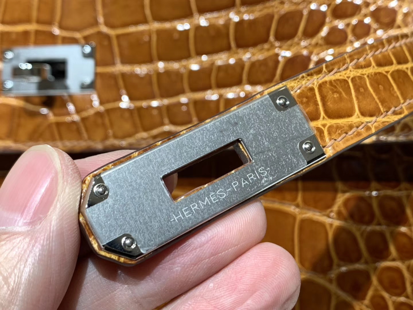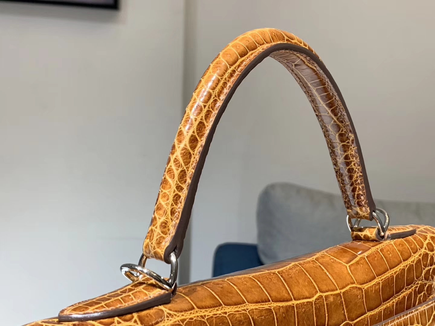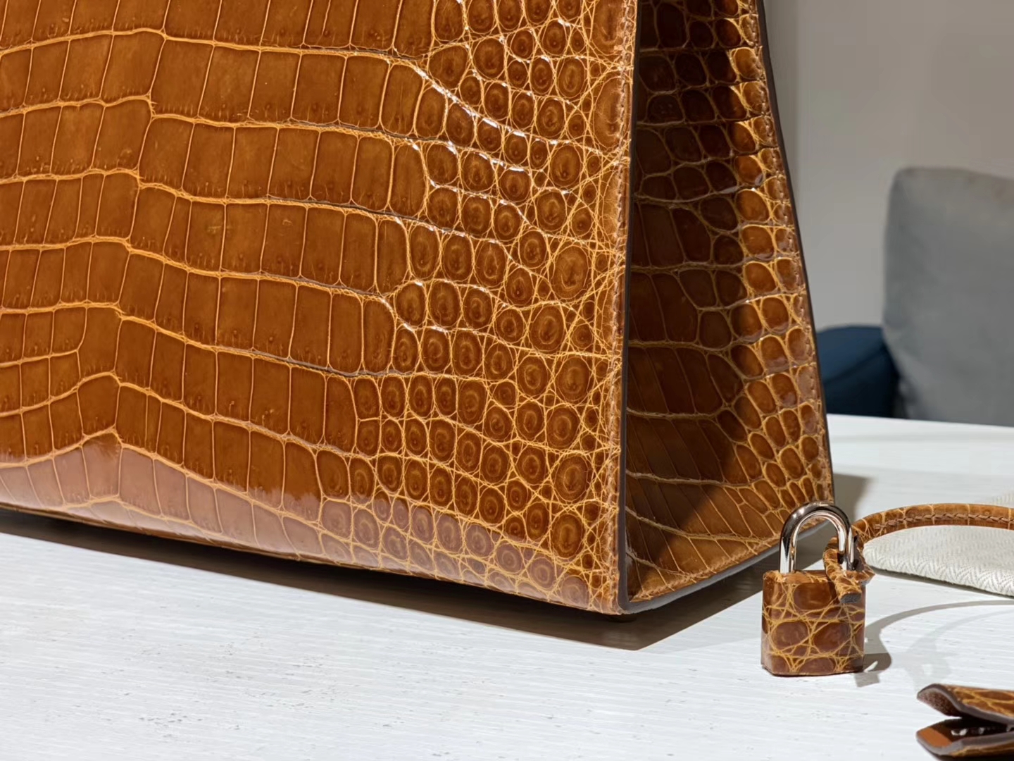 Hermès(爱马仕)Kelly凯莉包 4g 焦糖色 brulee 25cm 配全套专柜原版包装 2019年3月16日 0 【鳄鱼世家】www.Eyubao.com Kelly 25 Kelly 凯莉包 品牌:Hermès(爱马仕);类别:Kelly 凯莉包;颜色:焦糖色;材质:鳄鱼皮;等级:顶级;附件:全套包装礼盒;尺寸:25cm;功能:手提单肩包