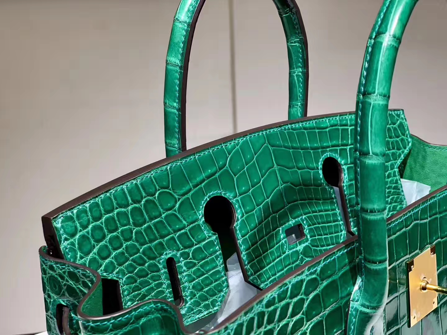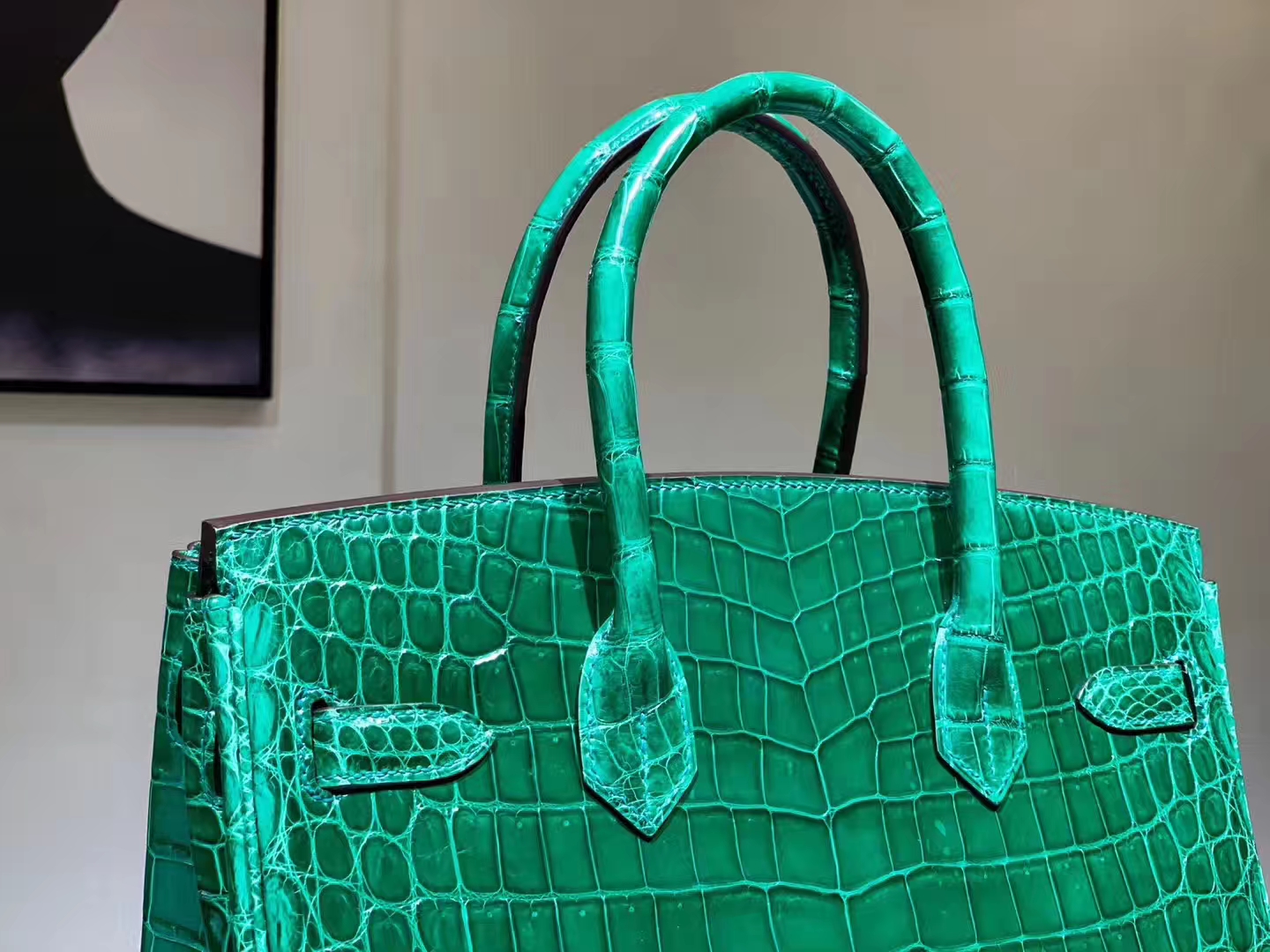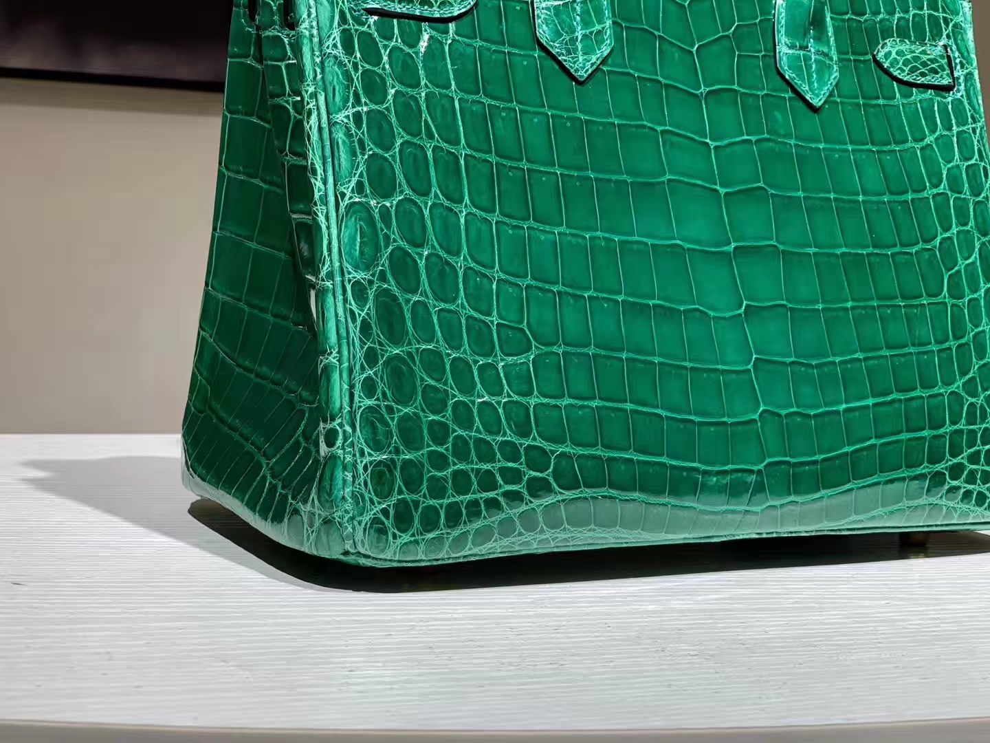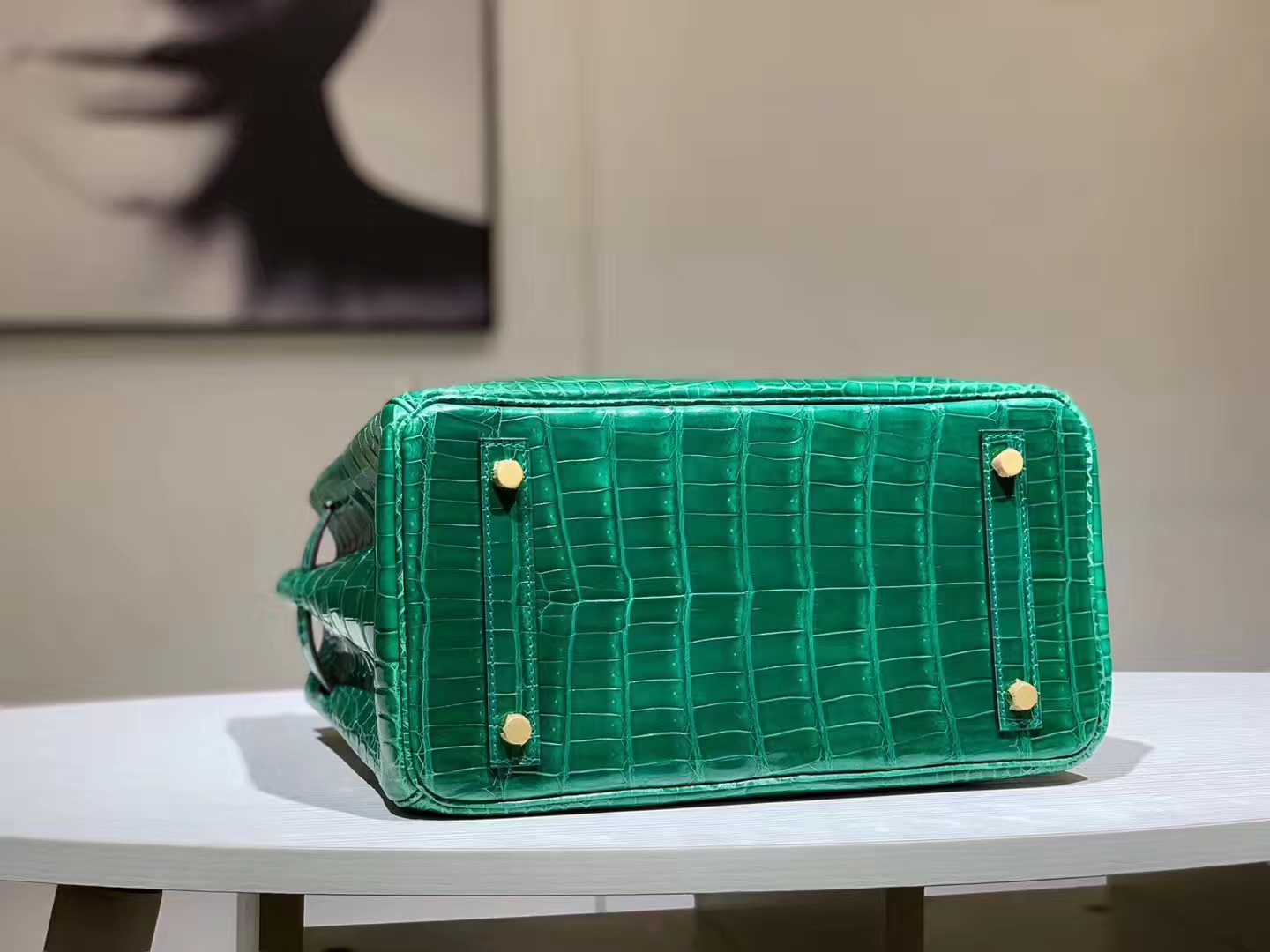 Hermès(爱马仕)Birkin 铂金包 鳄鱼皮 翡翠绿 25cm 金扣 现货 2019年3月16日 0 【鳄鱼世家】www.Eyubao.com Birkin 25 Birkin 铂金包 品牌:Hermès(爱马仕);类别:Birkin 铂金包;颜色:翡翠绿;材质:亮光鳄鱼皮;等级:顶级;附件:全套包装礼盒;尺寸:25cm;功能:手提单肩包