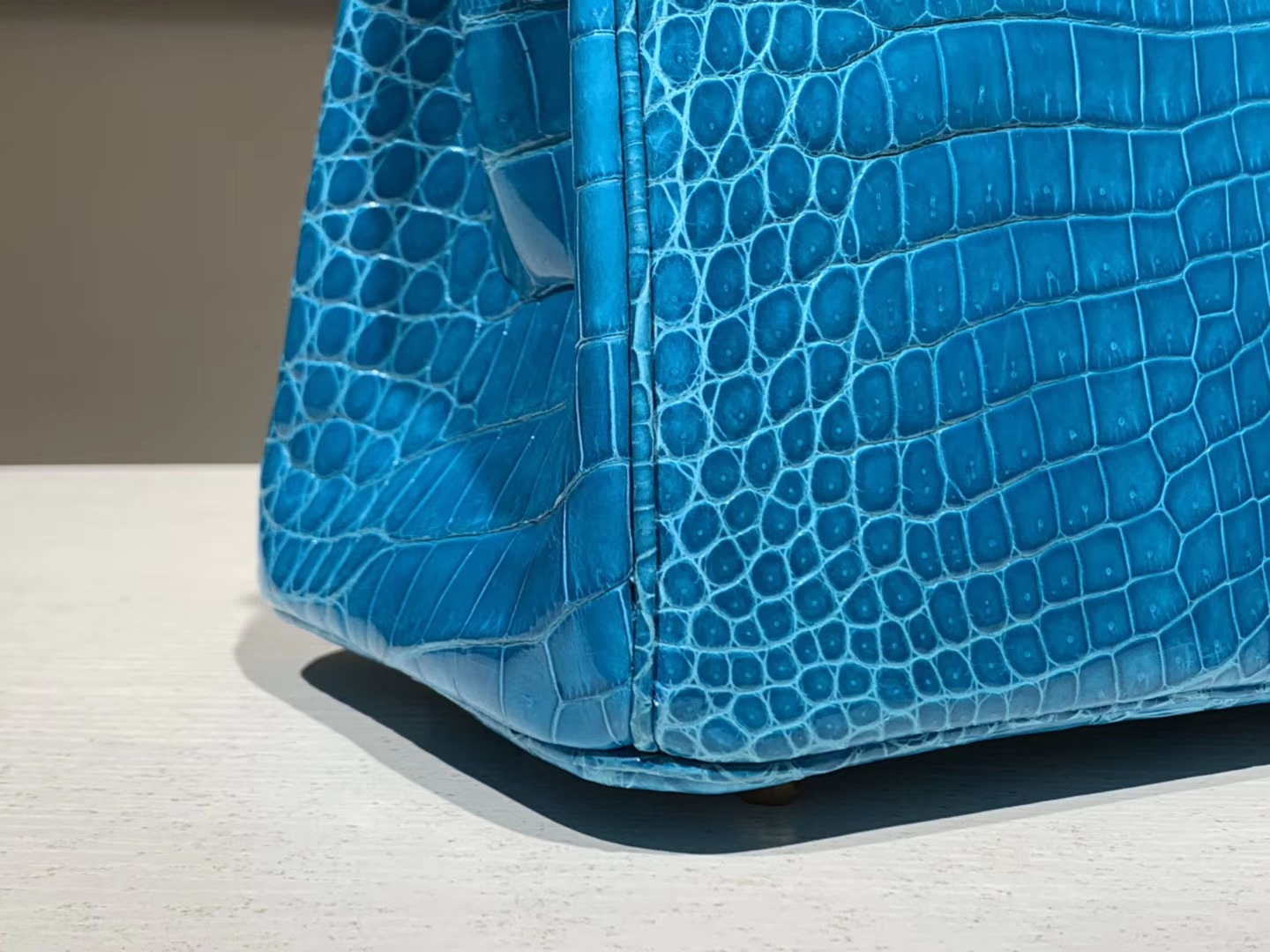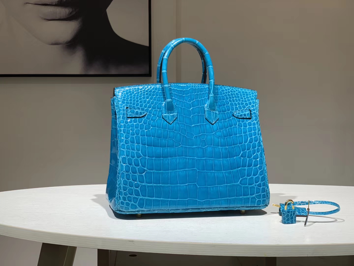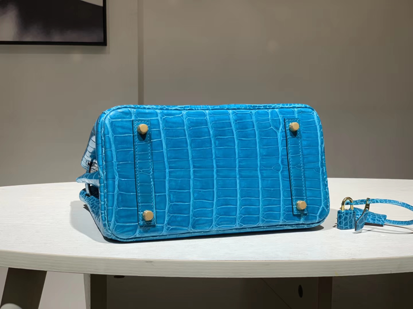 Hermès(爱马仕)Brikin铂金包 鳄鱼皮 湖水蓝 现货 25cm 2019年3月18日 0 【鳄鱼世家】www.Eyubao.com Birkin 25 Birkin 铂金包 品牌:Hermès(爱马仕);类别:Brikin 铂金包;颜色:湖水蓝;材质:鳄鱼皮;等级:顶级;附件:全套包装礼盒;尺寸:25cm;功能:单肩背包