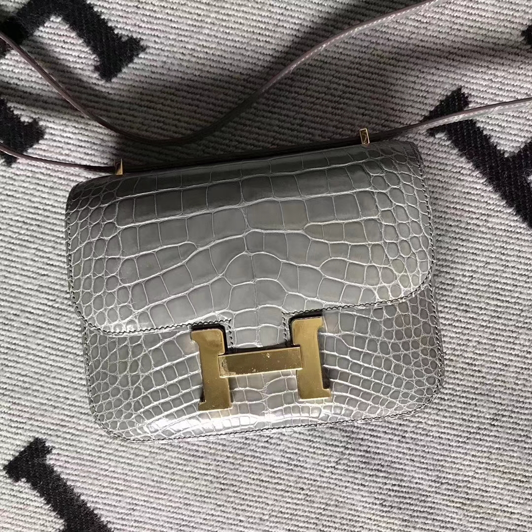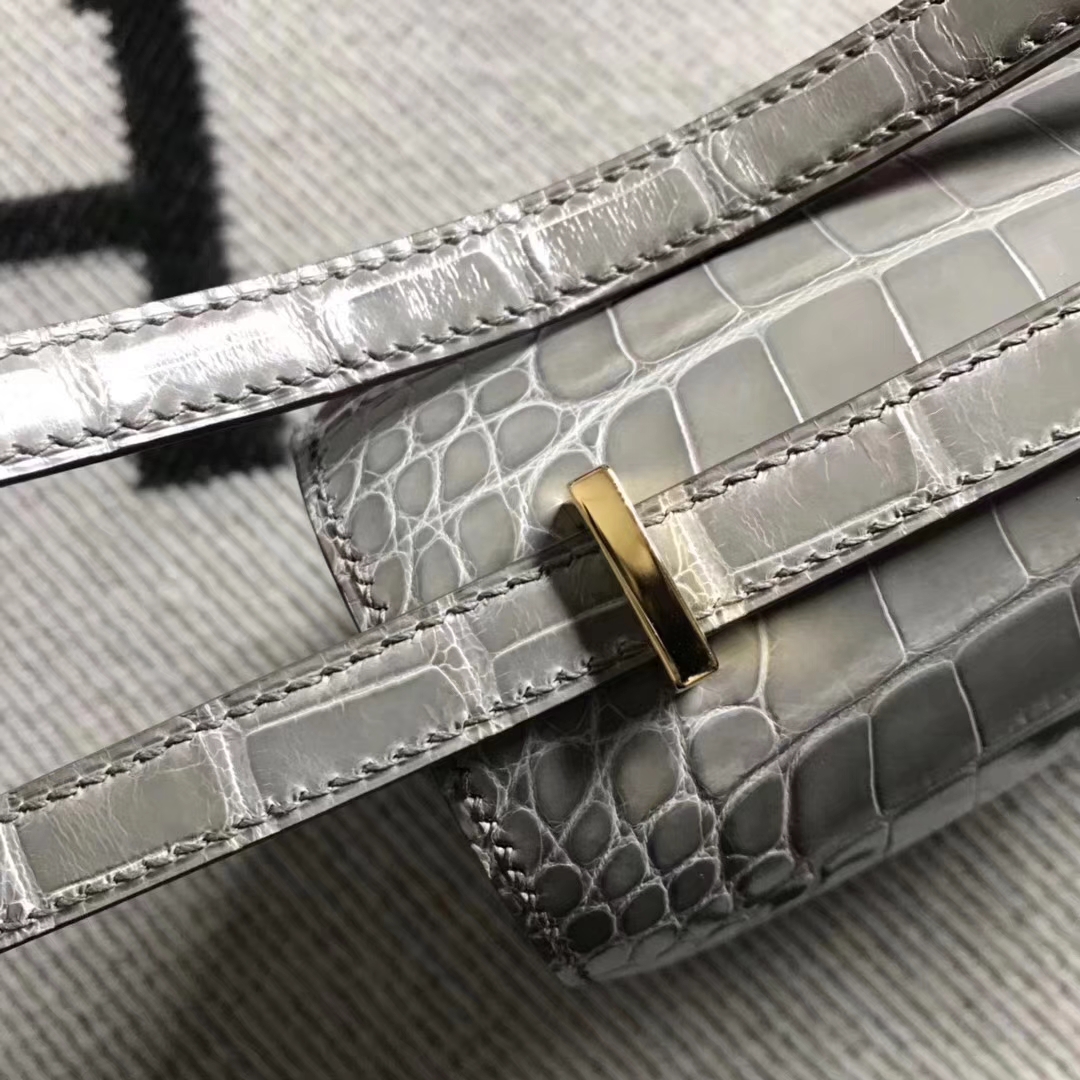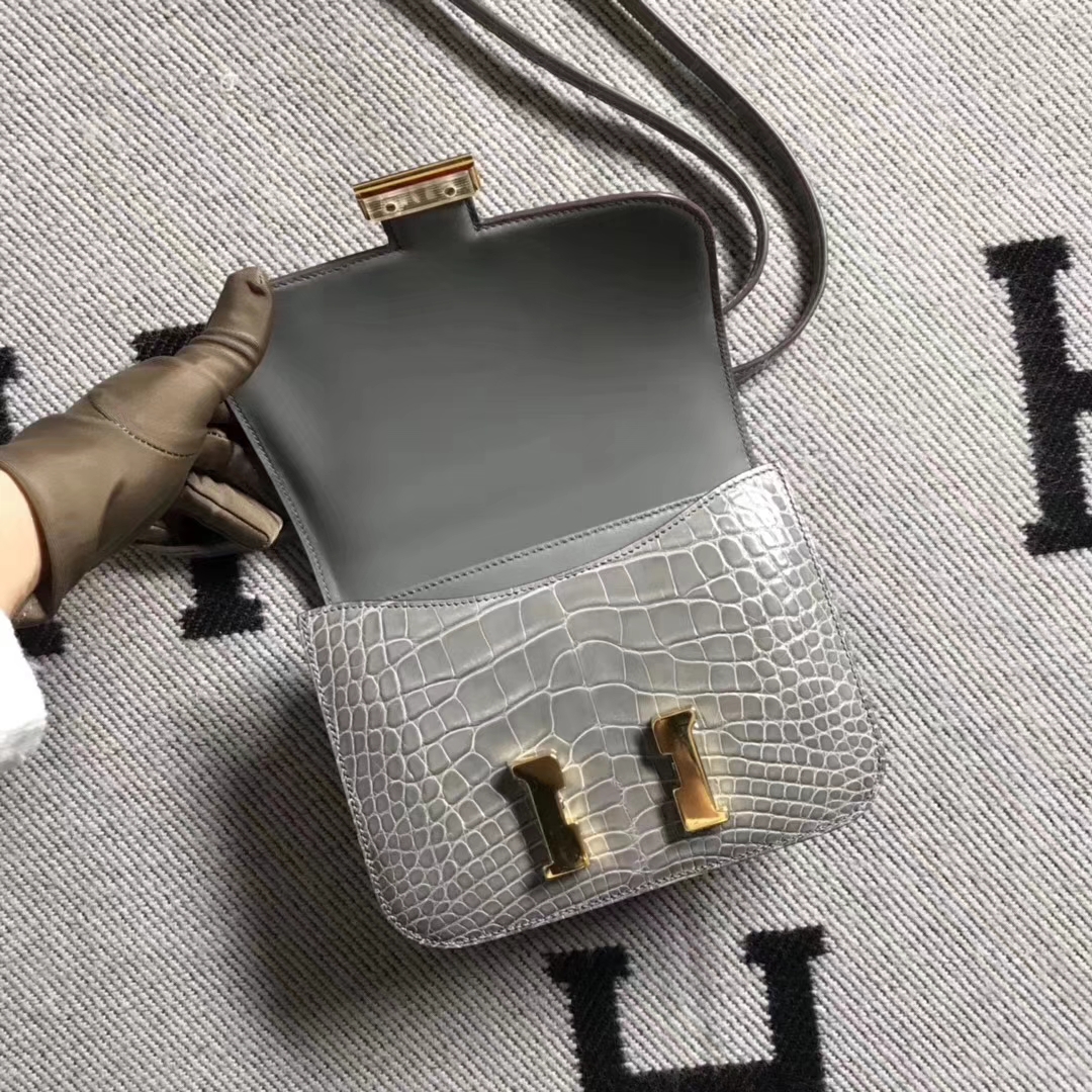 Hermès(爱马仕)空姐包 斑鸠灰 美洲鳄 金扣 现货 19cm 2019年4月13日 0 【鳄鱼世家】www.Eyubao.com Constance 19 Constance 空姐包 品牌:Hermès(爱马仕);类别:Constance 空姐包;颜色:斑鸠灰;材质:精选美洲鳄;等级:顶级;附件:全套包装礼盒;尺寸:19cm;功能:单肩背包