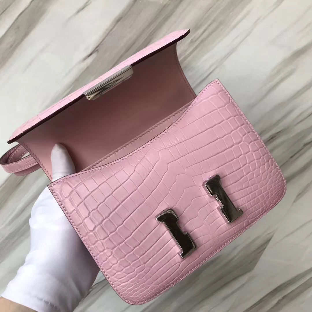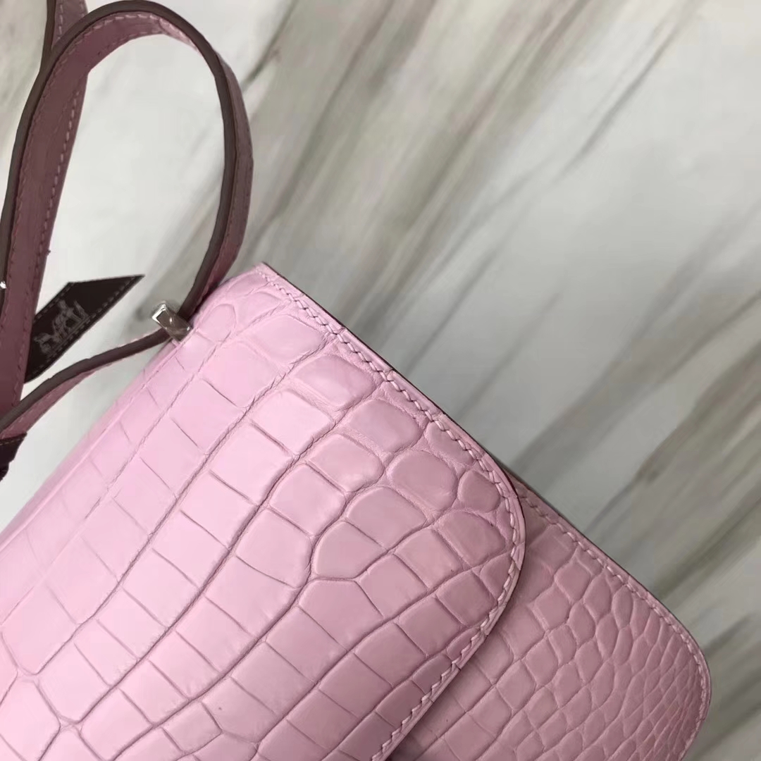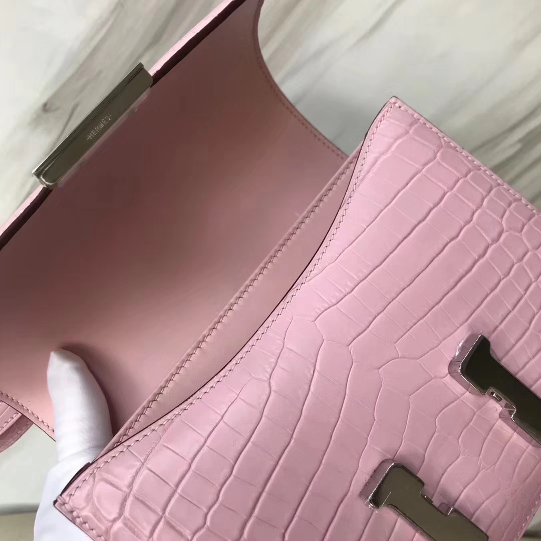 Hermès(爱马仕)Constance空姐包 Crocodile matt 雾面鳄鱼 5p 樱花粉 银扣 18cm 顶级现货 2019年4月18日 0 【鳄鱼世家】www.Eyubao.com Constance 18 Constance 空姐包 品牌:Hermès(爱马仕);类别:Constance 空姐包;颜色:樱花粉;材质: 雾面鳄鱼;等级:顶级;附件:全套包装礼盒;尺寸:18cm;功能:单肩背包
