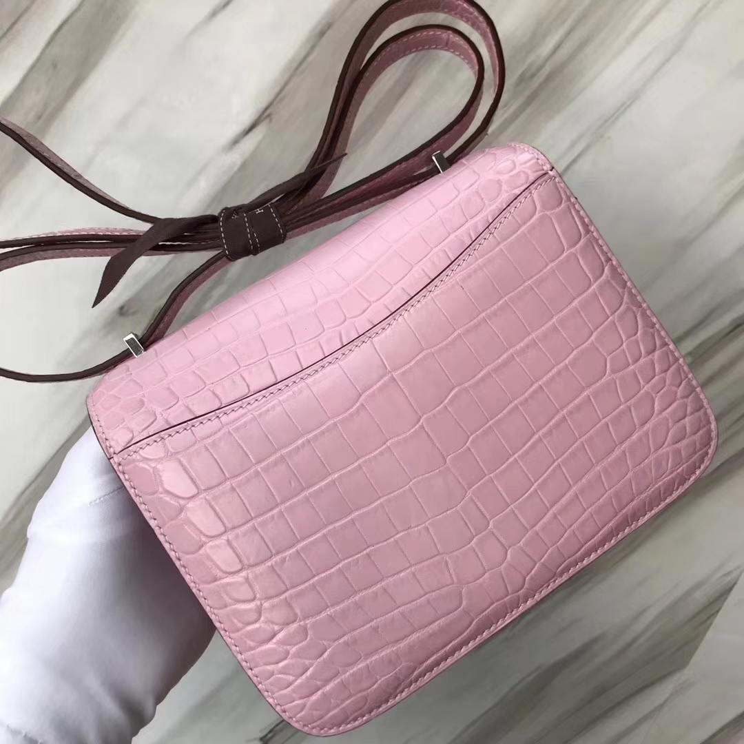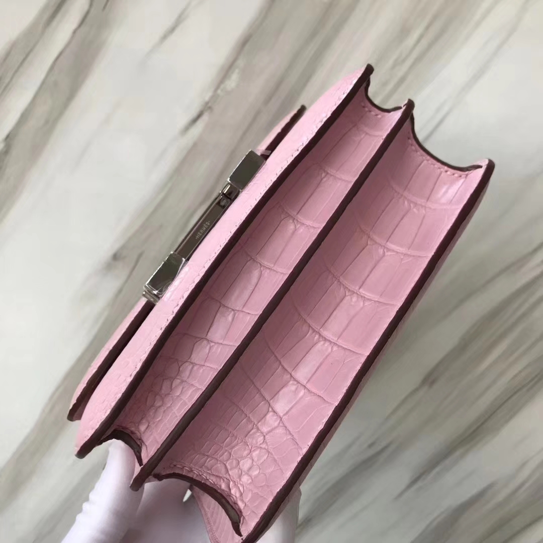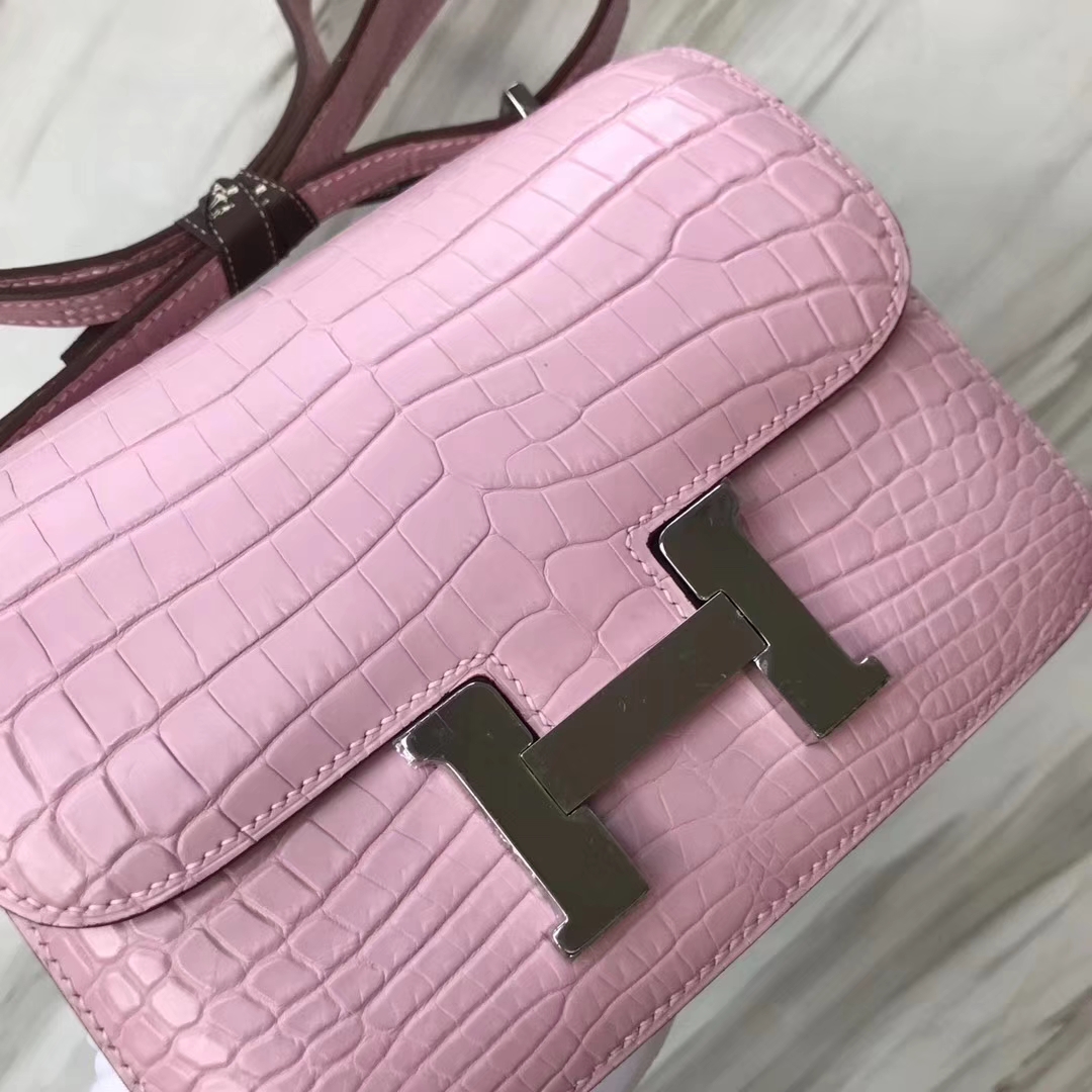 Hermès(爱马仕)Constance空姐包 Crocodile matt 雾面鳄鱼 5p 樱花粉 银扣 18cm 顶级现货 2019年4月18日 0 【鳄鱼世家】www.Eyubao.com Constance 18 Constance 空姐包 品牌:Hermès(爱马仕);类别:Constance 空姐包;颜色:樱花粉;材质: 雾面鳄鱼;等级:顶级;附件:全套包装礼盒;尺寸:18cm;功能:单肩背包