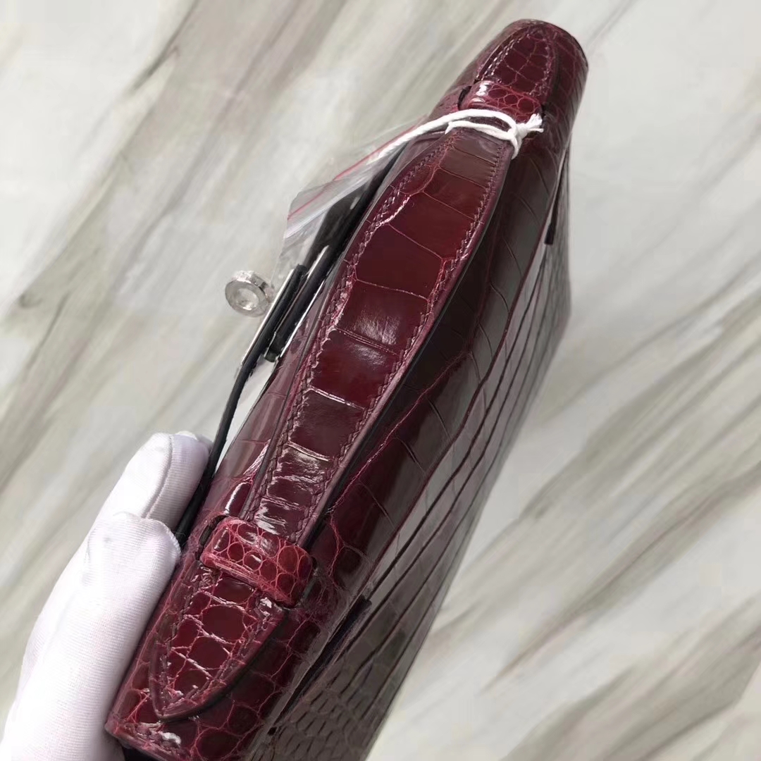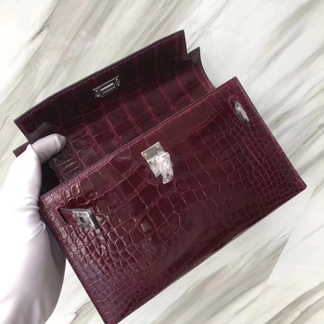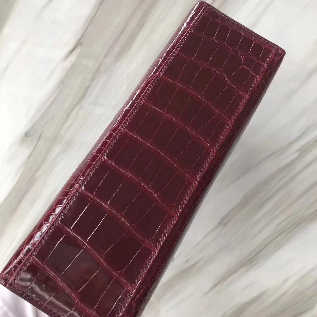 Hermès(爱马仕)Mini Kelly 亮面框框美洲鳄 F5勃艮第酒红 顶级工艺 蜡线全手工 银扣 22cm 2019年5月24日 0 【鳄鱼世家】www.Eyubao.com Mini Kelly 1 Mini Kelly 迷你凯莉 品牌:Hermès(爱马仕);类别:Mini Kelly迷你凯莉包;颜色: 勃艮第酒红;材质:亮面框框美洲鳄;等级:顶级;附件:全套包装礼盒;尺寸:22cm;功能:手提单肩包