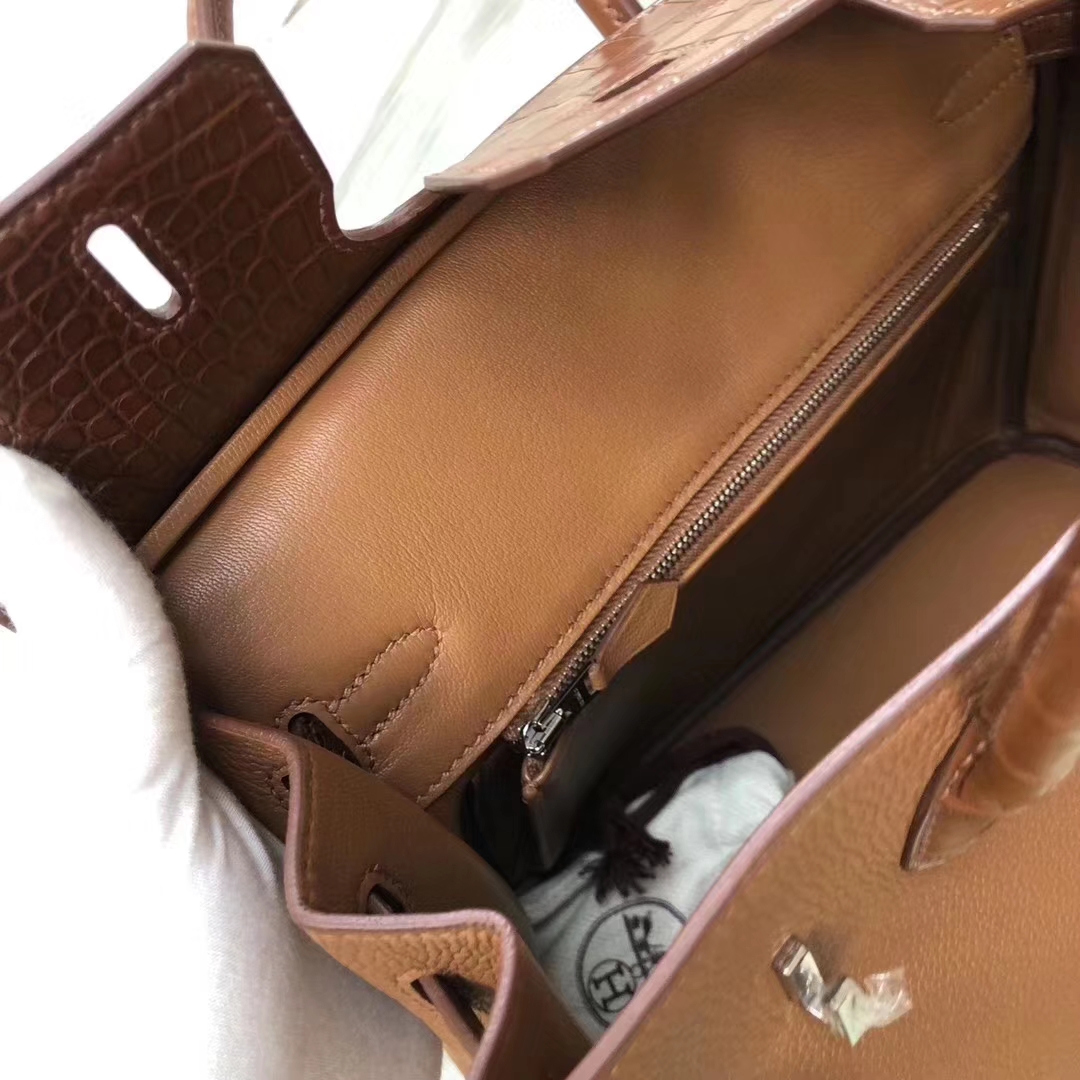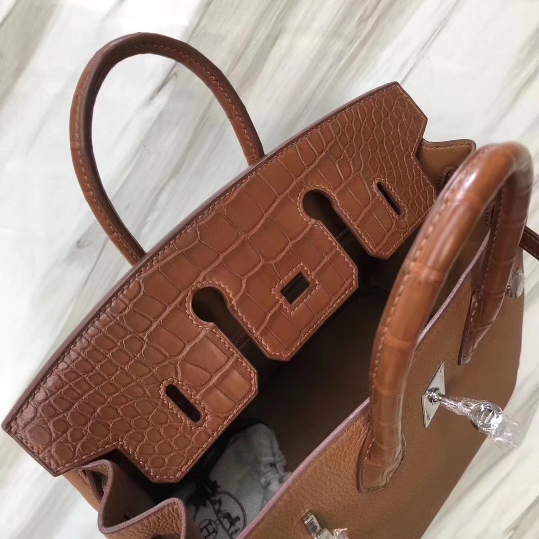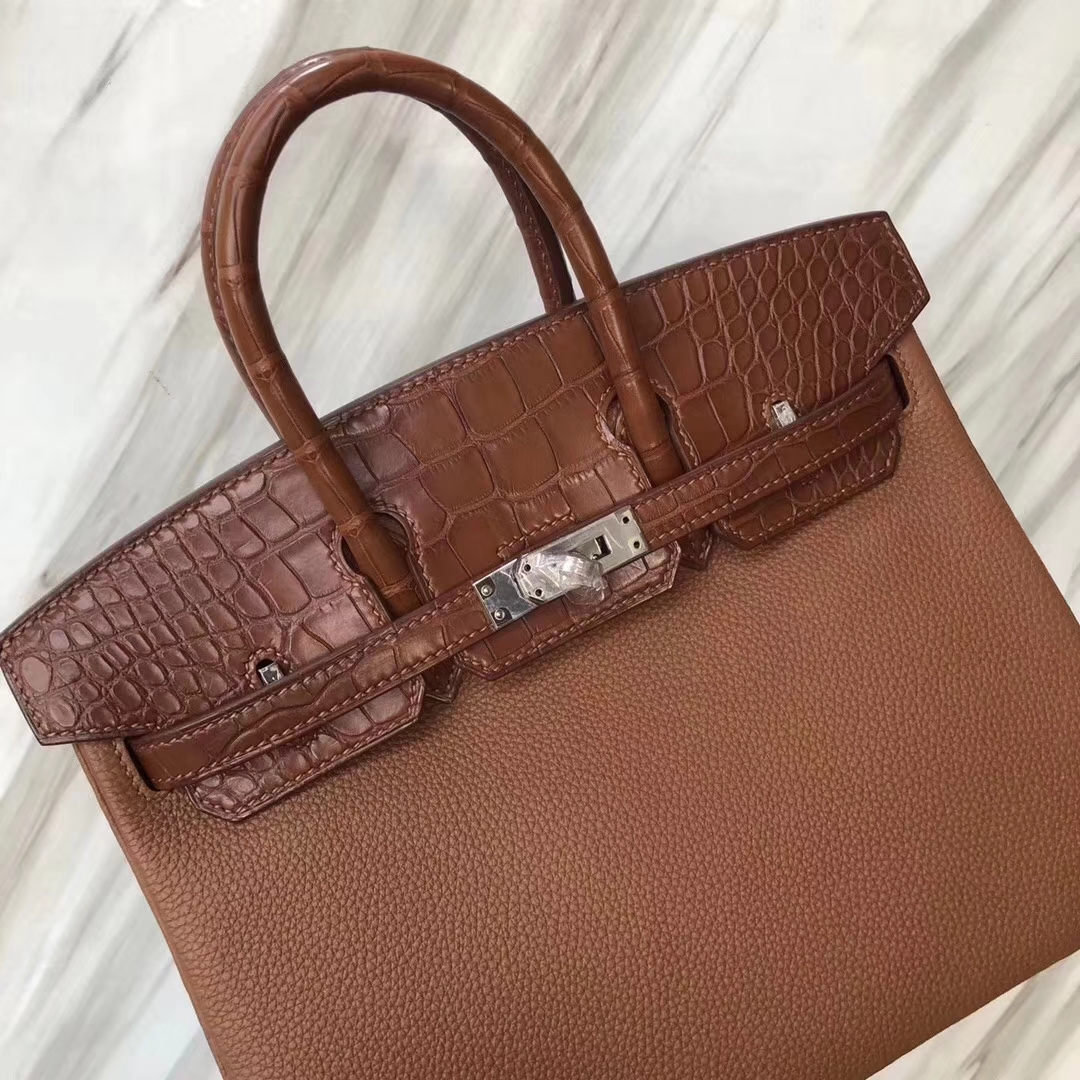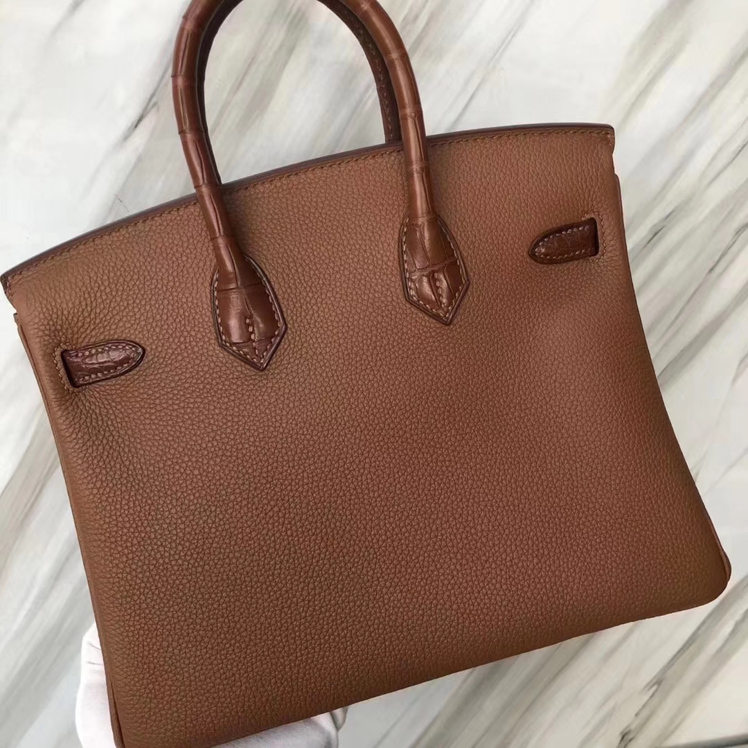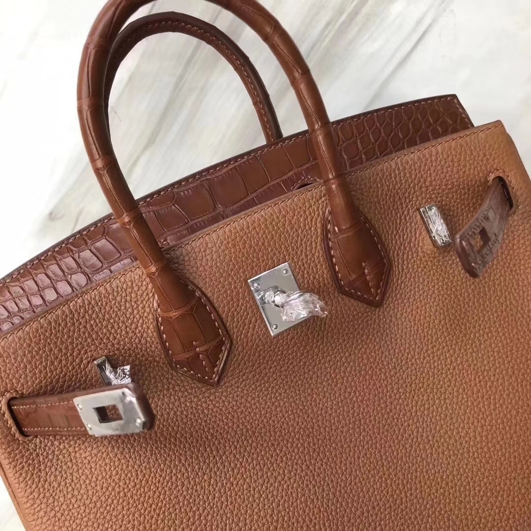 Hermès(爱马仕)Birkin铂金包 金棕色 touch 雾面鳄鱼拼小牛皮 玫瑰金 25cm 2019年6月7日 0 【鳄鱼世家】www.Eyubao.com Birkin 25 Birkin 铂金包 品牌:Hermès(爱马仕);类别:Birkin 铂金包;颜色:金棕色;材质:雾面鳄鱼拼小牛皮;等级:顶级;附件:全套包装礼盒;尺寸:25cm;功能:手提单肩包