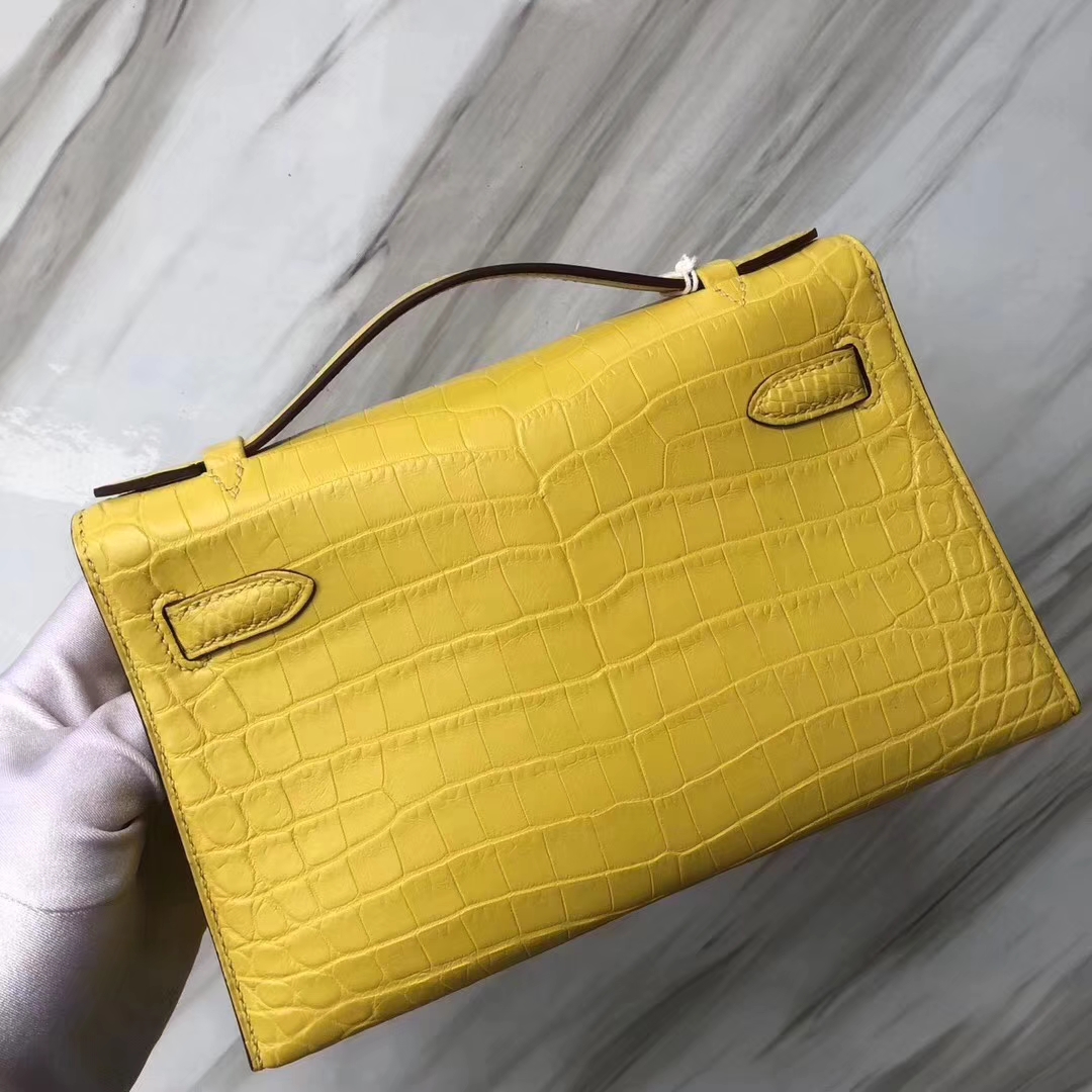 Hermès(爱马仕)Mini Kelly Crocodile matt 雾面鳄鱼 9R柠檬黄 金扣 手拿包 晚宴包 22cm 2019年6月21日 0 【鳄鱼世家】www.Eyubao.com Mini Kelly 1 Mini Kelly 迷你凯莉 品牌:Hermès(爱马仕);类别:Mini Kelly迷你凯莉包;颜色:柠檬黄;材质:雾面鳄鱼;等级:顶级;附件:全套包装礼盒;尺寸:22cm;功能:手提单肩包
