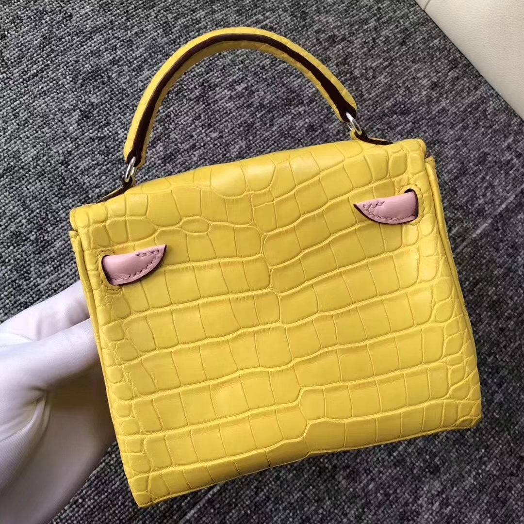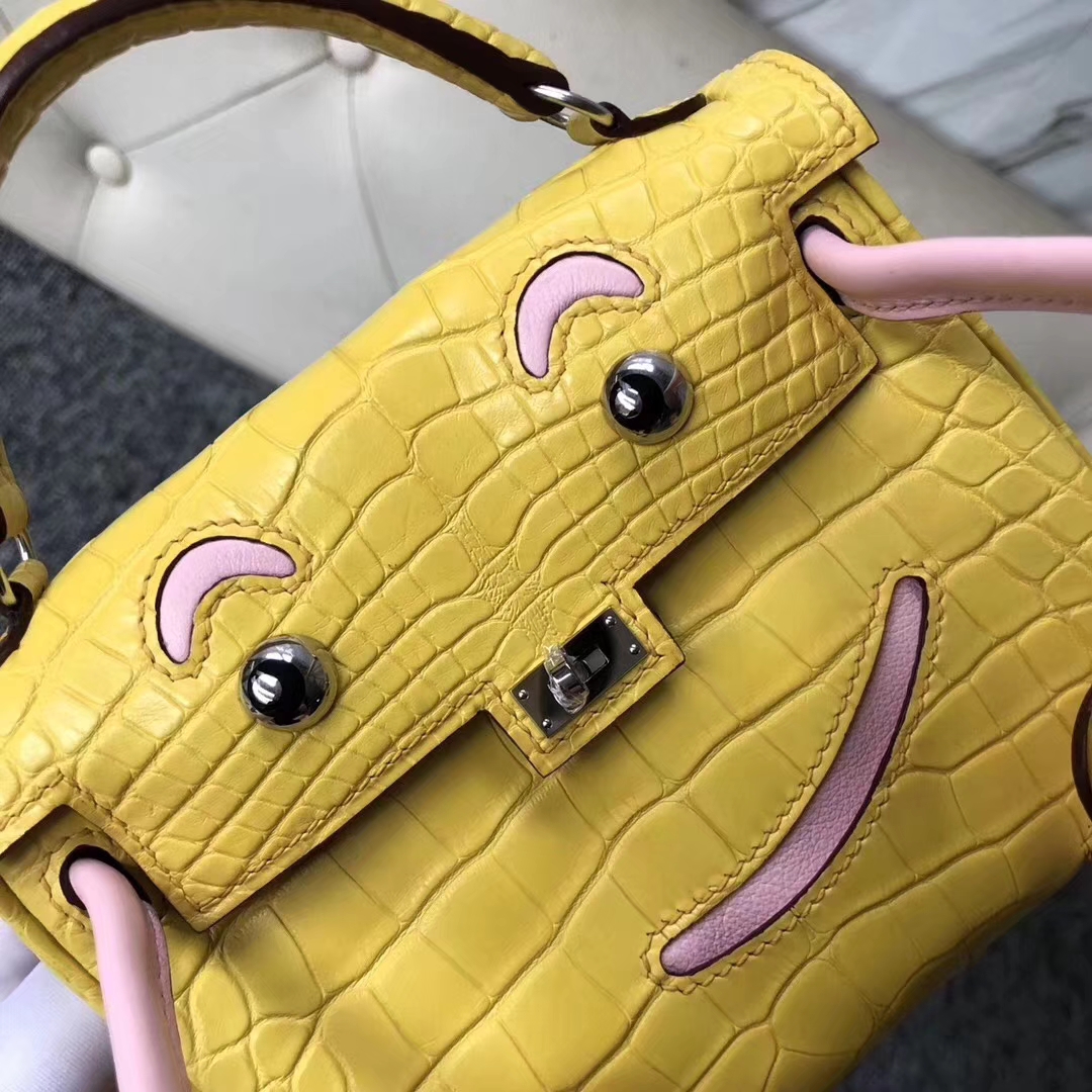 Hermès(爱马仕)Kelly doll 娃娃包 雾面鳄鱼 9R柠檬黄3Q粉 银扣 16cm 2019年7月18日 0 【鳄鱼世家】www.Eyubao.com Kelly doll 娃娃包 Kelly 凯莉包 品牌:Hermès(爱马仕);类别:Kelly doll 娃娃包;颜色:柠檬黄;材质:雾面两点尼罗鳄;等级:顶级;附件:全套包装礼盒;尺寸:16cm;功能:手提单肩包