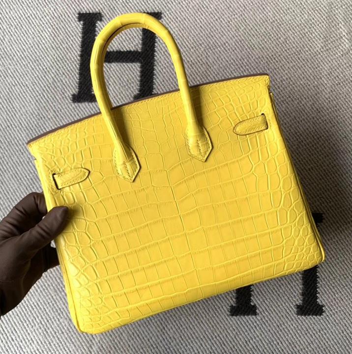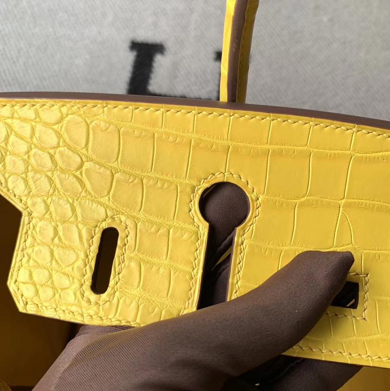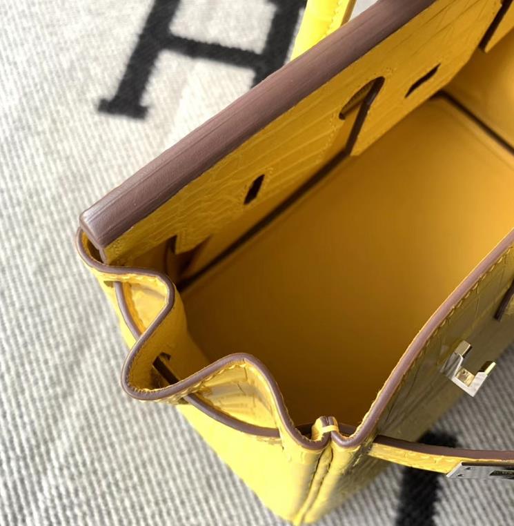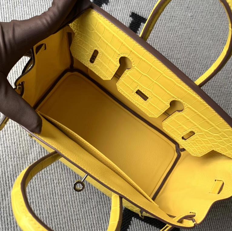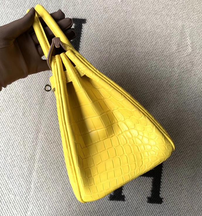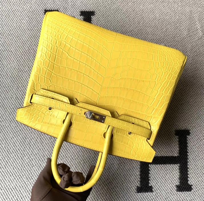 Hermès(爱马仕)Birkin铂金包 黄色 雾面鳄鱼皮 银扣 25cm 2019年7月23日 0 【鳄鱼世家】www.Eyubao.com Birkin 25 Birkin 铂金包 品牌:Hermès(爱马仕);类别:Birkin 铂金包;颜色:黄色;材质:雾面鳄鱼皮;等级:顶级;附件:全套包装礼盒;尺寸:25cm;功能:手提单肩包