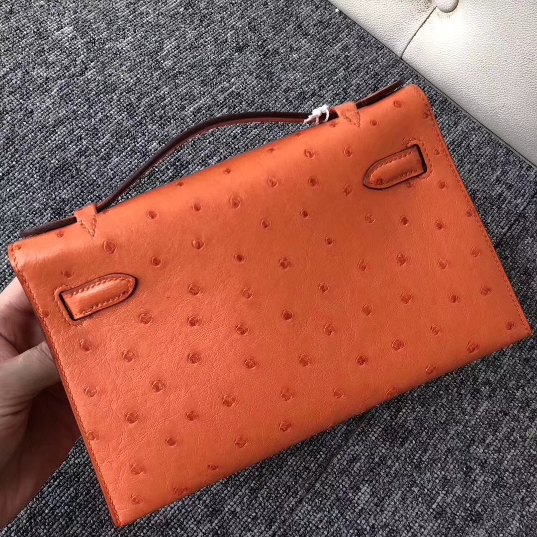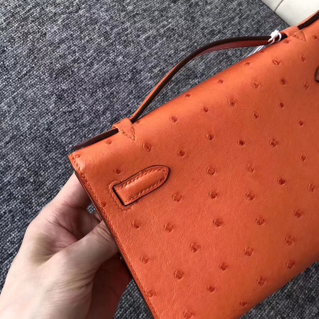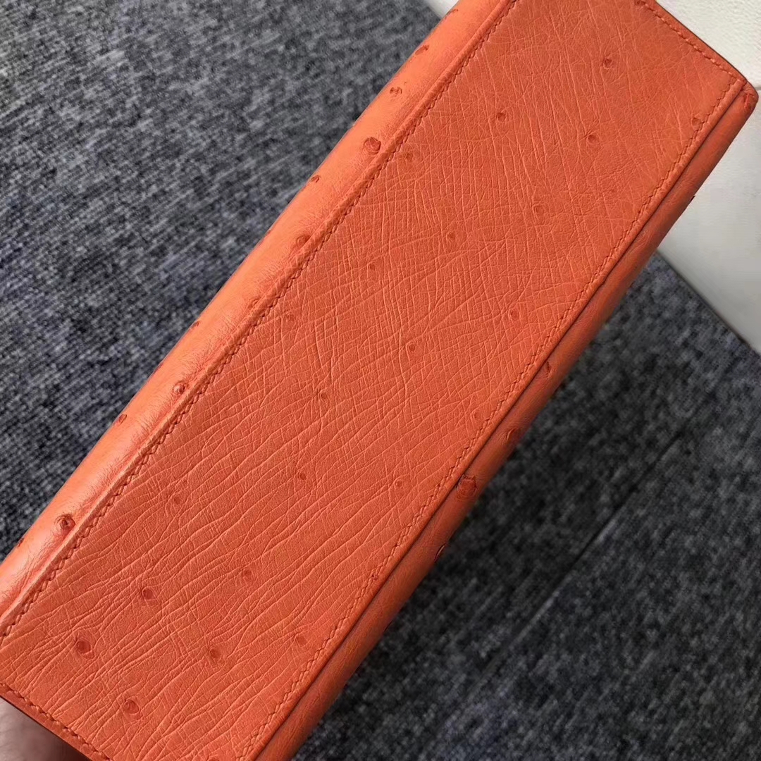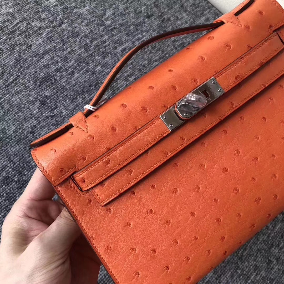 Hermès(爱马仕)Minikelly pochette Ostrich kk 鸵鸟93 橙色 orange 银扣 手拿包 晚宴包 22cm 2019年8月5日 0 【鳄鱼世家】www.Eyubao.com Mini Kelly 1 Mini Kelly 迷你凯莉 品牌:Hermès(爱马仕);类别:Mini Kelly迷你凯莉包;颜色:橙色;材质:鸵鸟纹;等级:顶级;附件:全套包装礼盒;尺寸:22cm;功能:手提单肩包