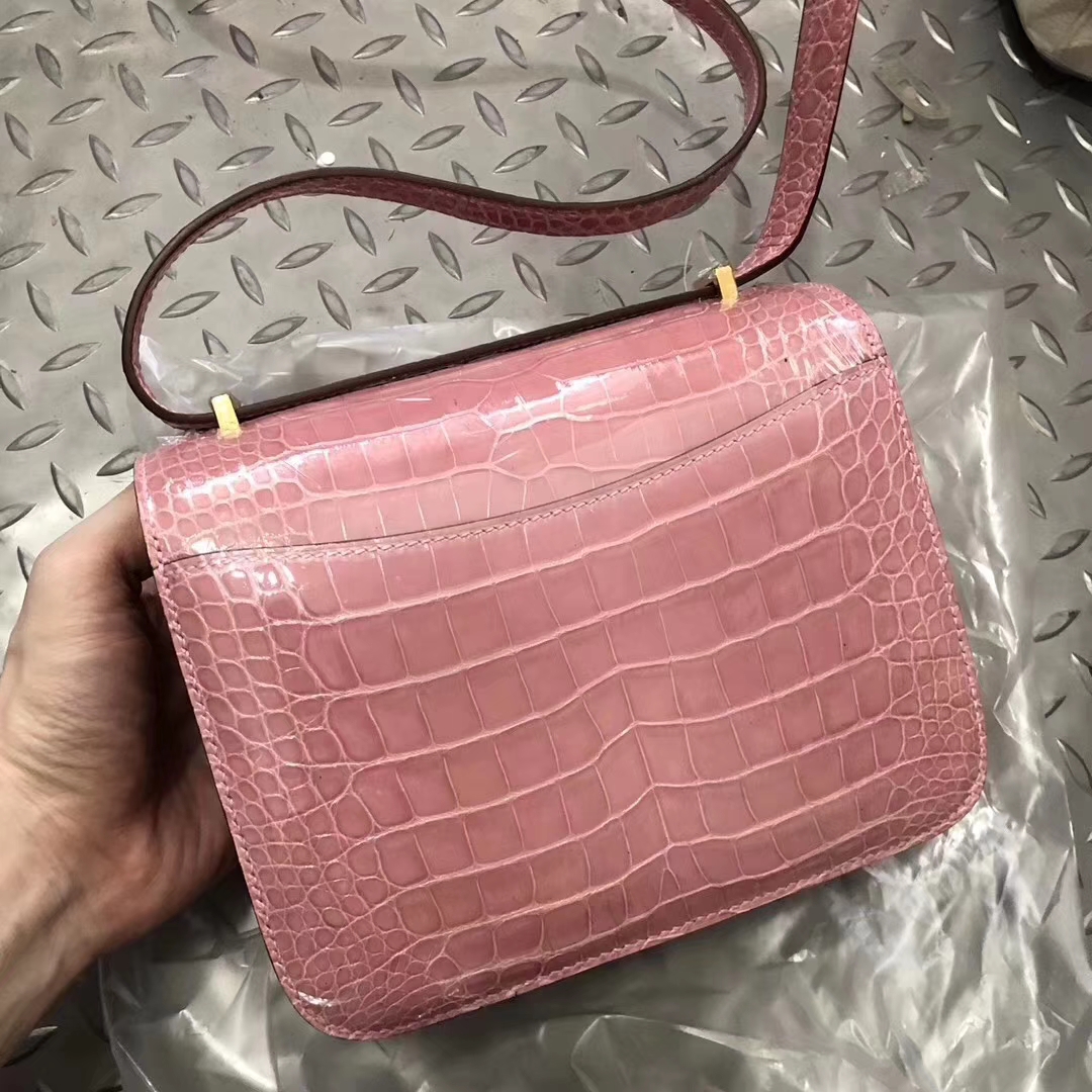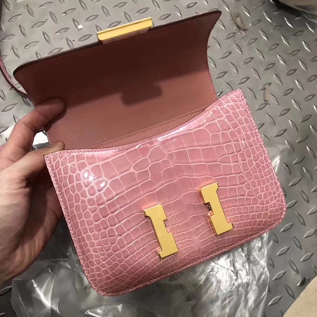 Hermès(爱马仕)Constance空姐包 Alligator shiny 亮面鳄鱼 1Q奶昔粉 金扣 18cm 2019年8月5日 0 【鳄鱼世家】www.Eyubao.com Constance 18 Constance 空姐包 品牌:Hermès(爱马仕);类别:Constance 空姐包;颜色:奶昔粉;材质:亮面鳄鱼;等级:顶级;附件:全套包装礼盒;尺寸:18cm;功能:单肩背包